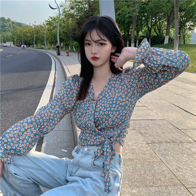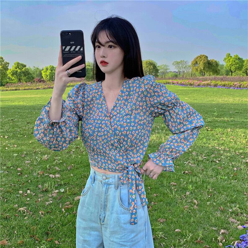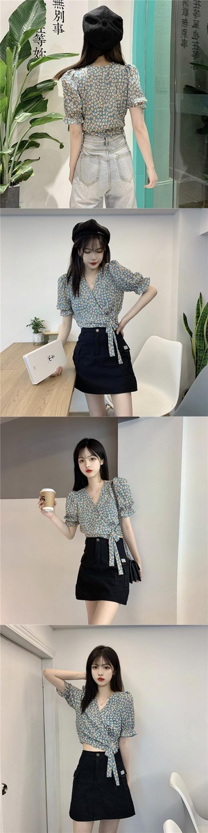 スリーブシフォンフローラルブラウス レディースサマーショートハイウェストシャツ 夏物 花柄 YY-ファッション56997281735