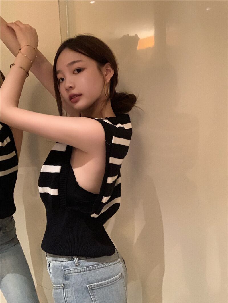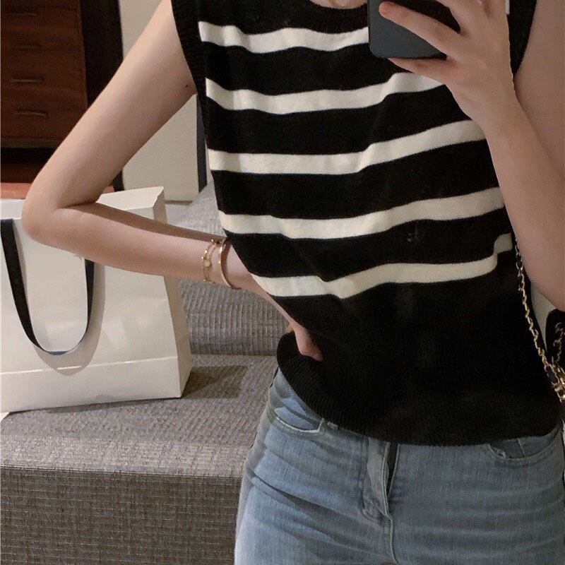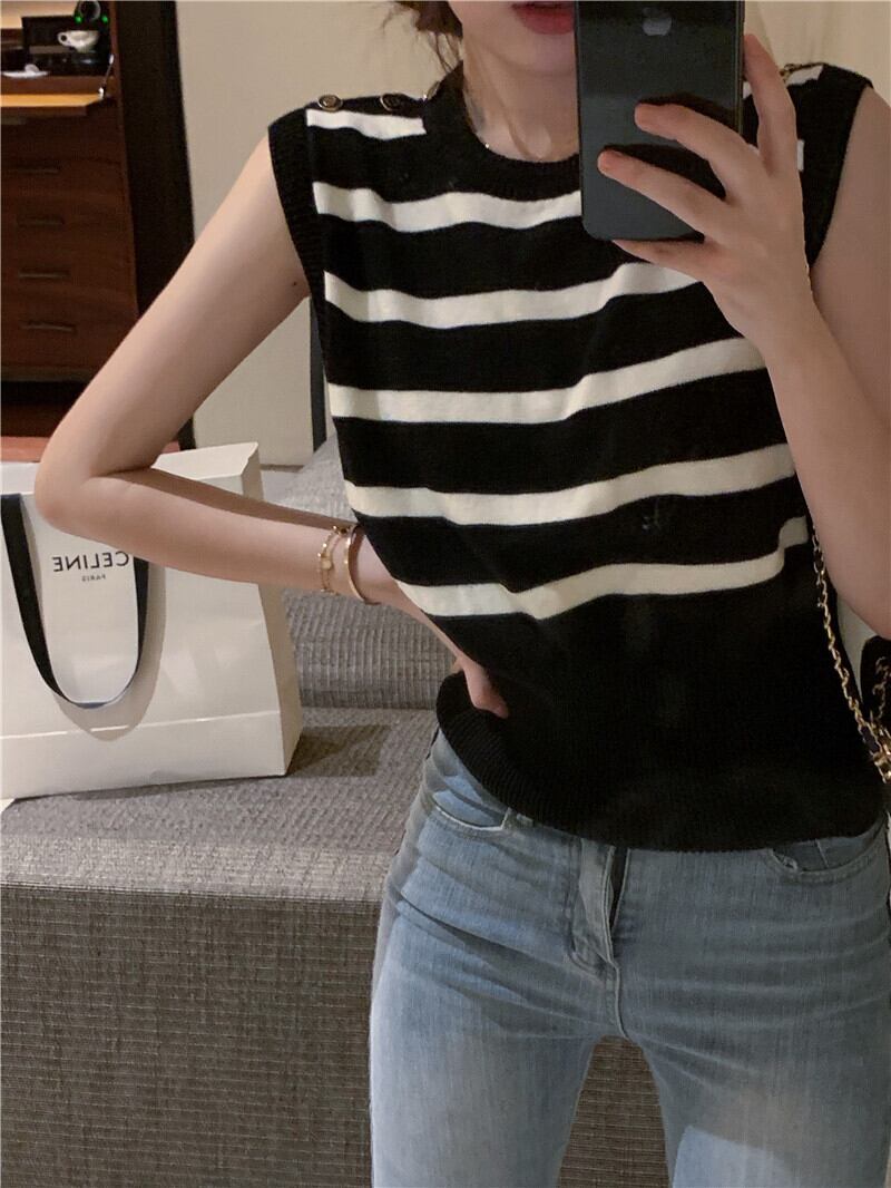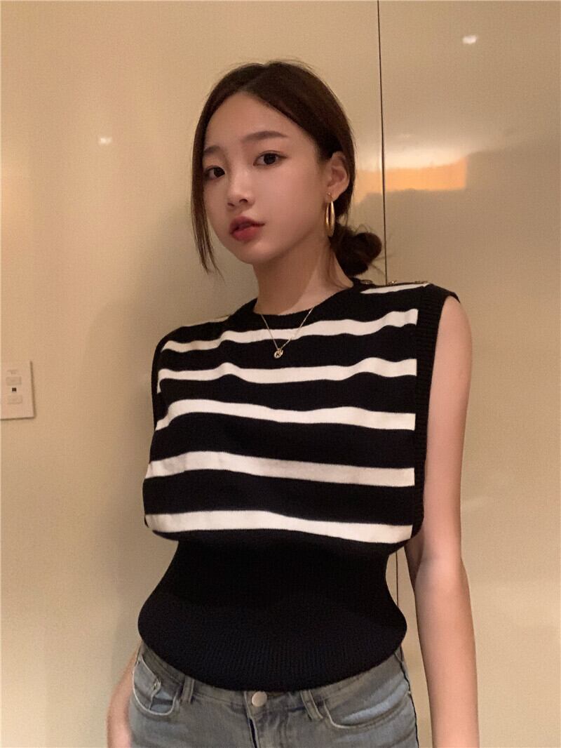 ブラックホワイトストライプサマースタンダードバックルウェストノースリーブニットトップス レトロ 夏物 YY-ファッション23783607258