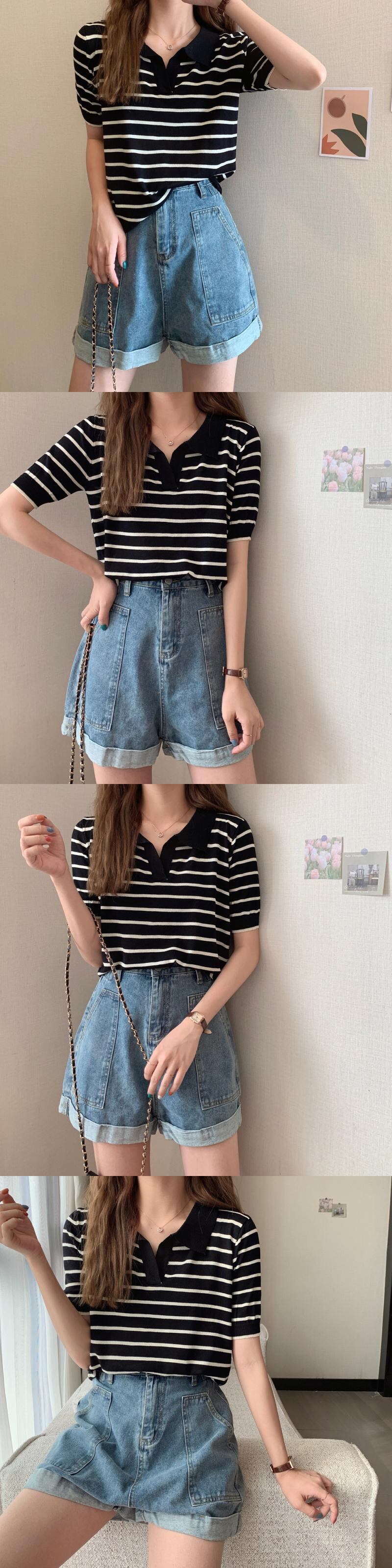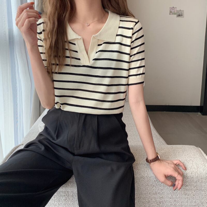 ニットセーター レディースサマー薄手VネックストライプTシャツ ルーズスリムトップス 夏物 YY-ファッション40509191012