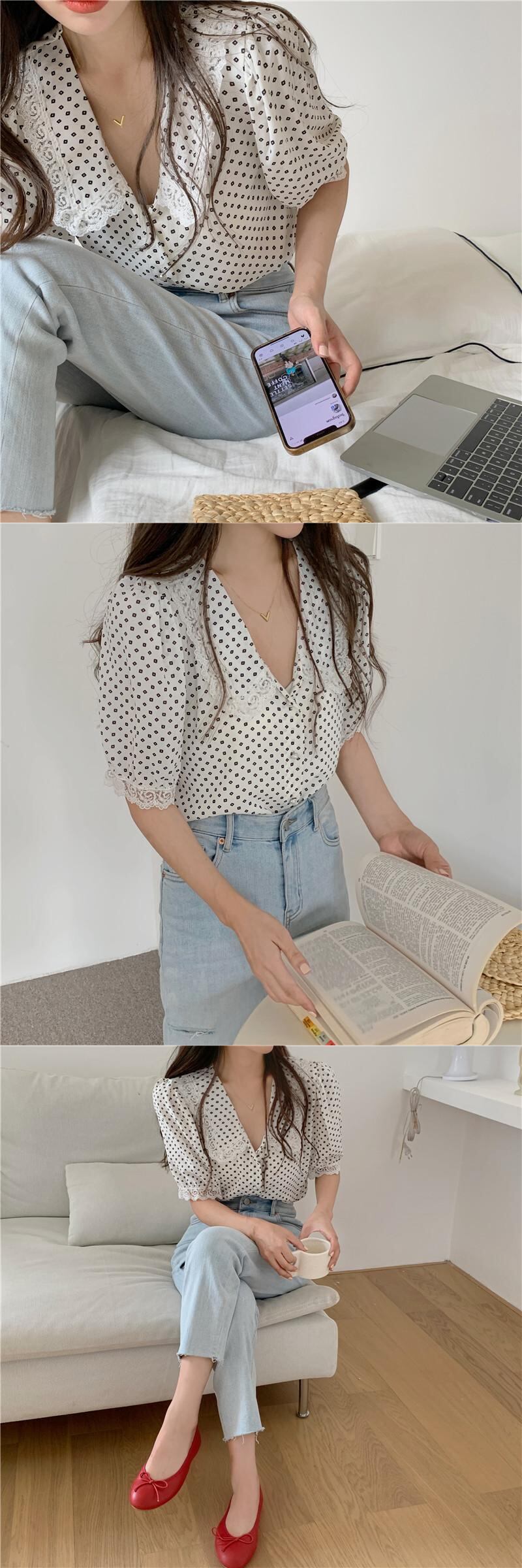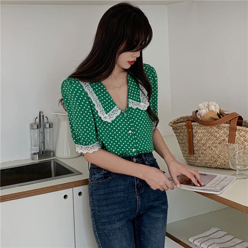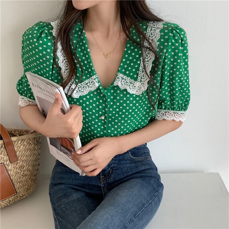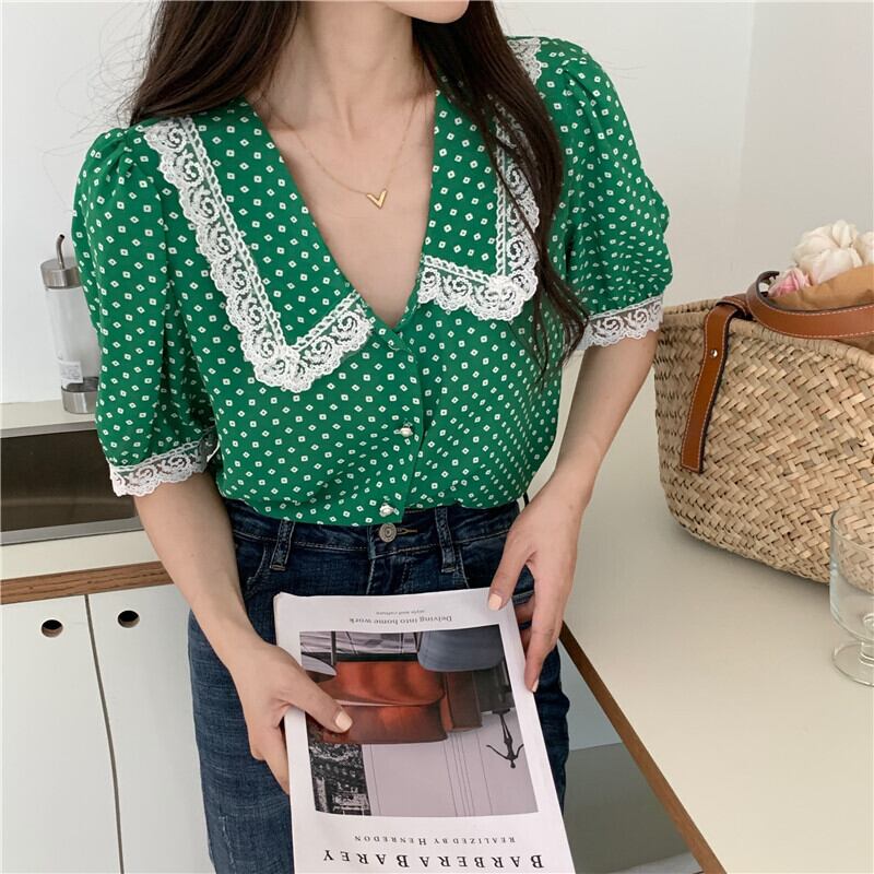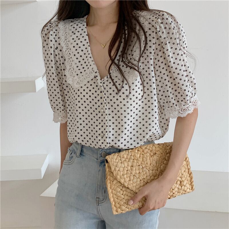 サマースタイルスタンダードVネックレーススリーブシフォンシャツ レディース レトロ 夏物 YY-ファッション18549384361