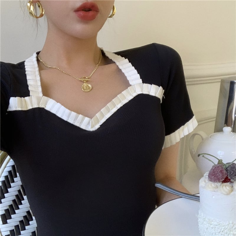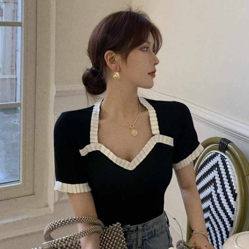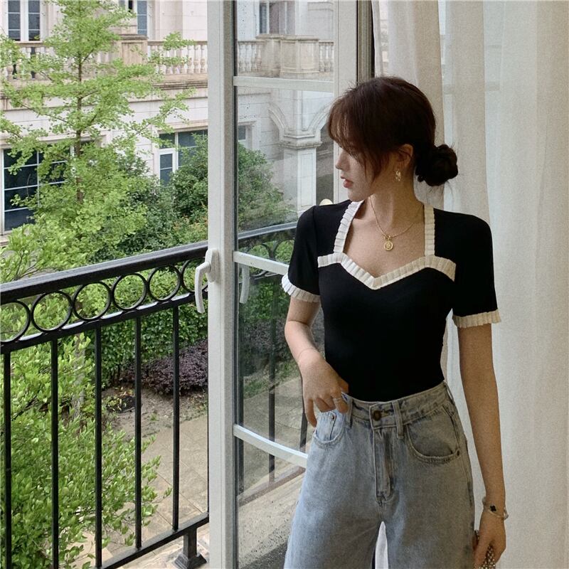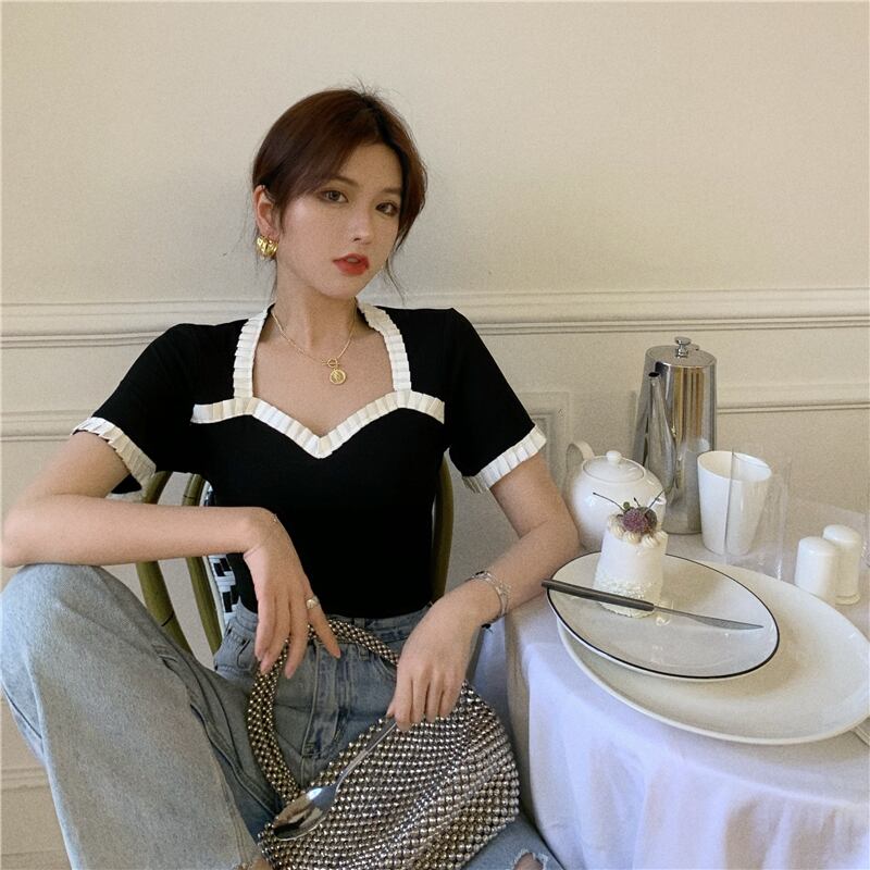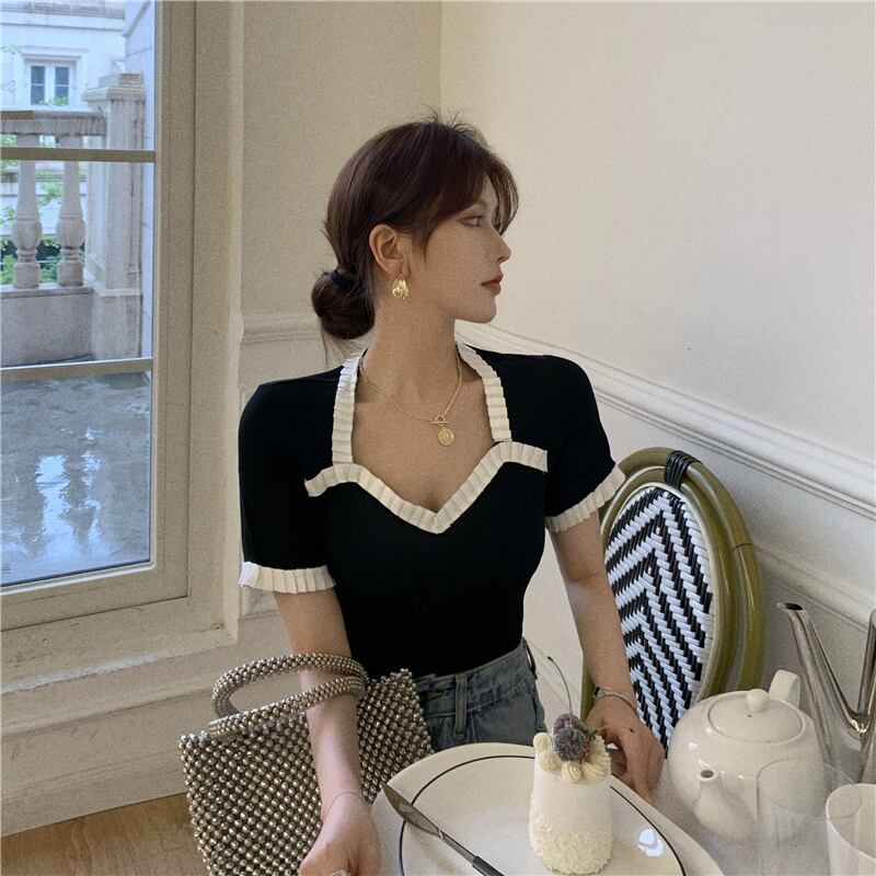 Tシャツ シャツ レディースサマーVネックスリムブラック 夏物 YY-ファッション76359193373