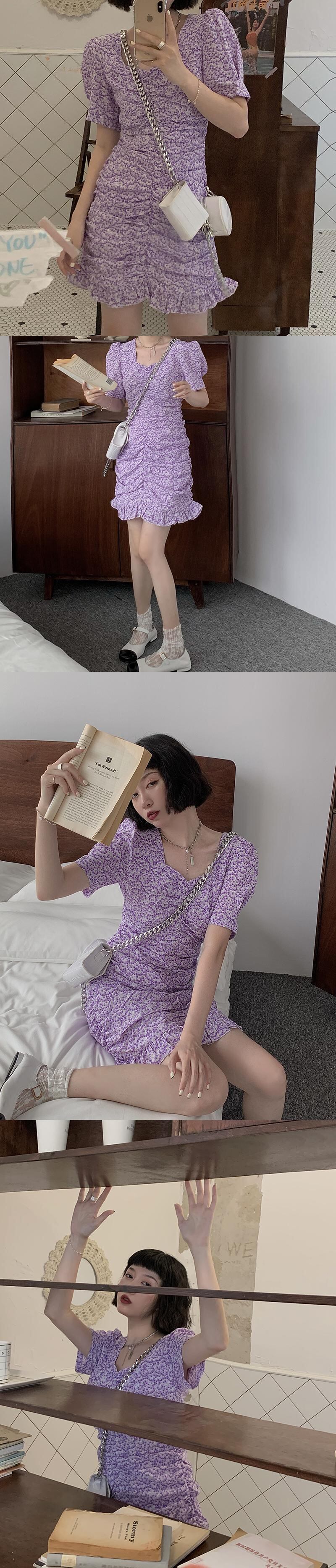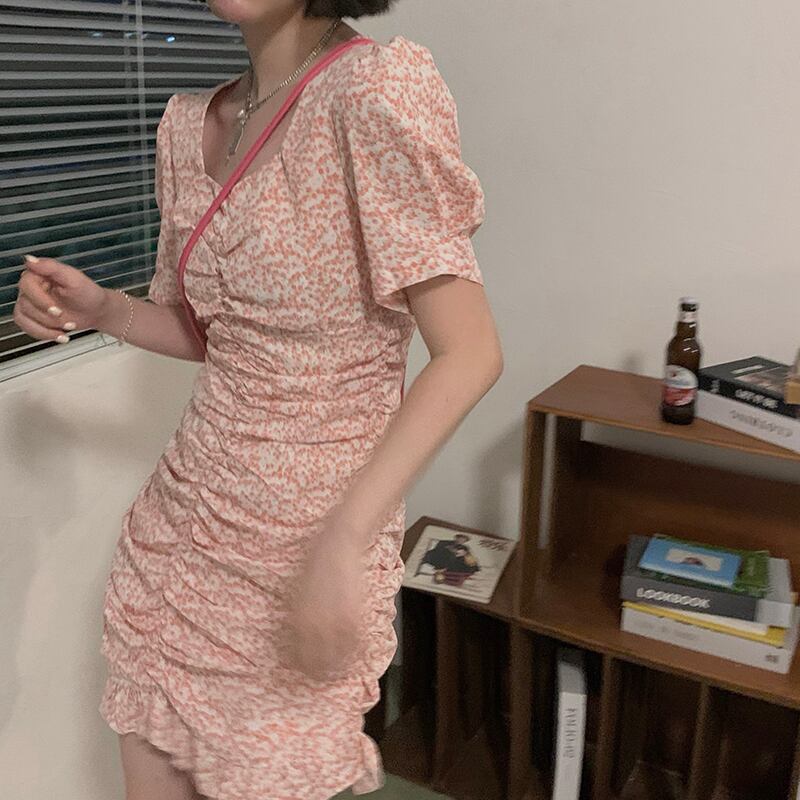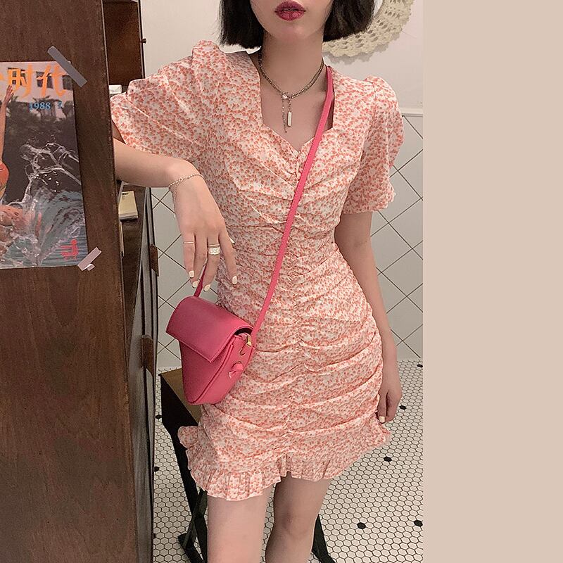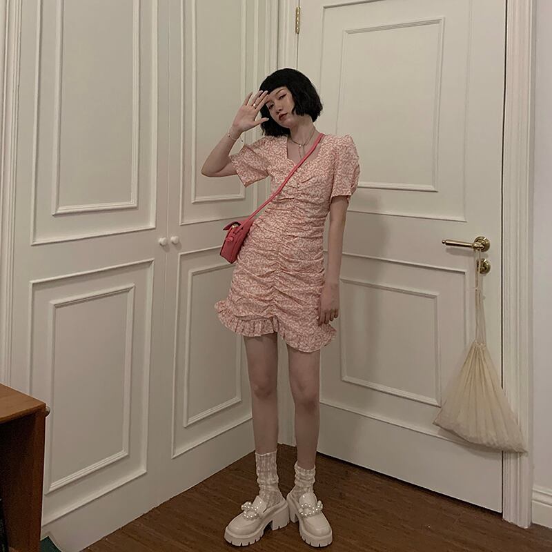 ブルー薄手スカート Vネックフローラルドレス サマースリム 夏物 花柄 YY-ファッション29709154506