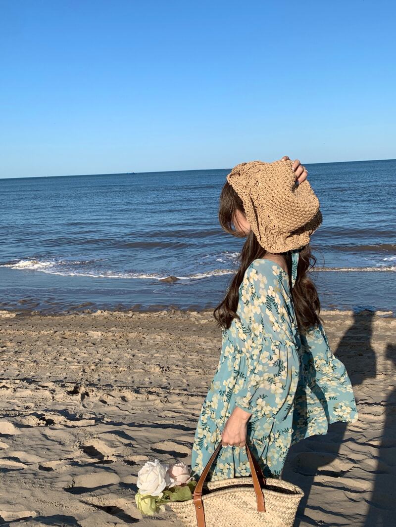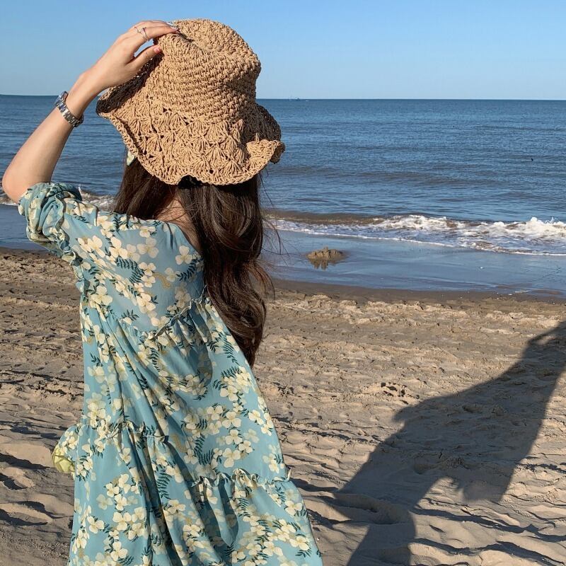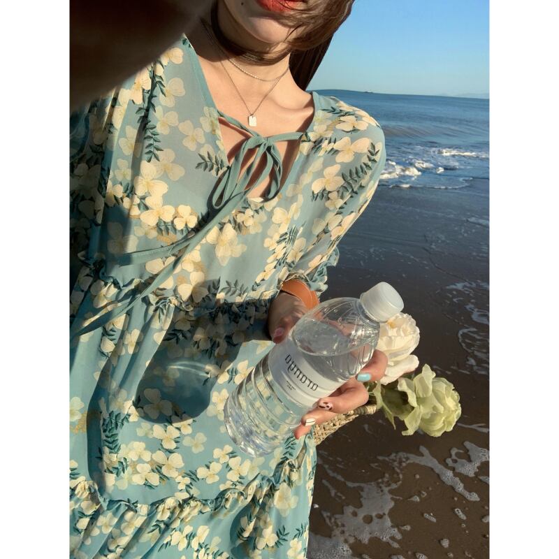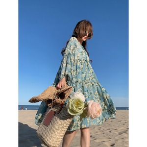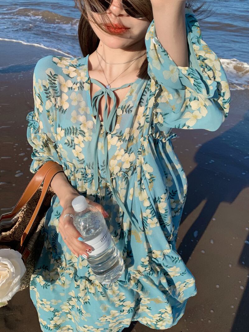 フローラルドレス サマー薄手スタンダードVネックルーズスカート レトロ 大人ガーリー スウィート キュート カジュアル 夏物 花柄 YY-ファッション8968311626