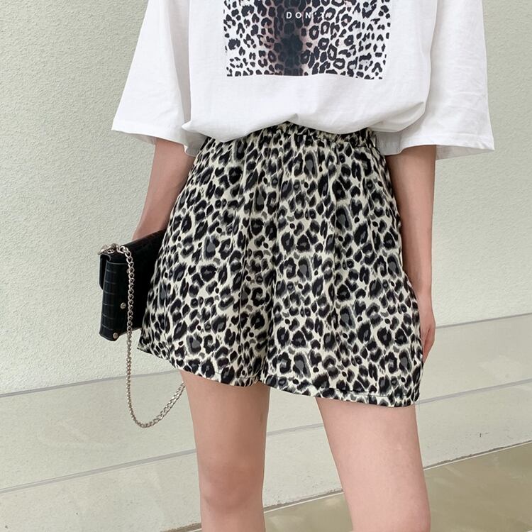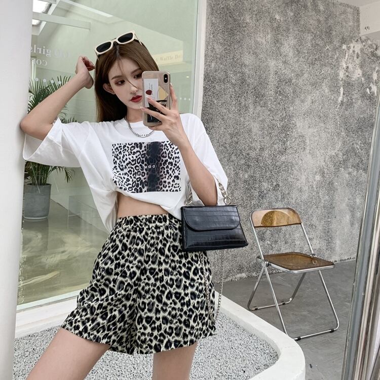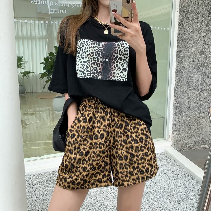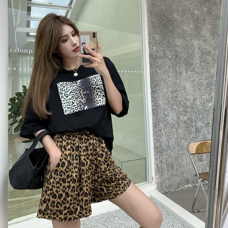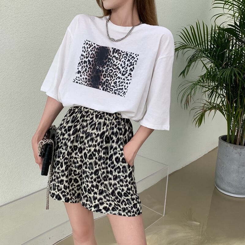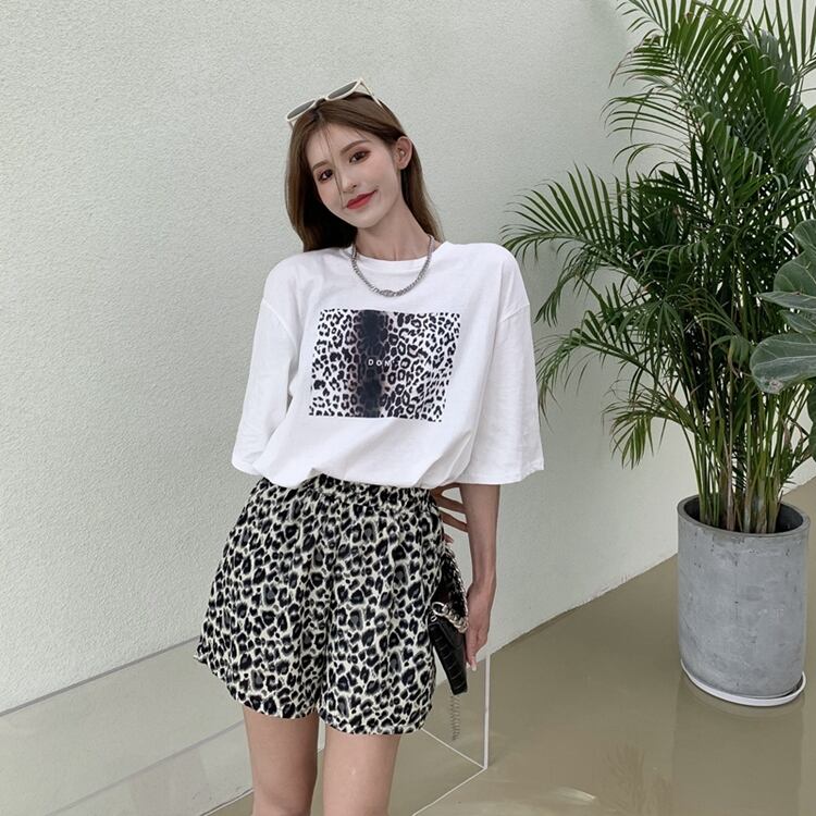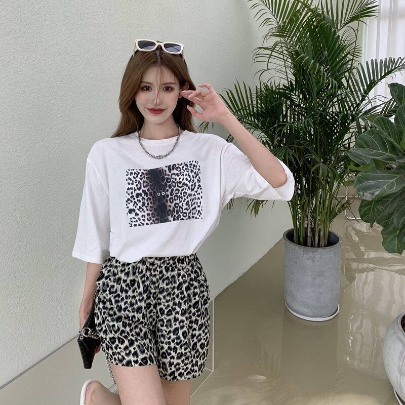 色:白いTシャツ,黒いTシャツ,グレーレオパードショーツ,黄色のヒョウショーツ