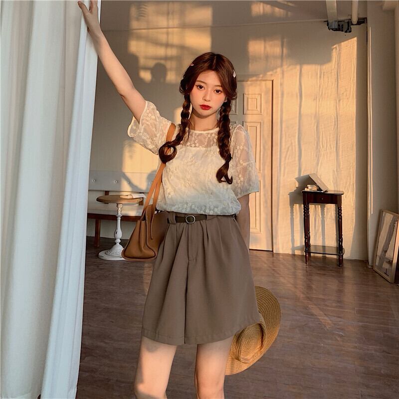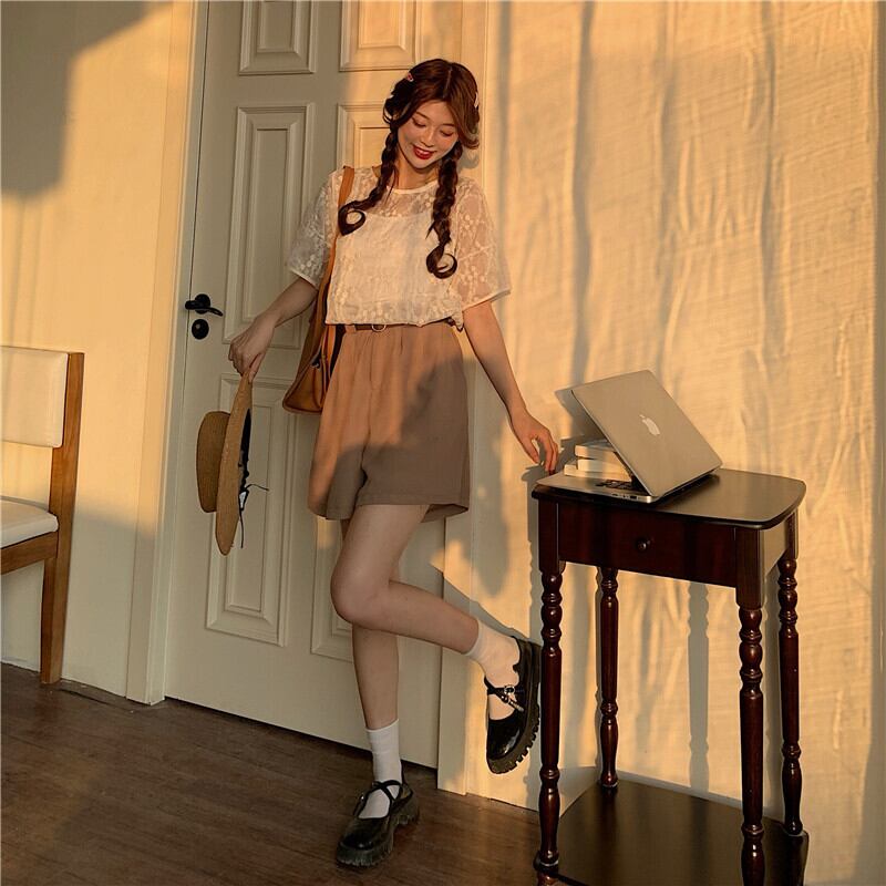 ソリッド カラー刺繍レーストップス シャツ カジュアルハイウェストパンツ ソリッドカラー YY-ファッション21290763009