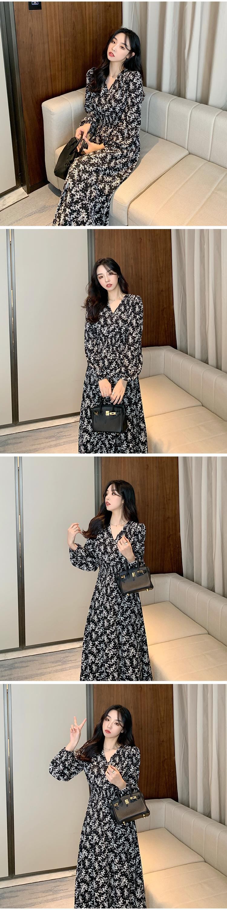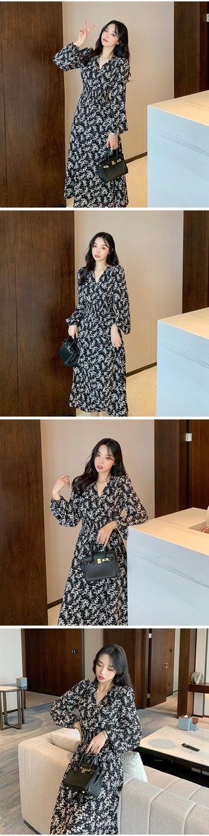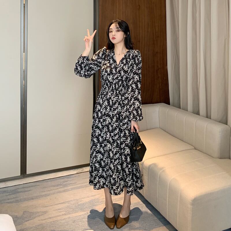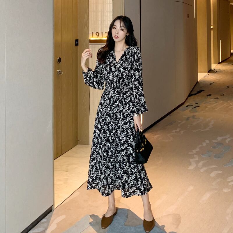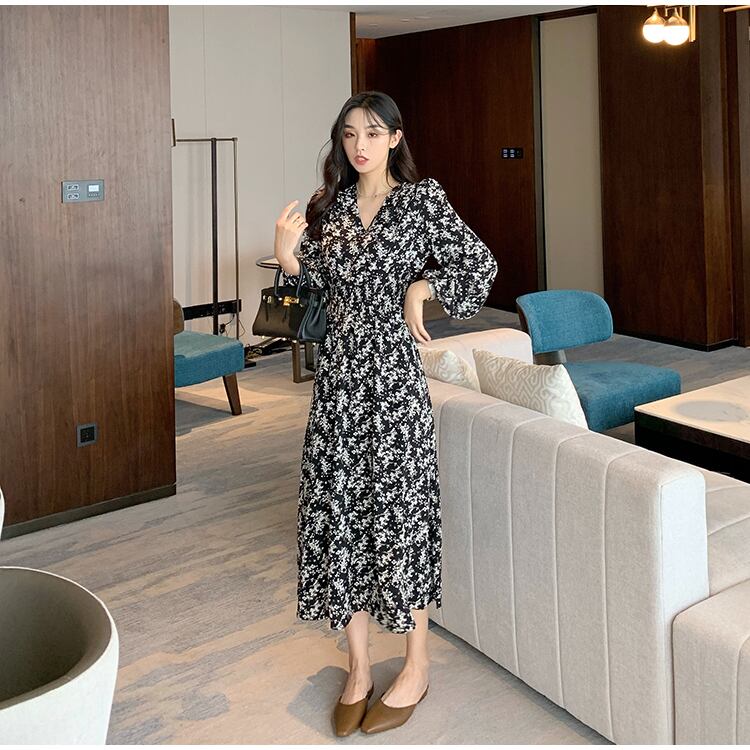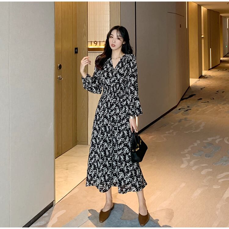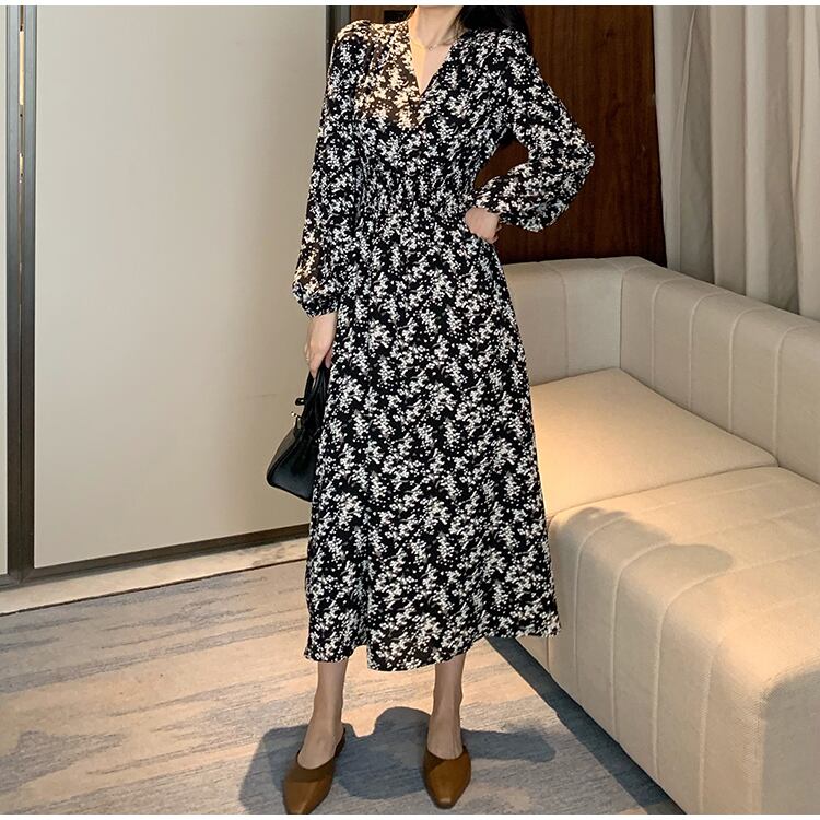 スタンダード薄手オータムシフォンフローラルドレス レトロ 秋物 花柄 スカート YY-ファッション12400564403