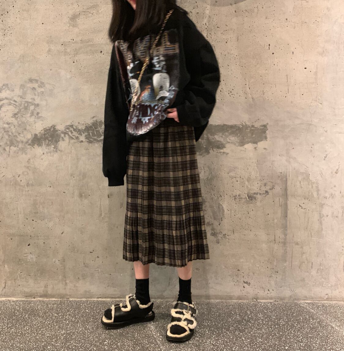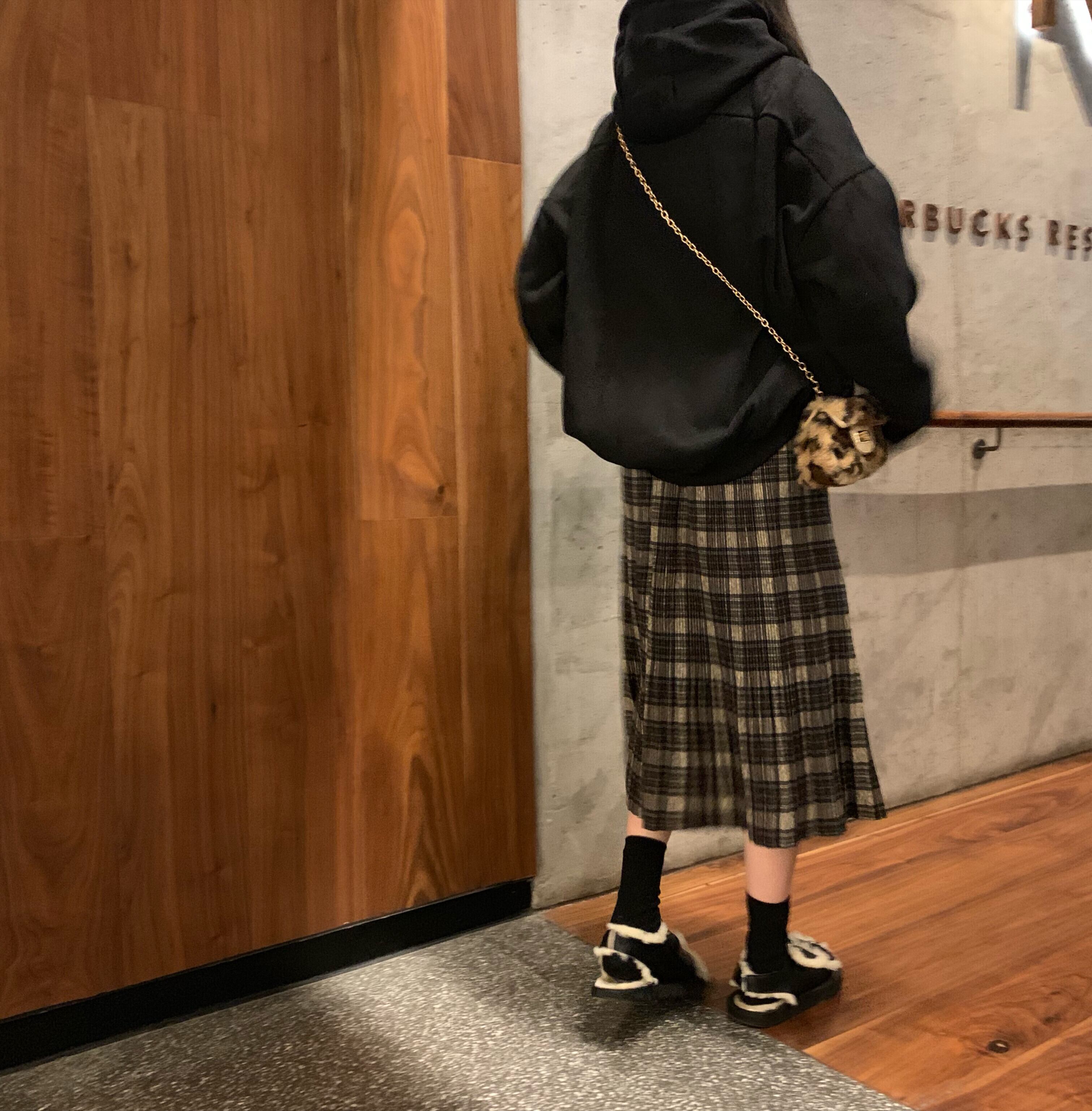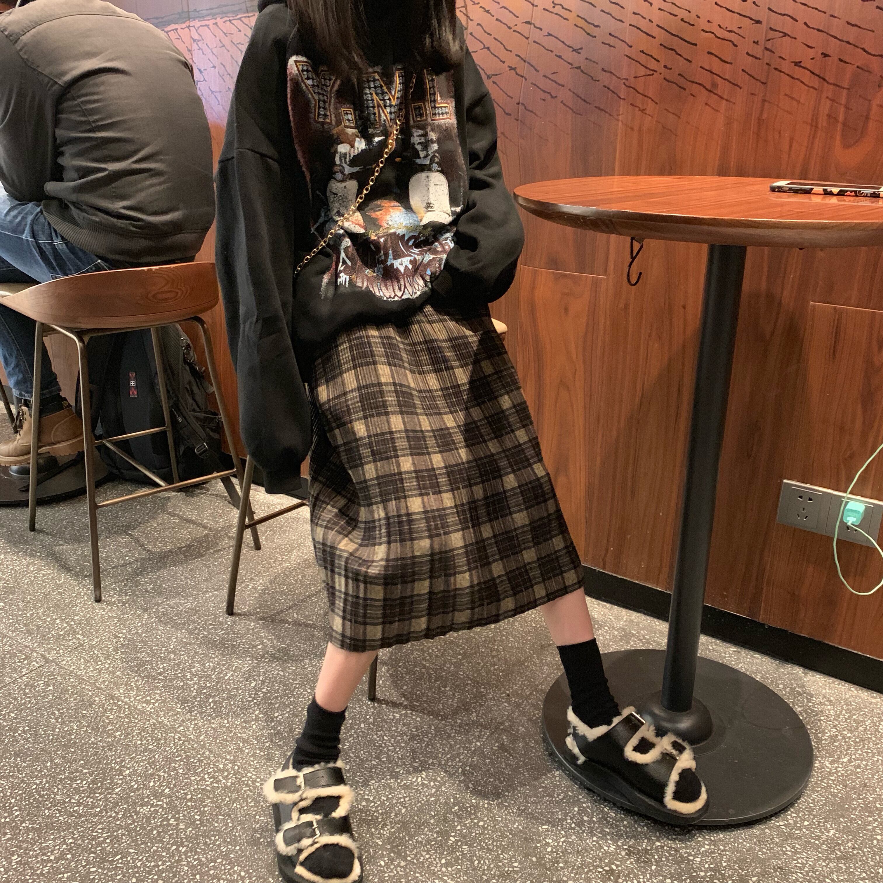 オータムルーズプリーツスタンダードスカート 格子柄ハイウェストウェスト レトロ 秋物 YY-ファッション90926147463