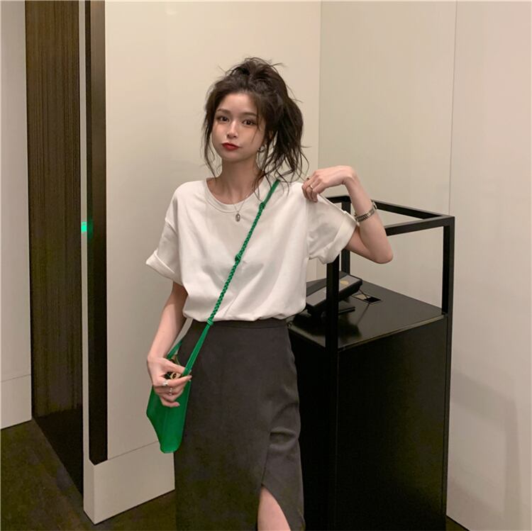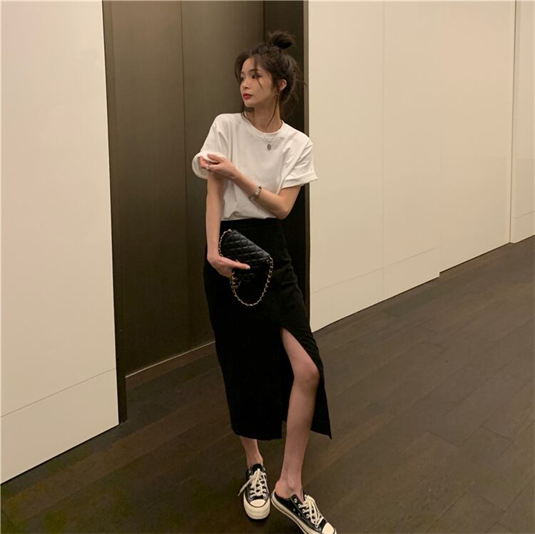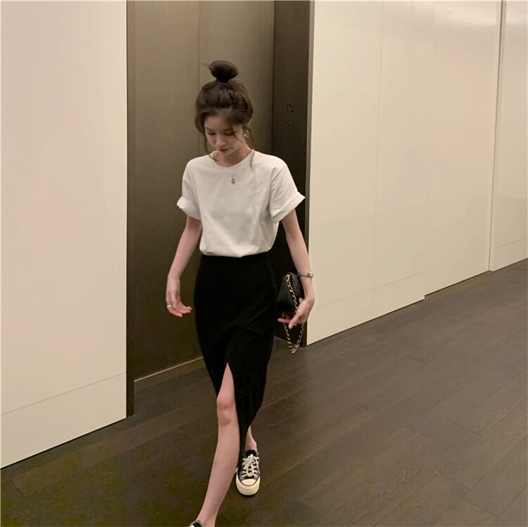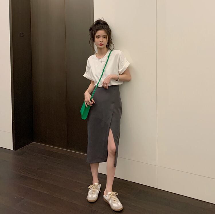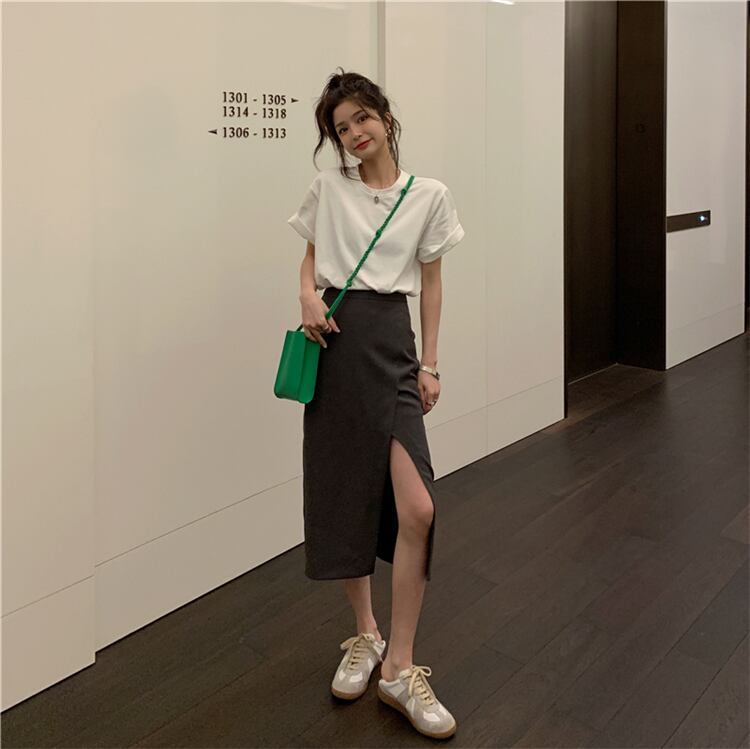 色:白いTシャツ,ダークグレーのスカート,黒スカート