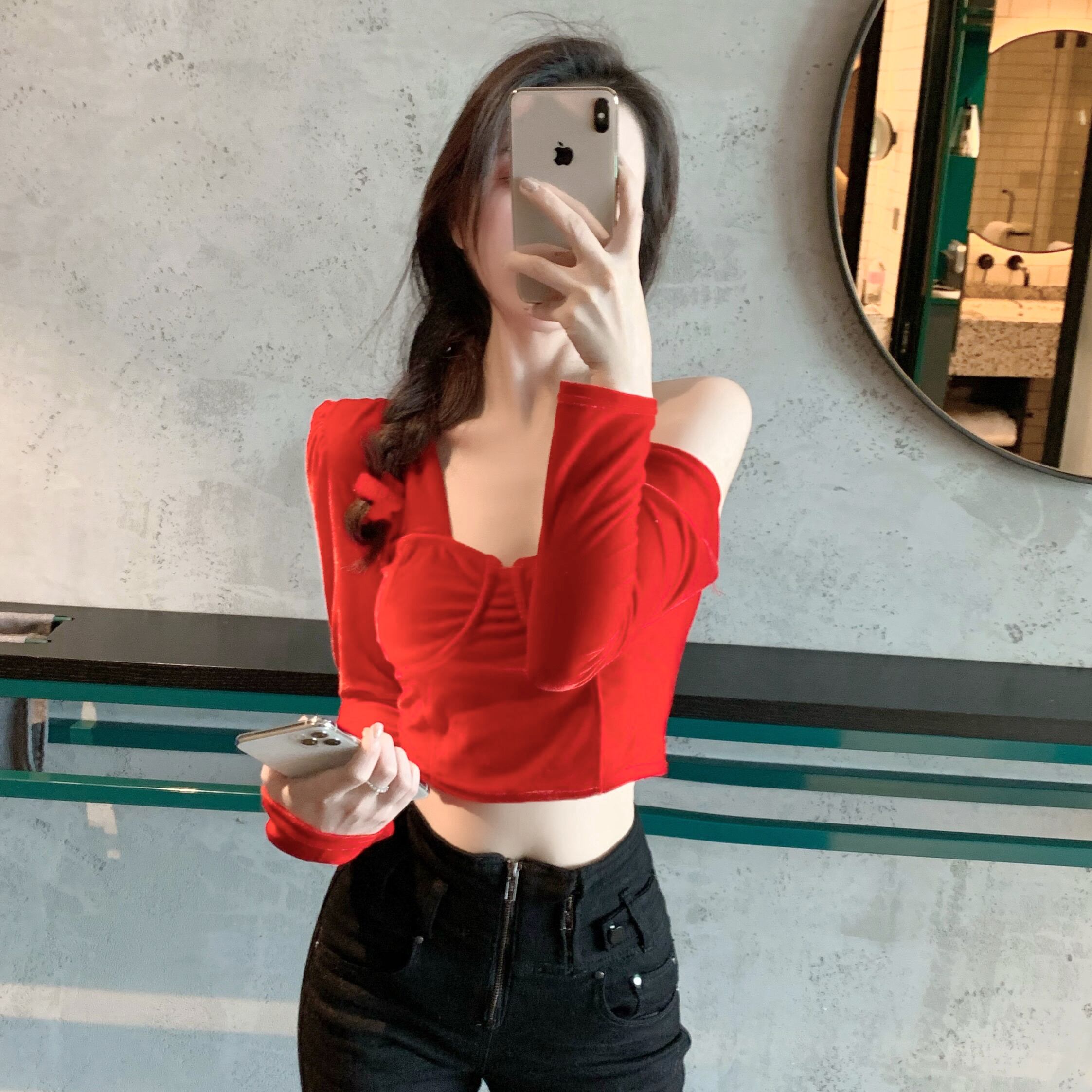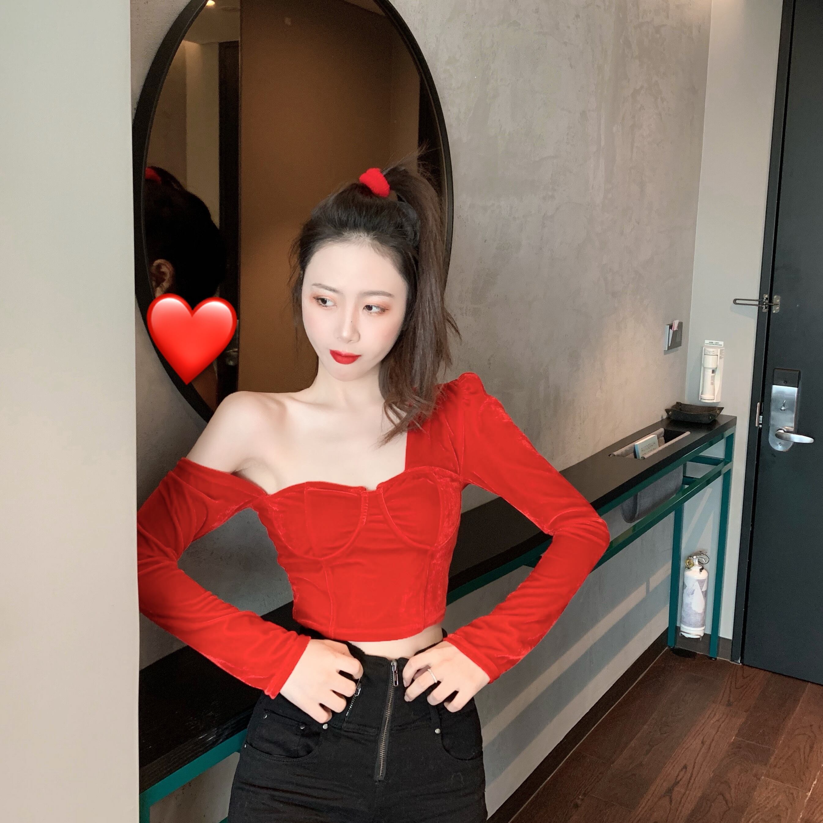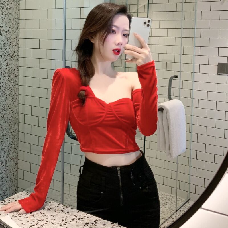 オータムベルベットトップス ショートシャツ 長袖スリーブスリムTシャツ ロング 秋物 オフショルダー YY-ファッション67077458997