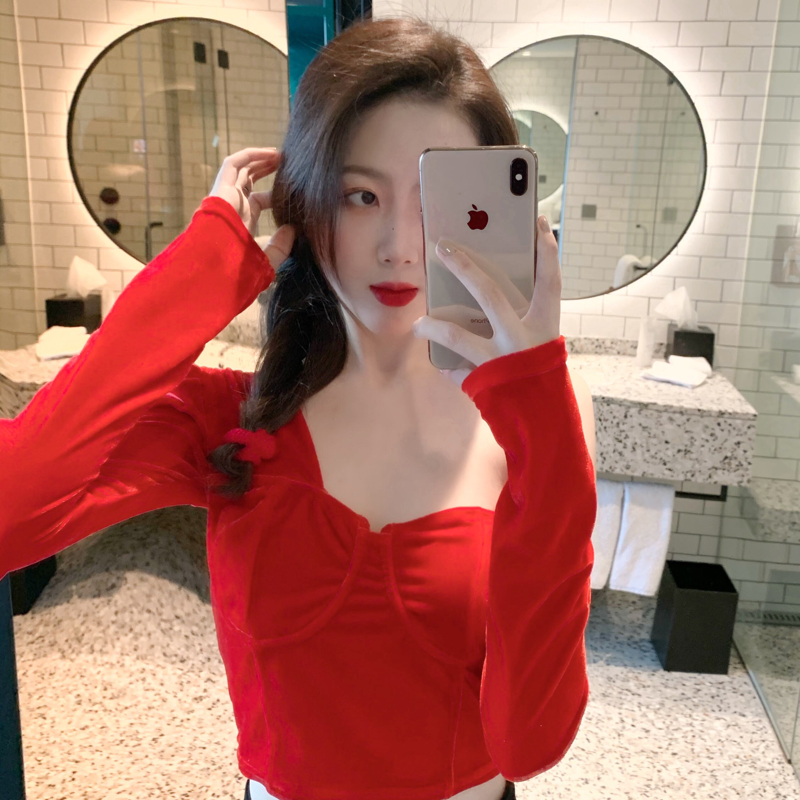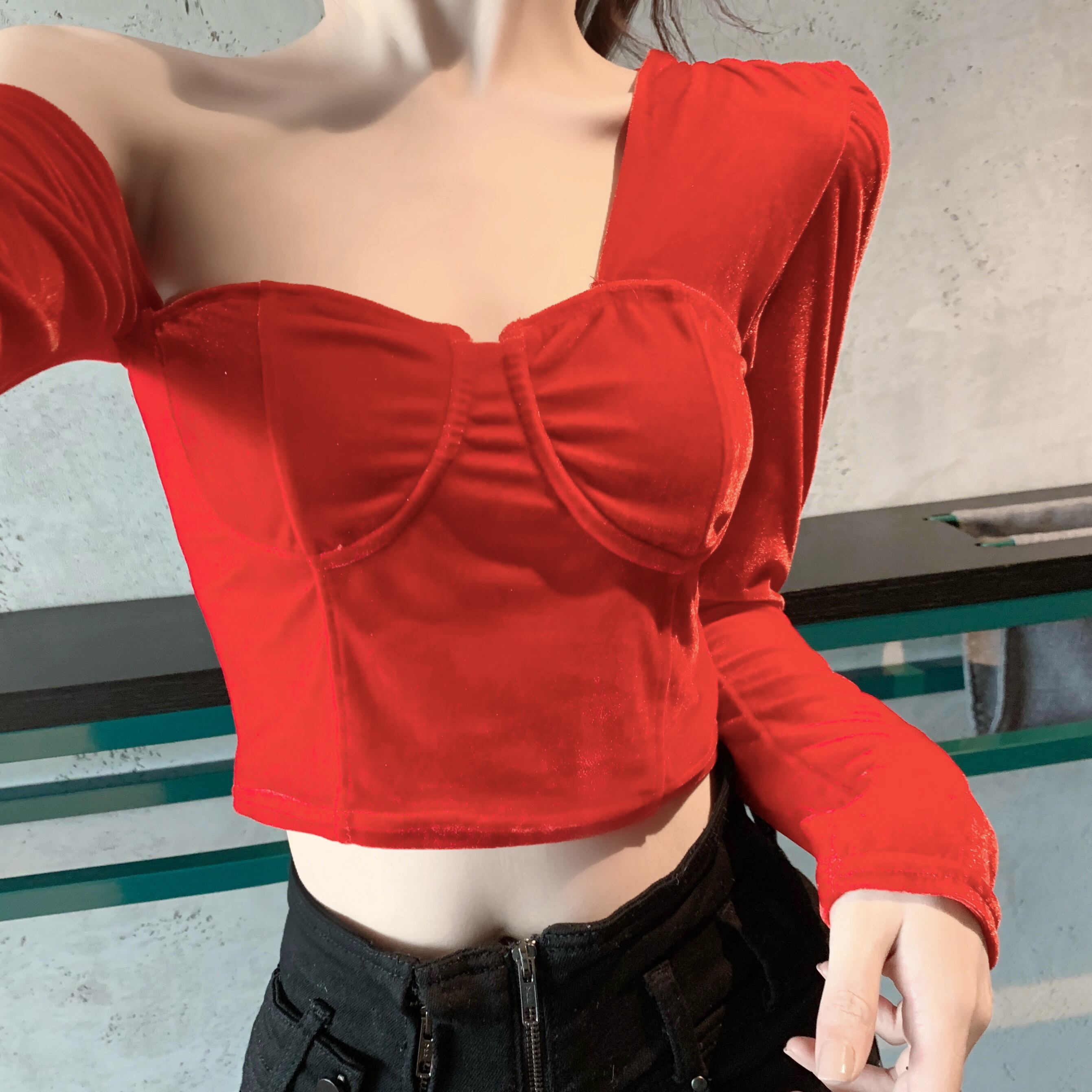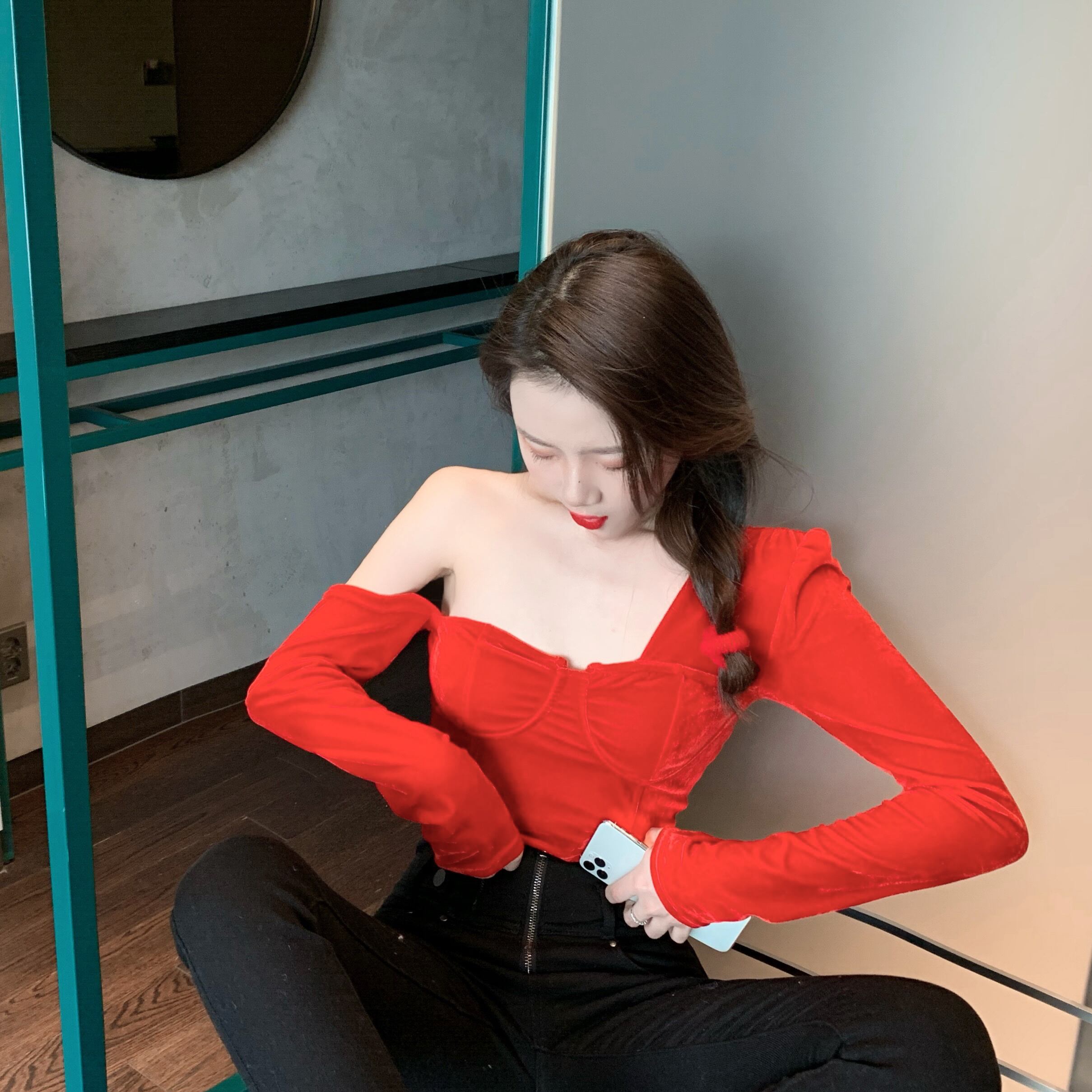 オータムベルベットトップス ショートシャツ 長袖スリーブスリムTシャツ ロング 秋物 オフショルダー YY-ファッション67077458997