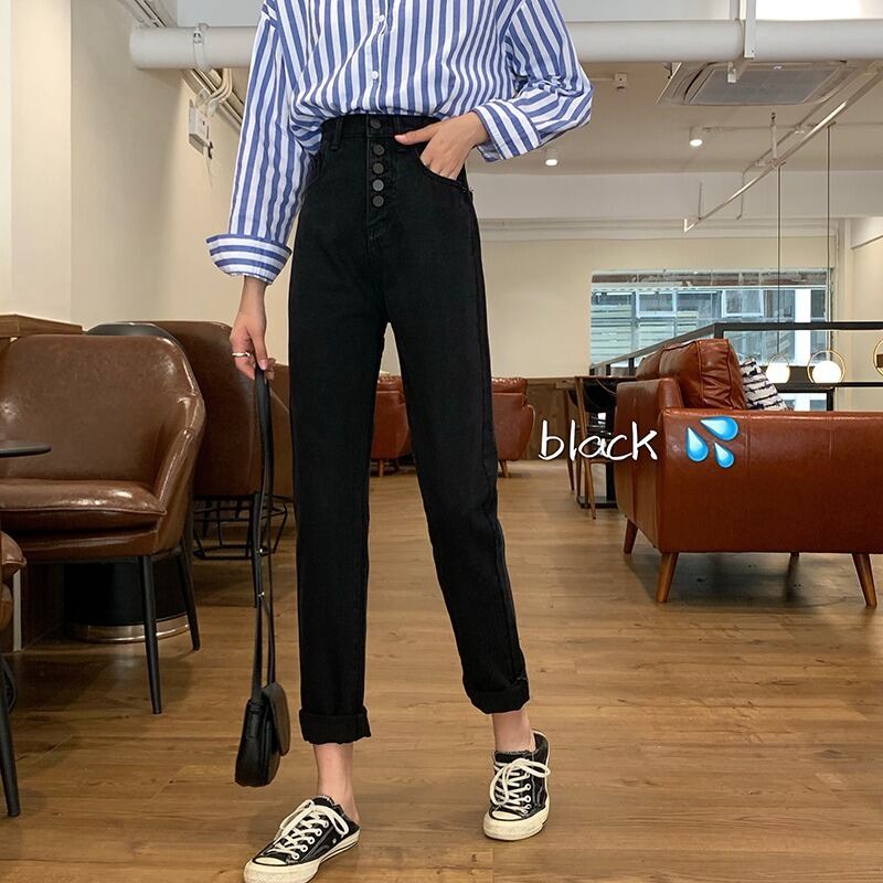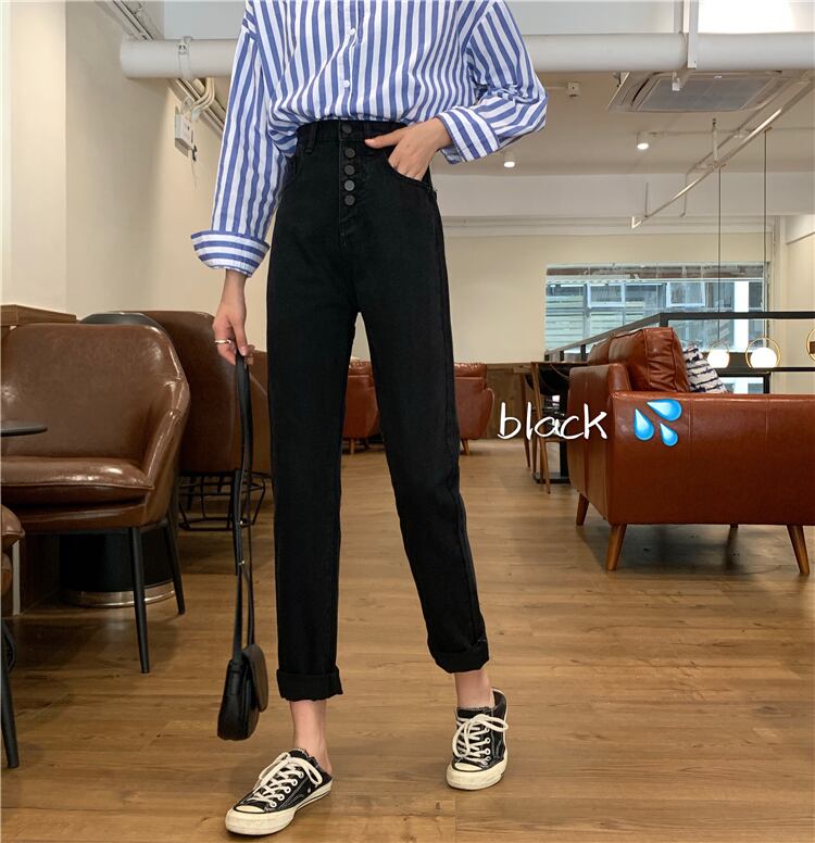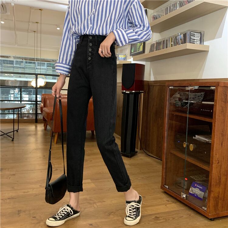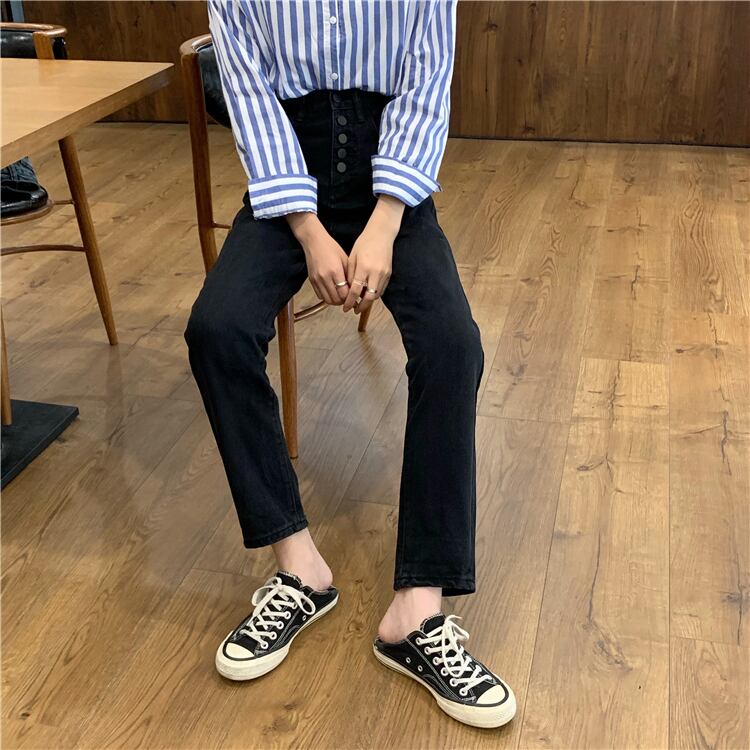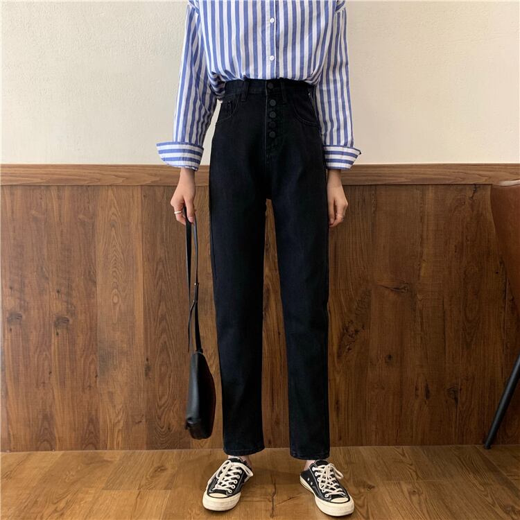 スプリングオータムスタンダードハイウェストウェストスリムブラックパンツ ジーンズ レディース レトロ 春物 秋物 YY-ファッション27223822390