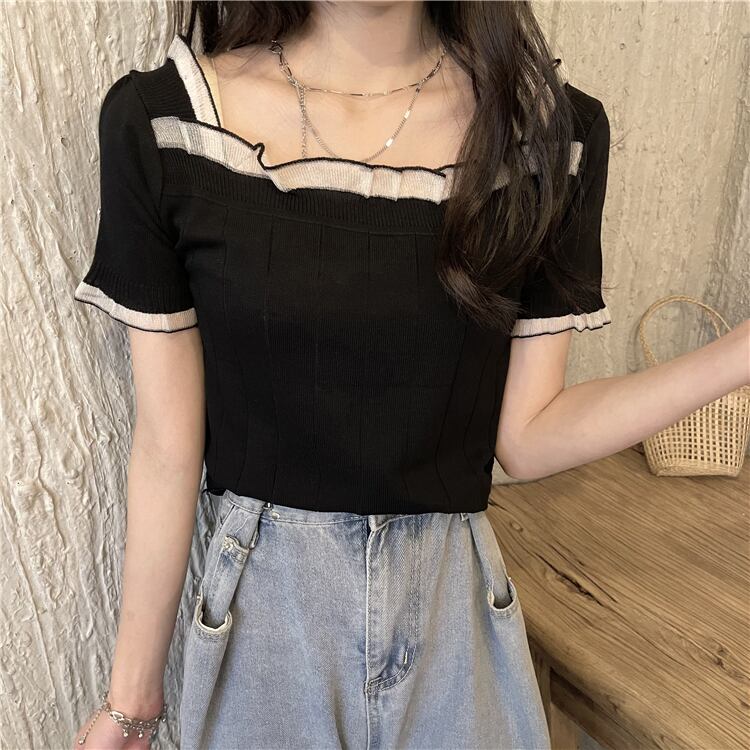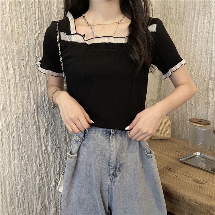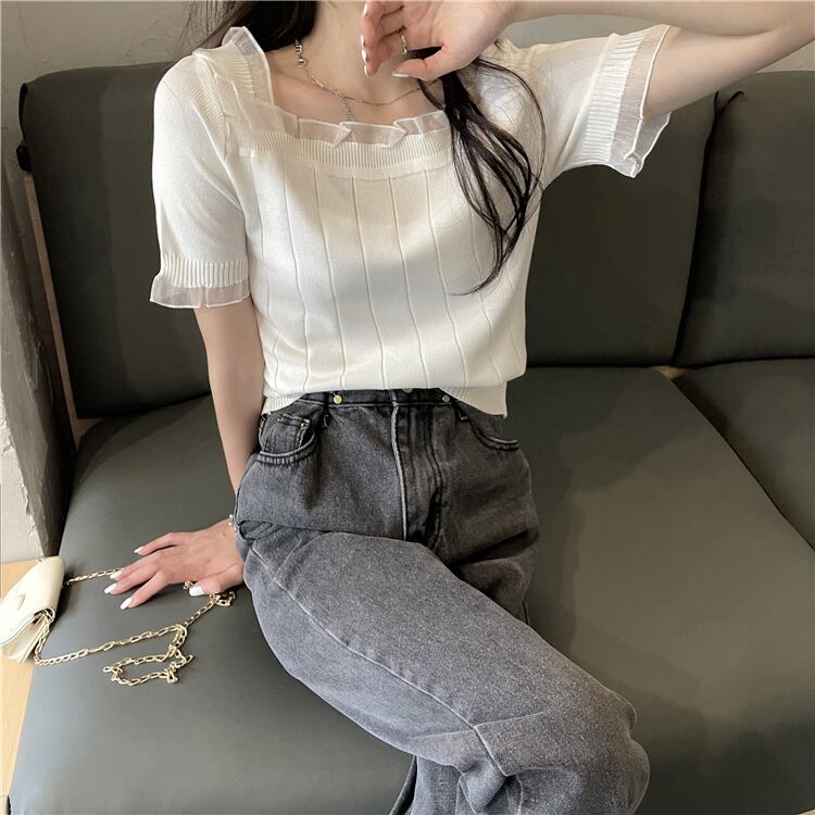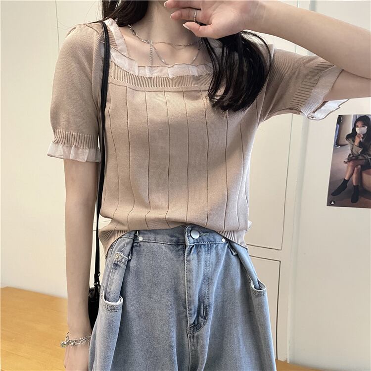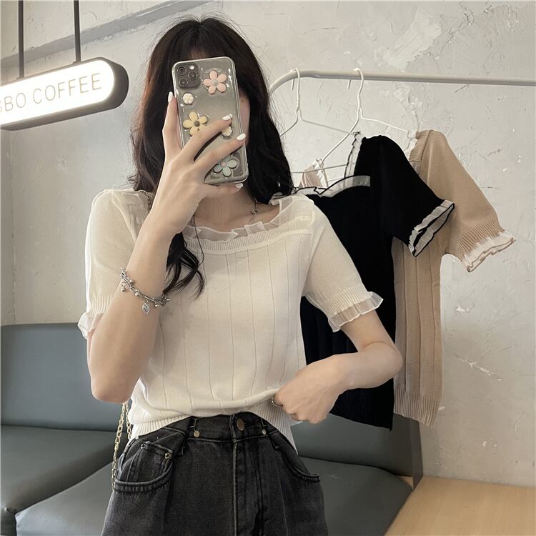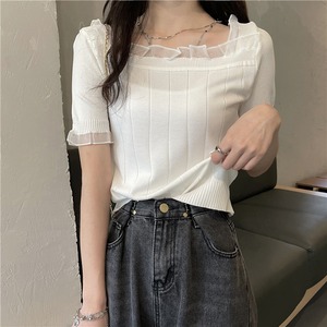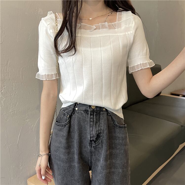 レースショートセーター レディースサマー薄手ルーズホワイトトップス 夏物 シルク スクウェア ステッチ YY-ファッション60075694739