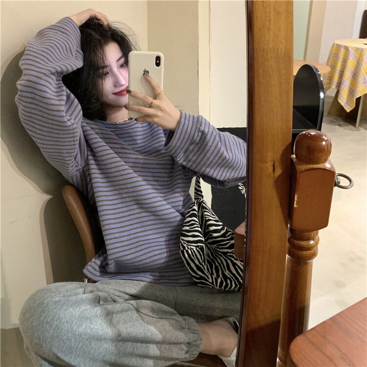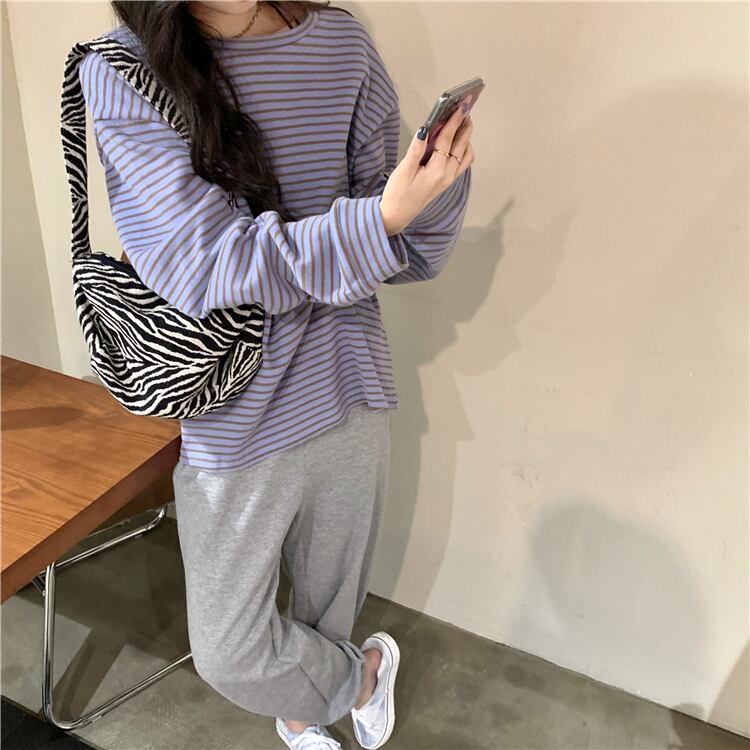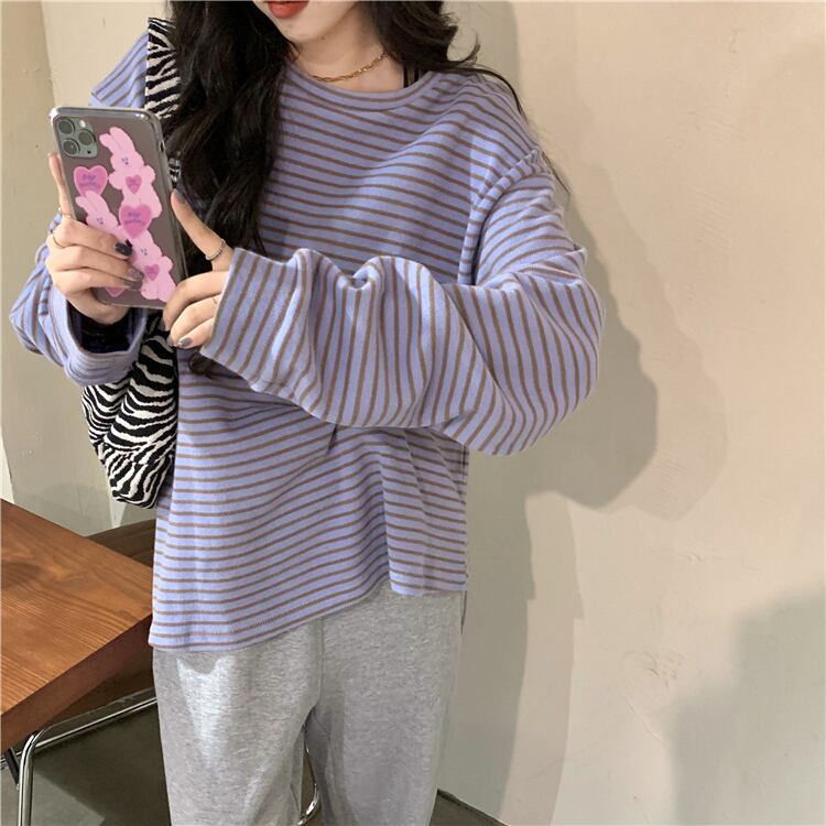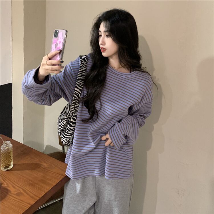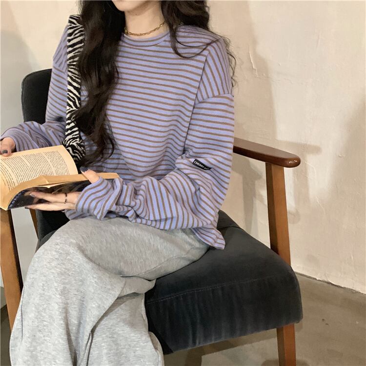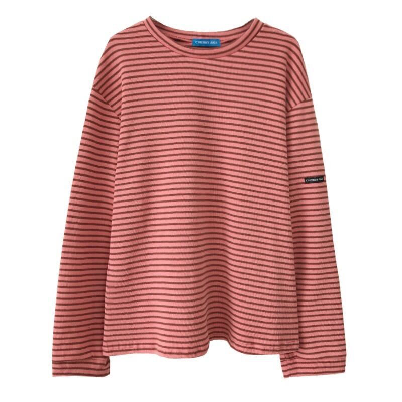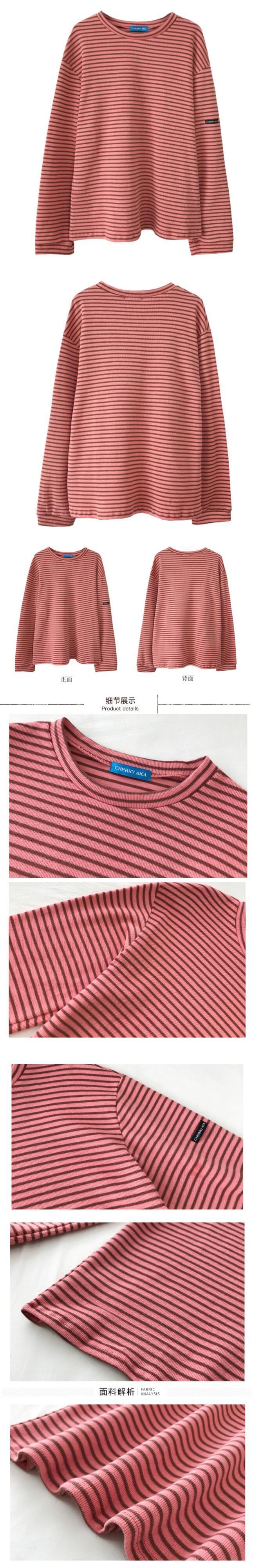 レッドカラーストライプラウンドネックシャツ スプリングルーズTシャツ ロング 春物 Oネック YY-ファッション52893843956