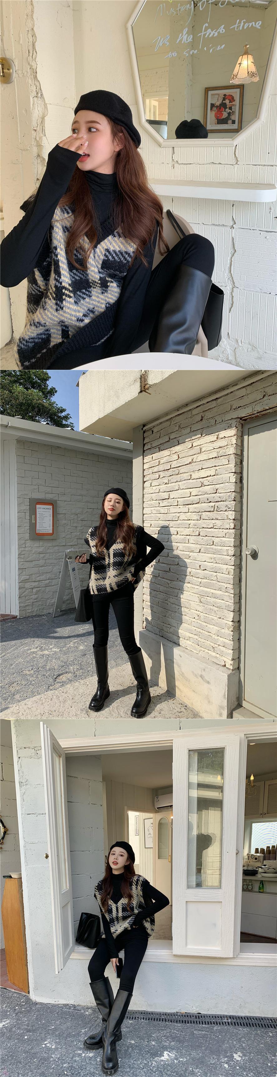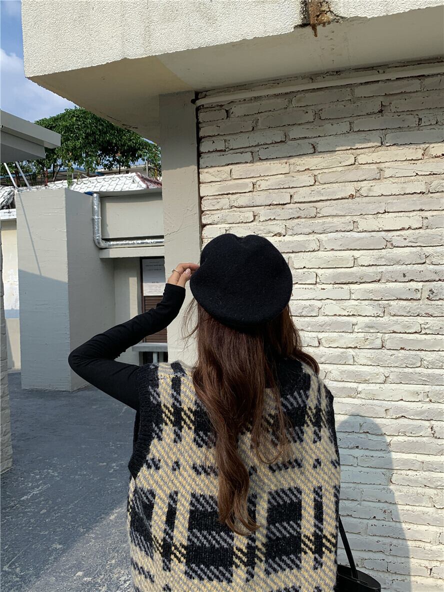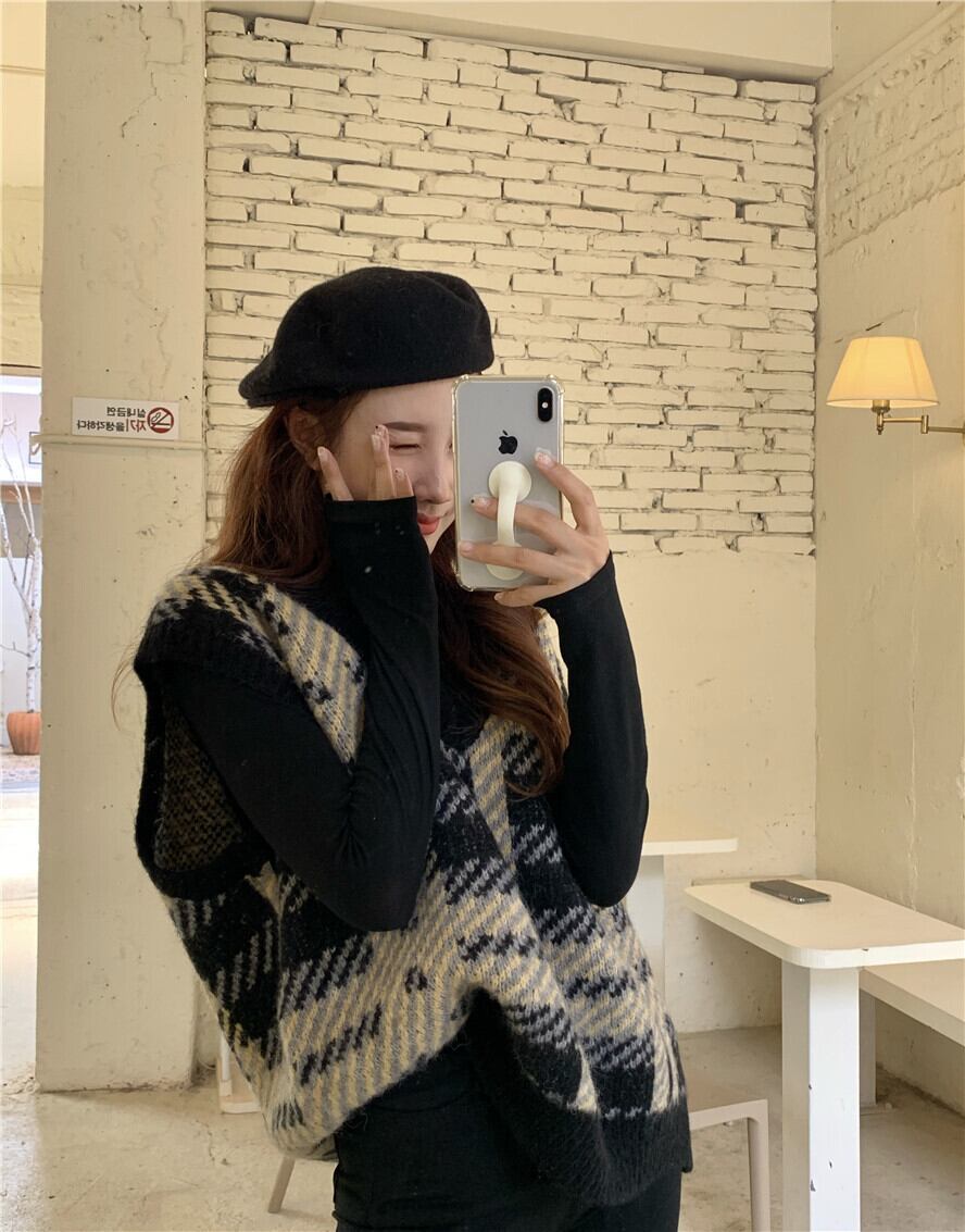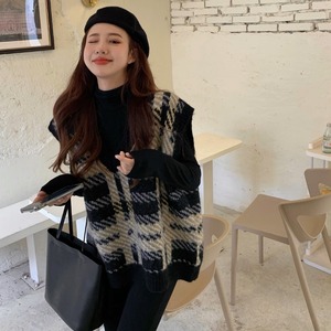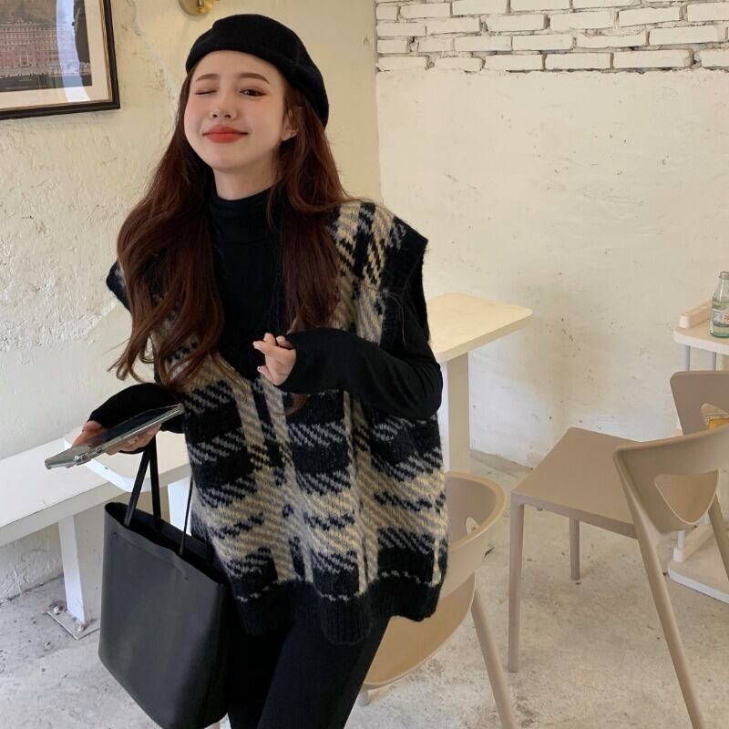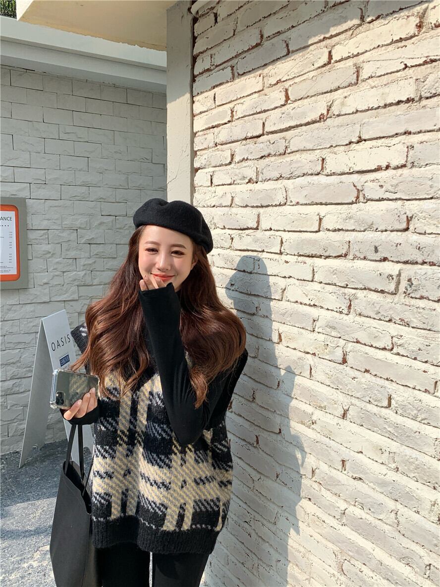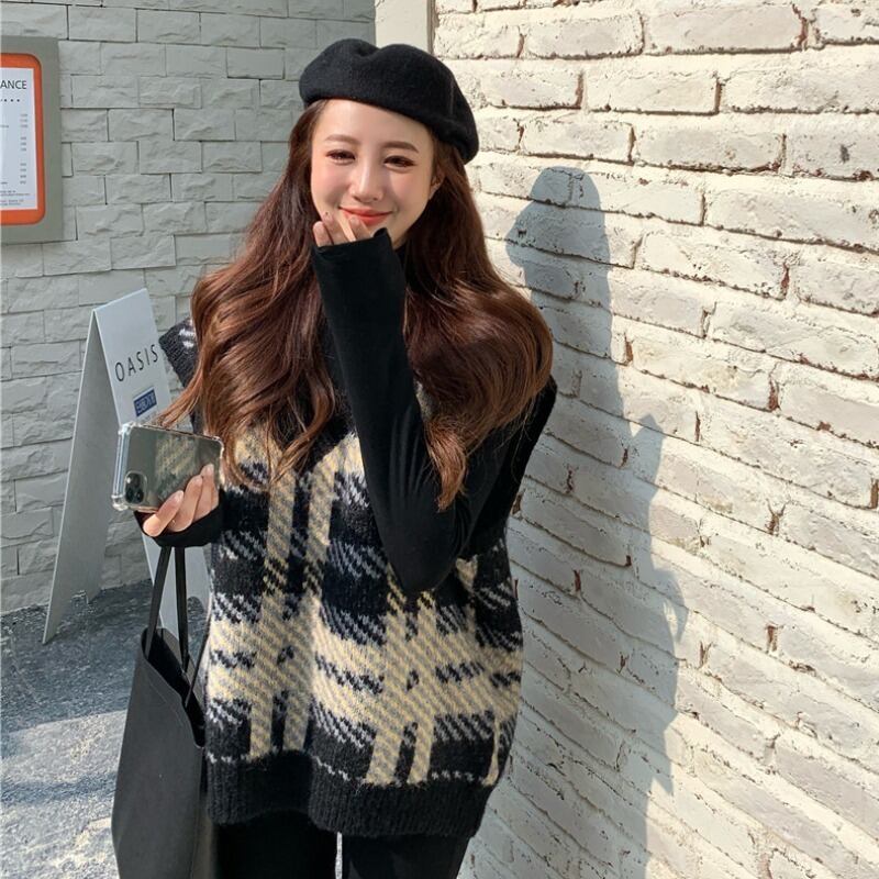 スタンダード格子柄ノースリーブプルオーバー ニットトップス レディースオータムウィンタールーズセーター レトロ 秋物 冬物 YY-ファッション10342166572