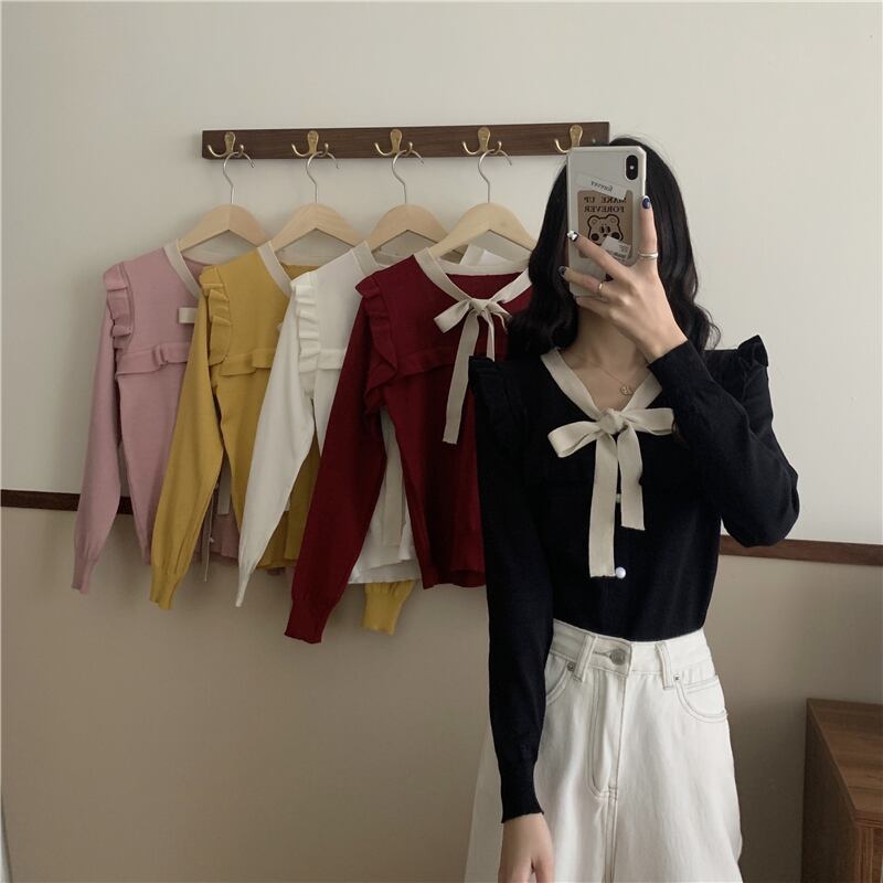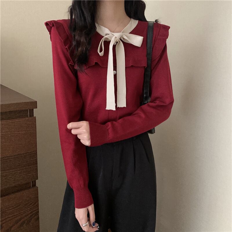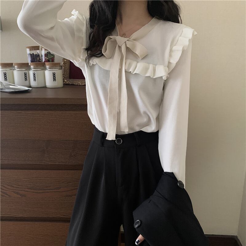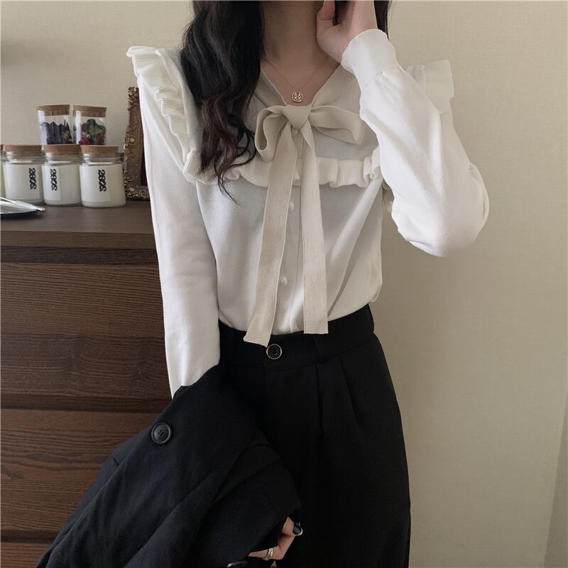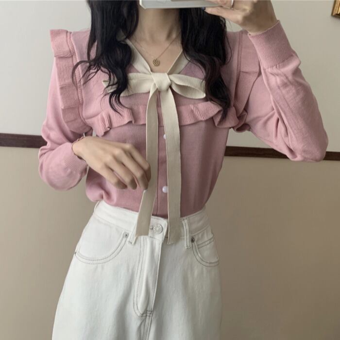 セーター レディーススプリングスタイルカラースリーブシャツ リボン 大人ガーリー スウィート キュート カジュアル 春物 YY-ファッション42846234485