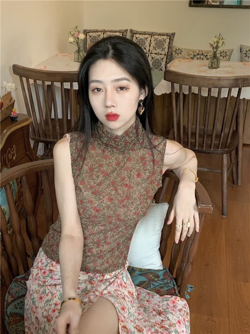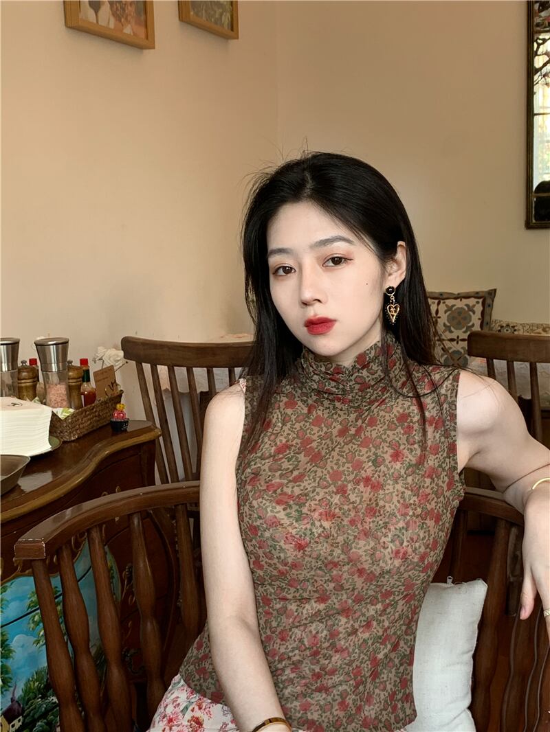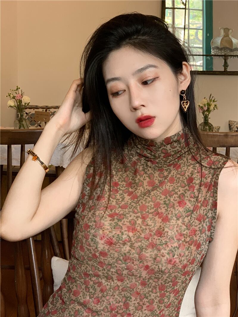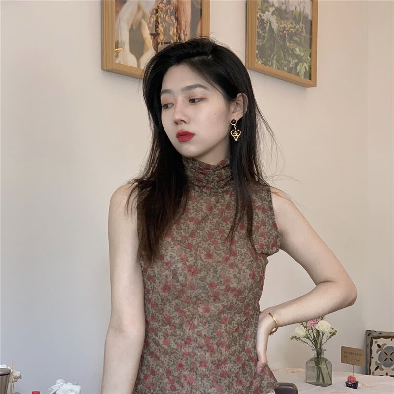 ノースリーブフローラル薄手ホルタートップス スタンダードTシャツ レトロ 花柄 YY-ファッション16530444135