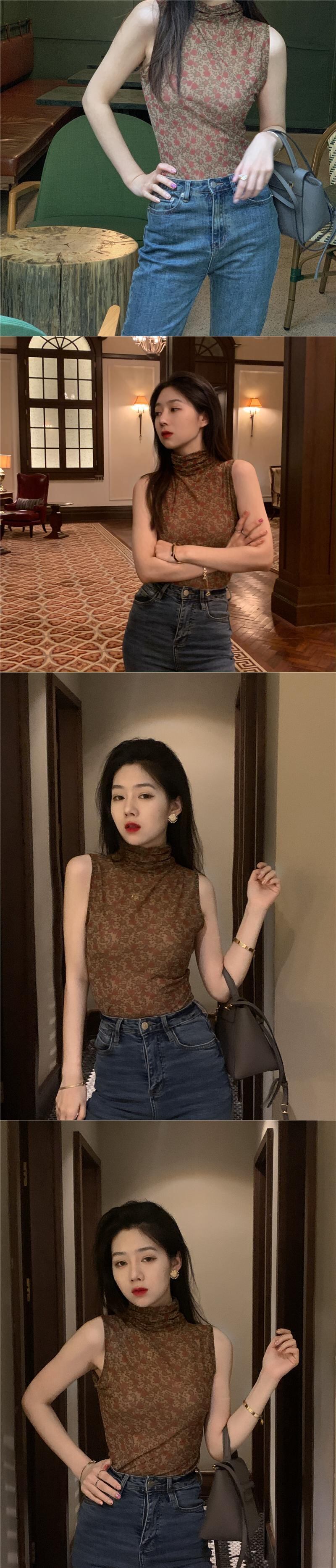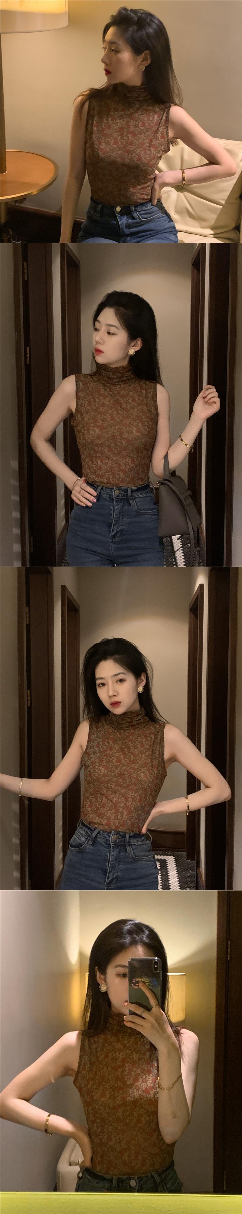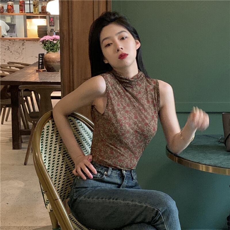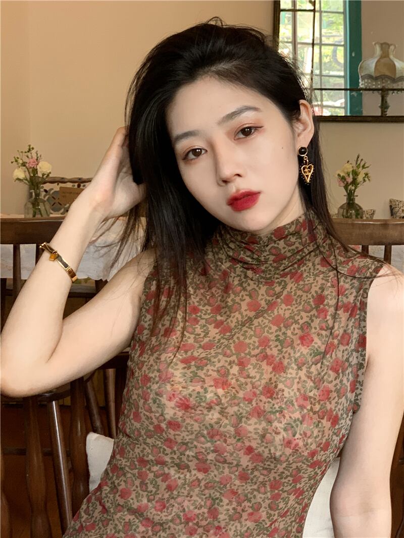 ノースリーブフローラル薄手ホルタートップス スタンダードTシャツ レトロ 花柄 YY-ファッション16530444135