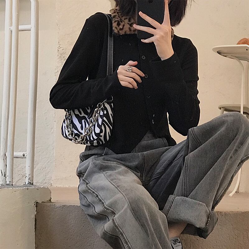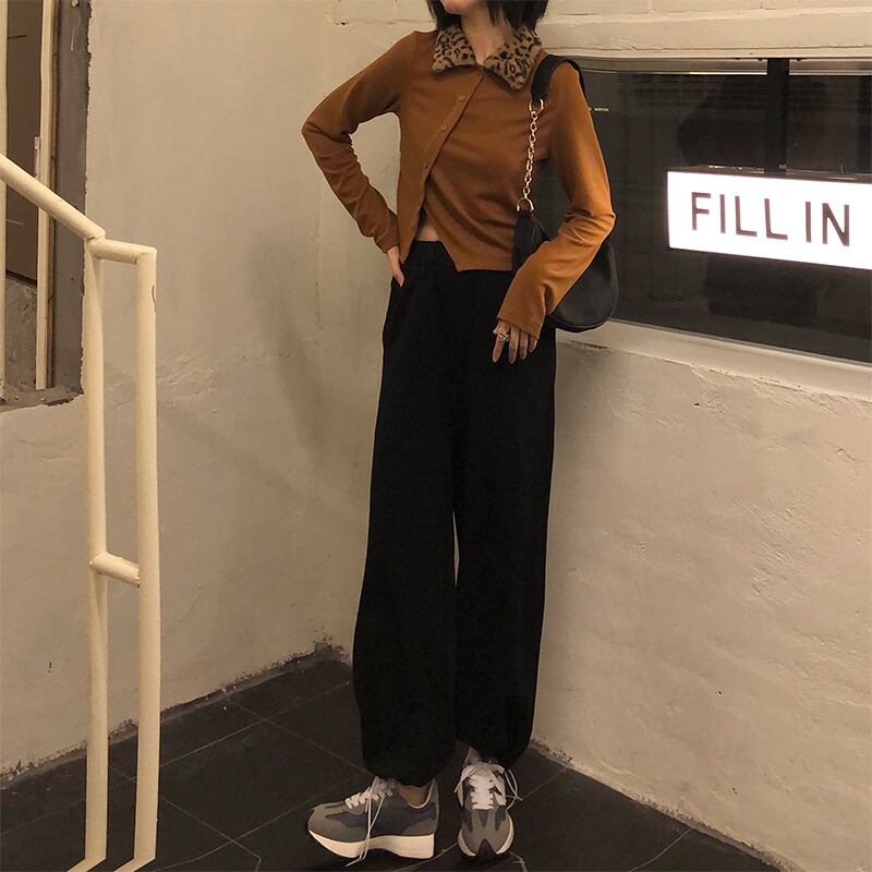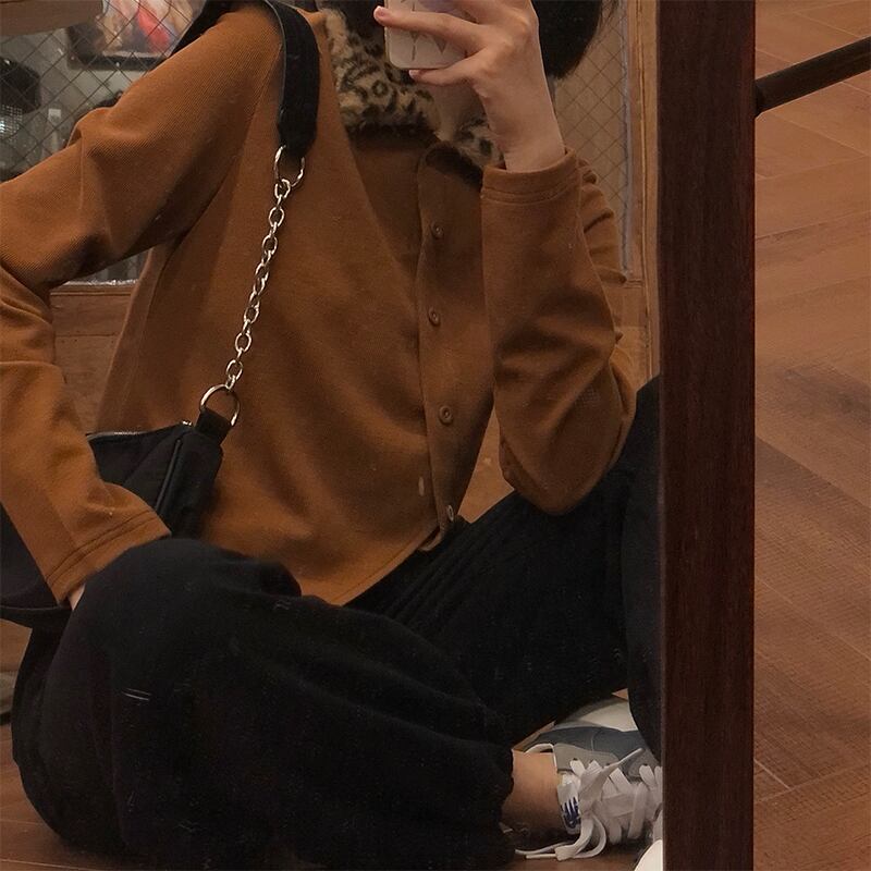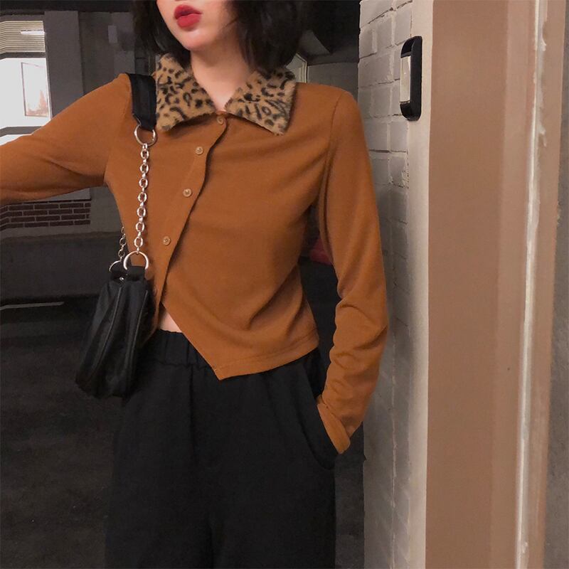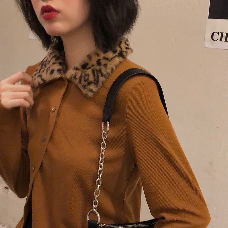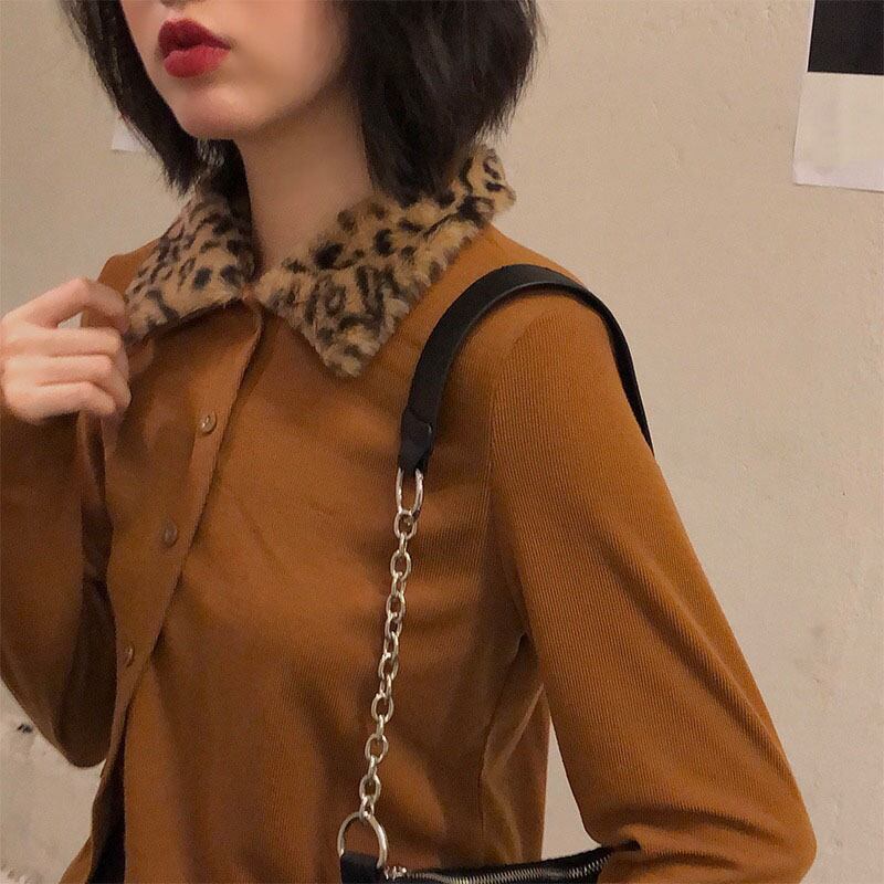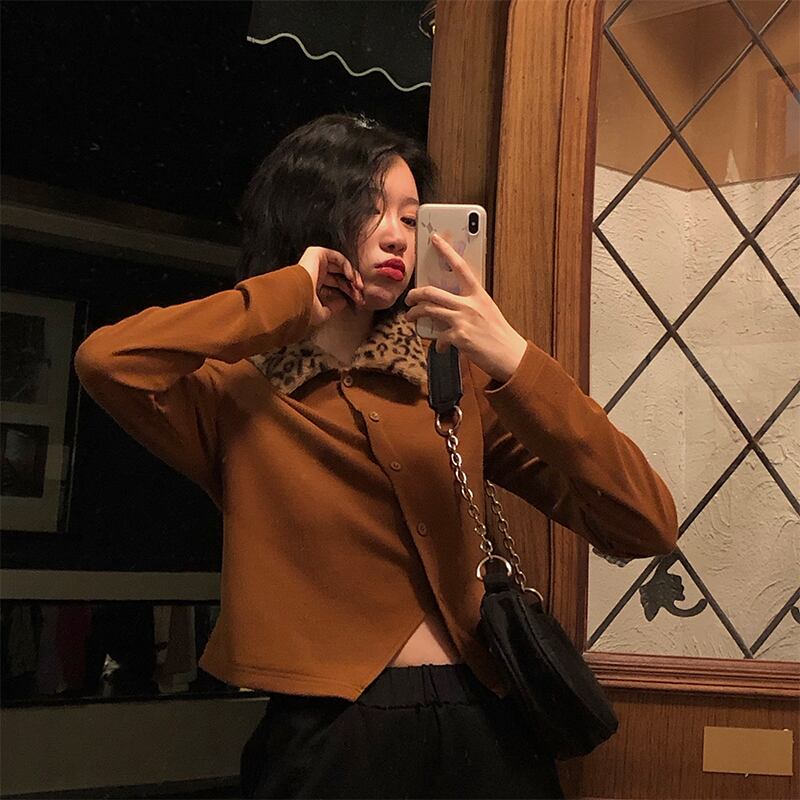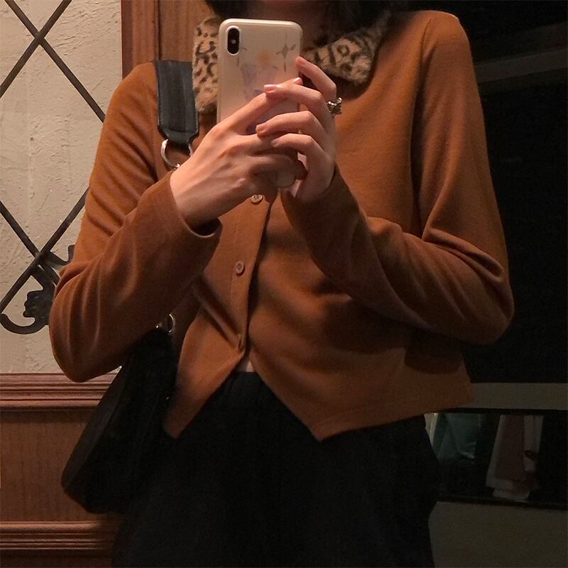 スタンダードカラーレオパードプリント柄シャツ レディースウィンターカーディガンセーター ロングバックルショートニットトップス レトロ 長袖 冬物 YY-ファッション53671617158