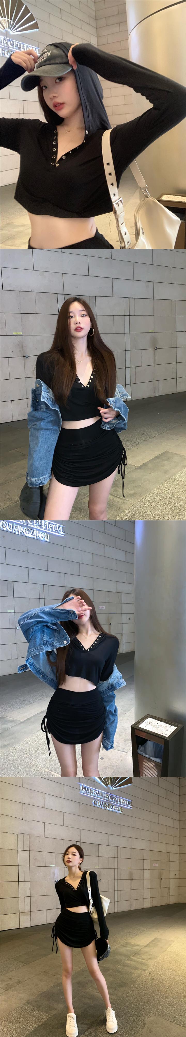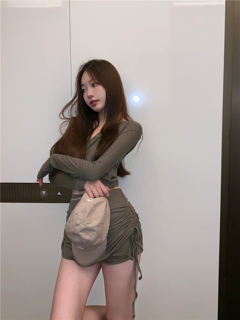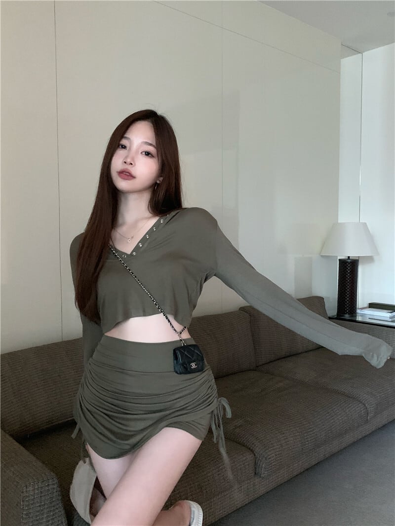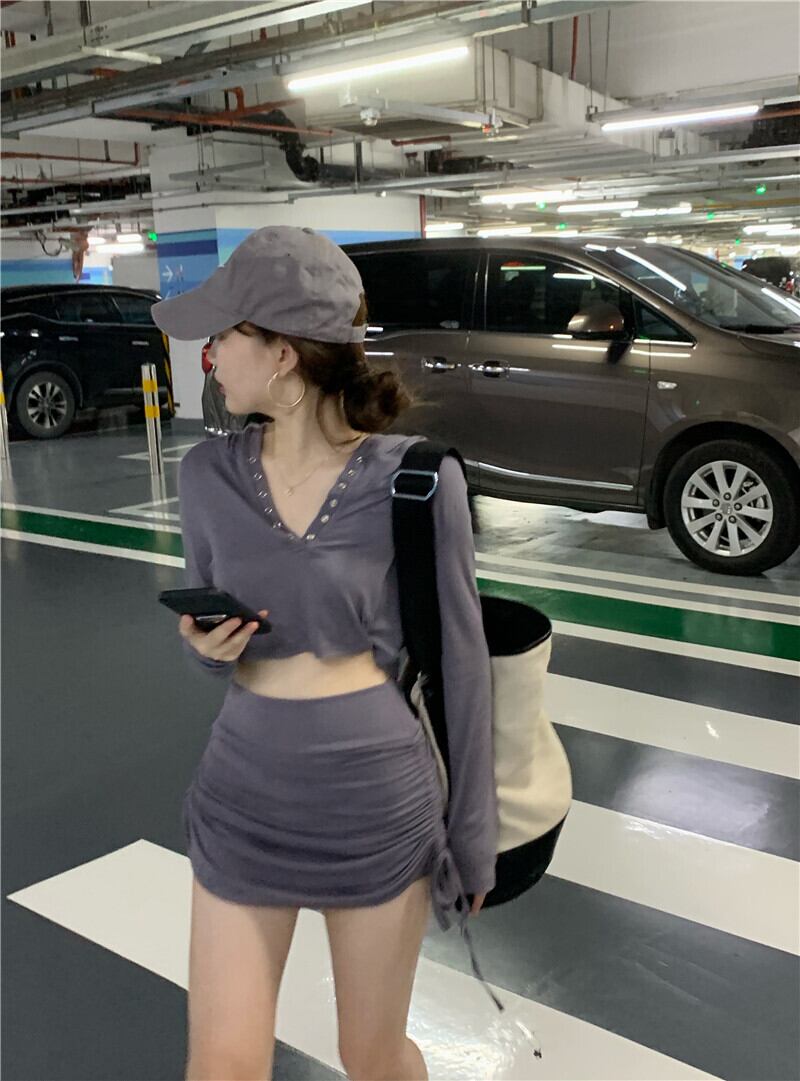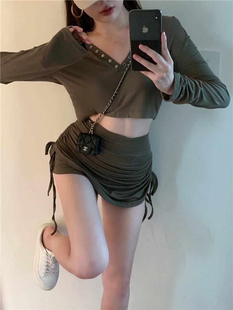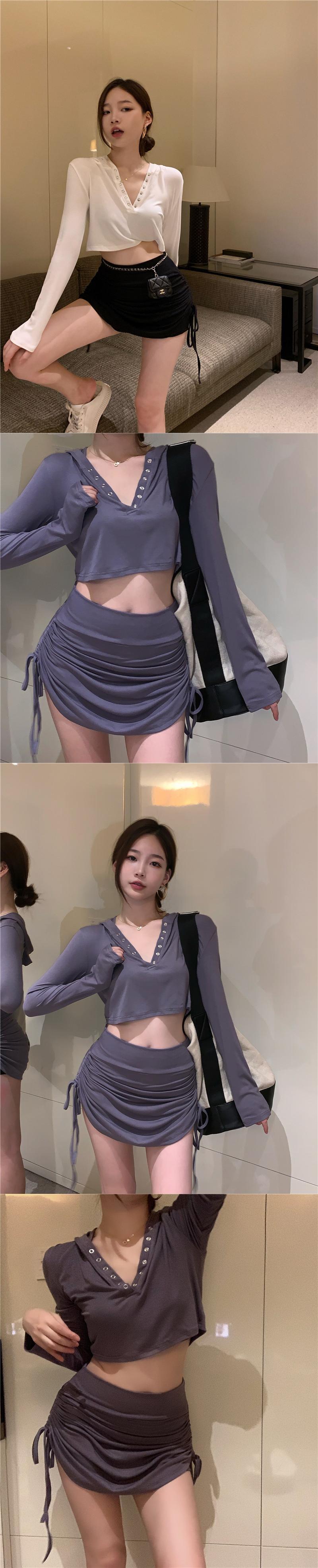 サマースタイルスリムVネックフードクロップトップ トップス ギャザープリーツショートスカート ロング 夏物 YY-ファッション47278395722