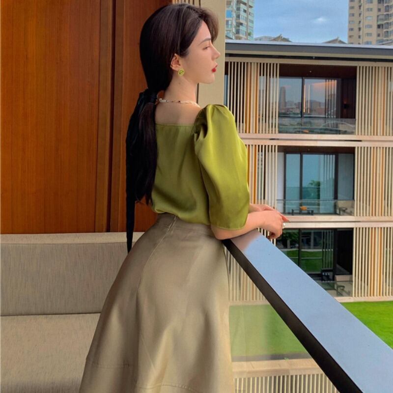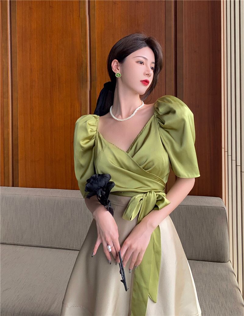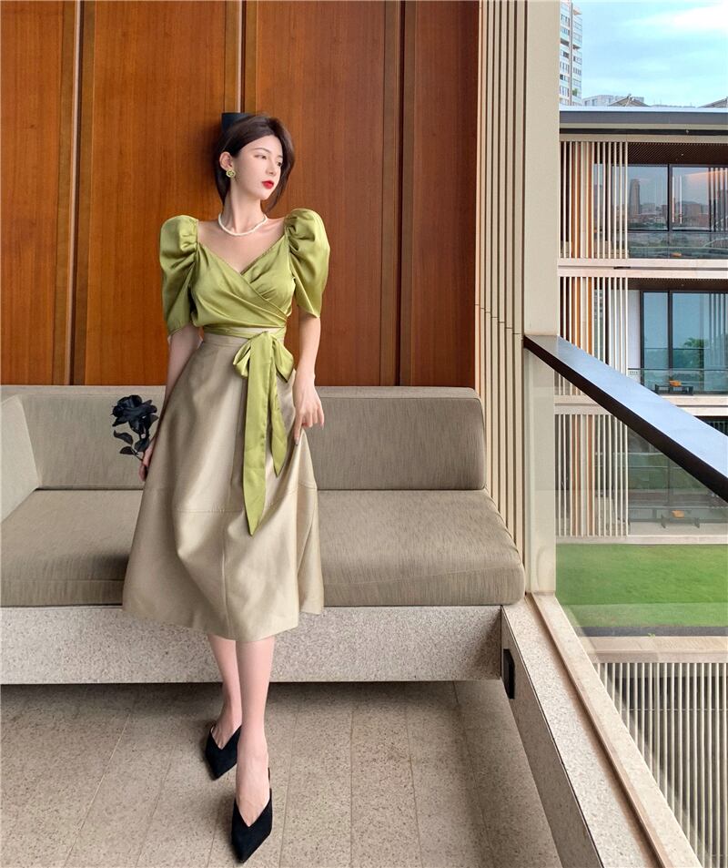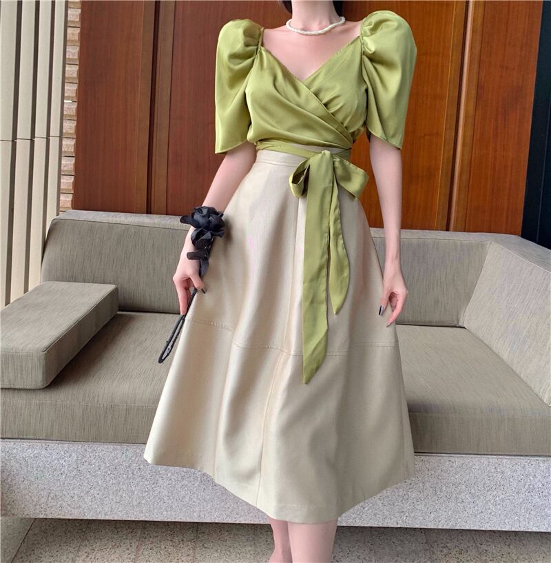 サマースタイルスリーブサテンシャツ ハイウェストAラインスカート レース 夏物 レースアップ YY-ファッション78045907552