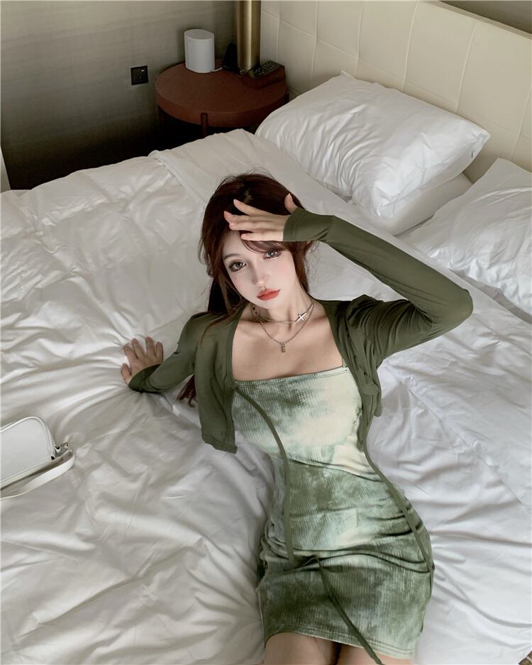 サマースタンダードグリーンショートカーディガンスリムドレス レトロ レース 夏物 レースアップ YY-ファッション98169869828