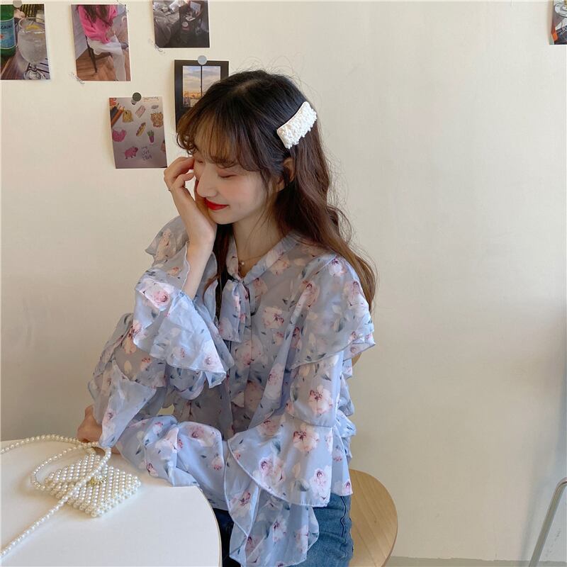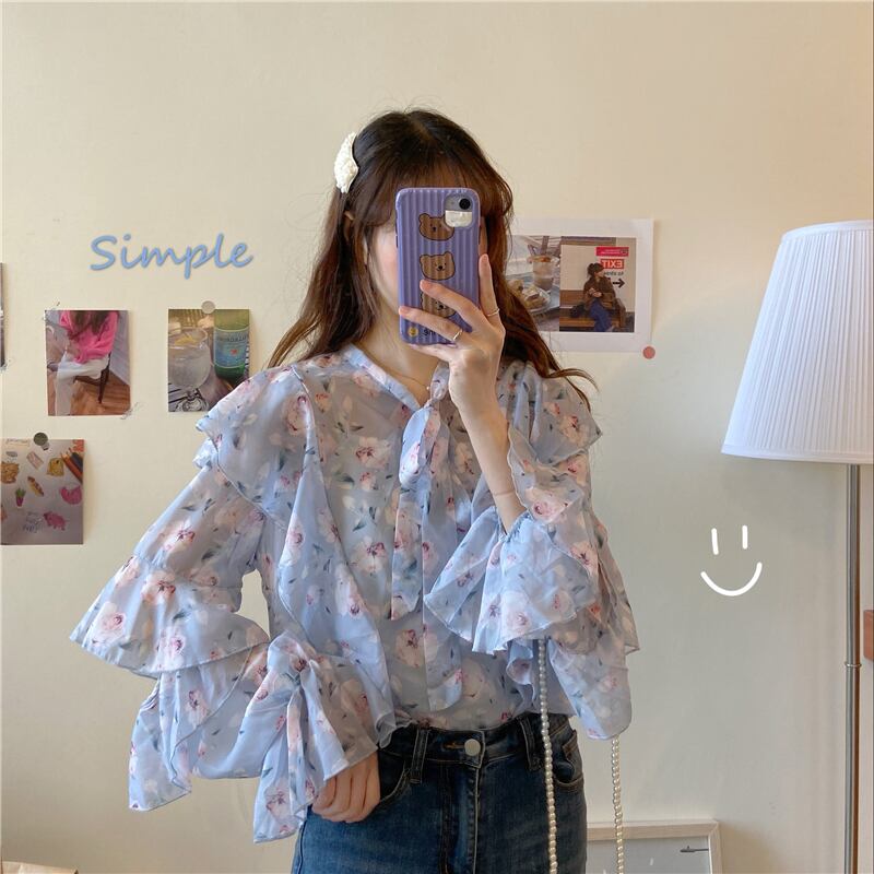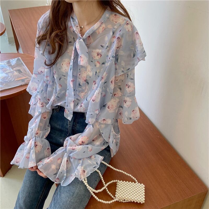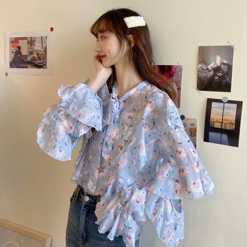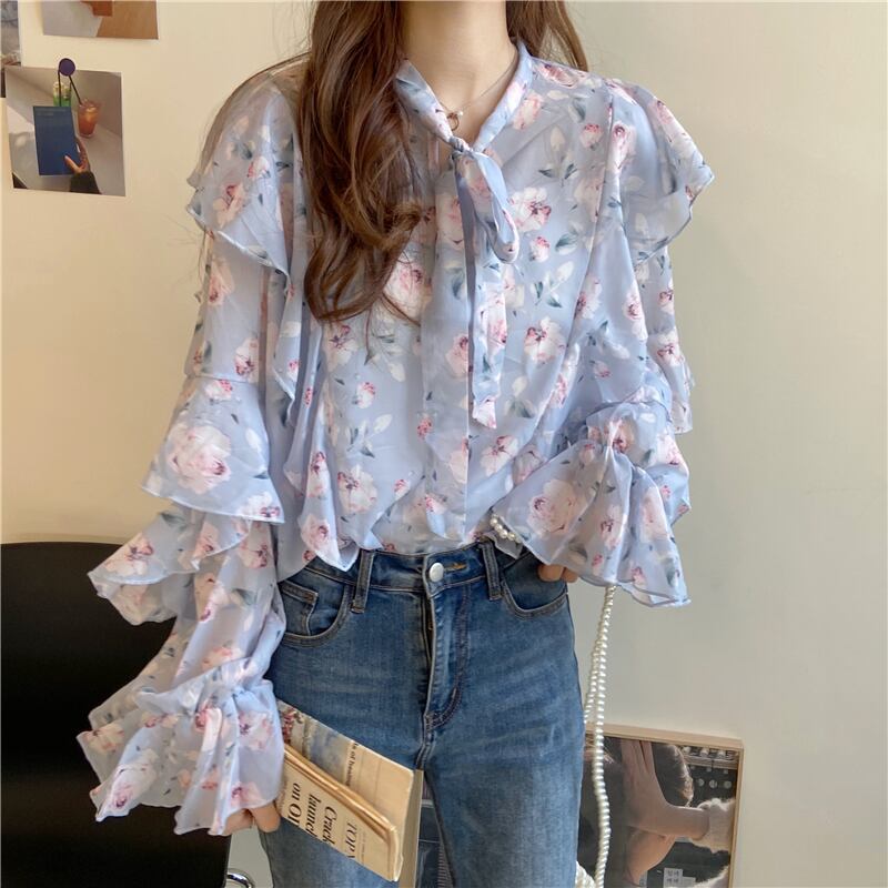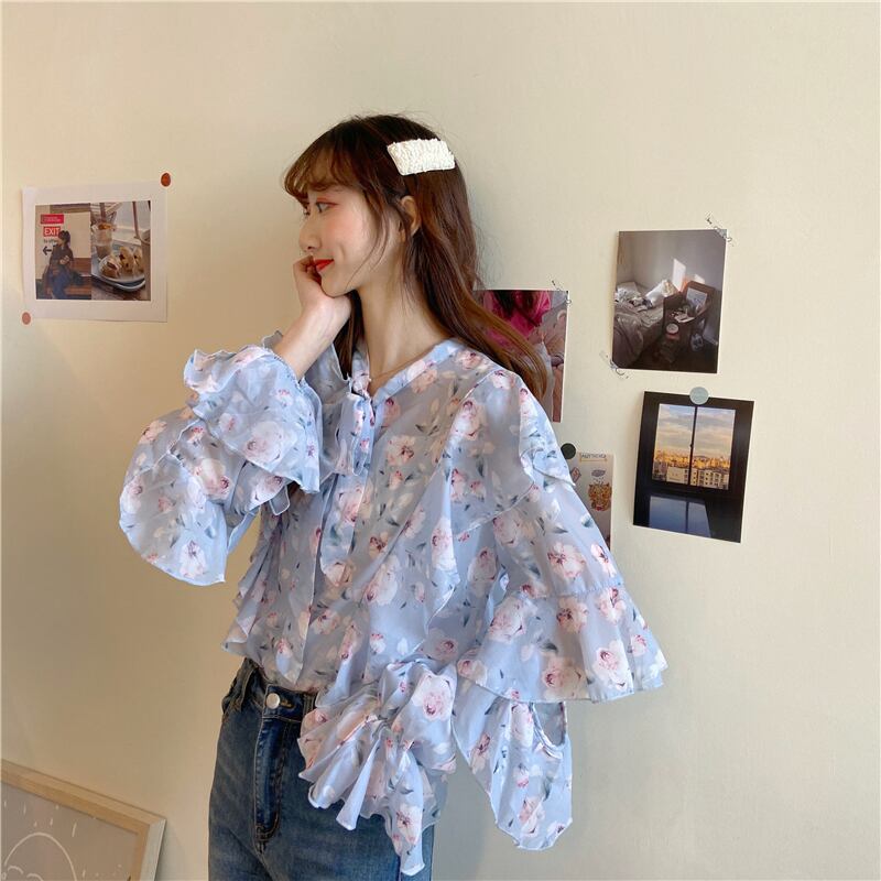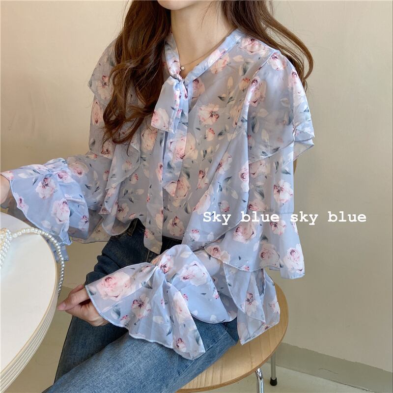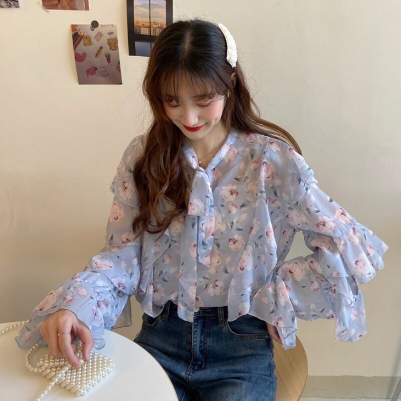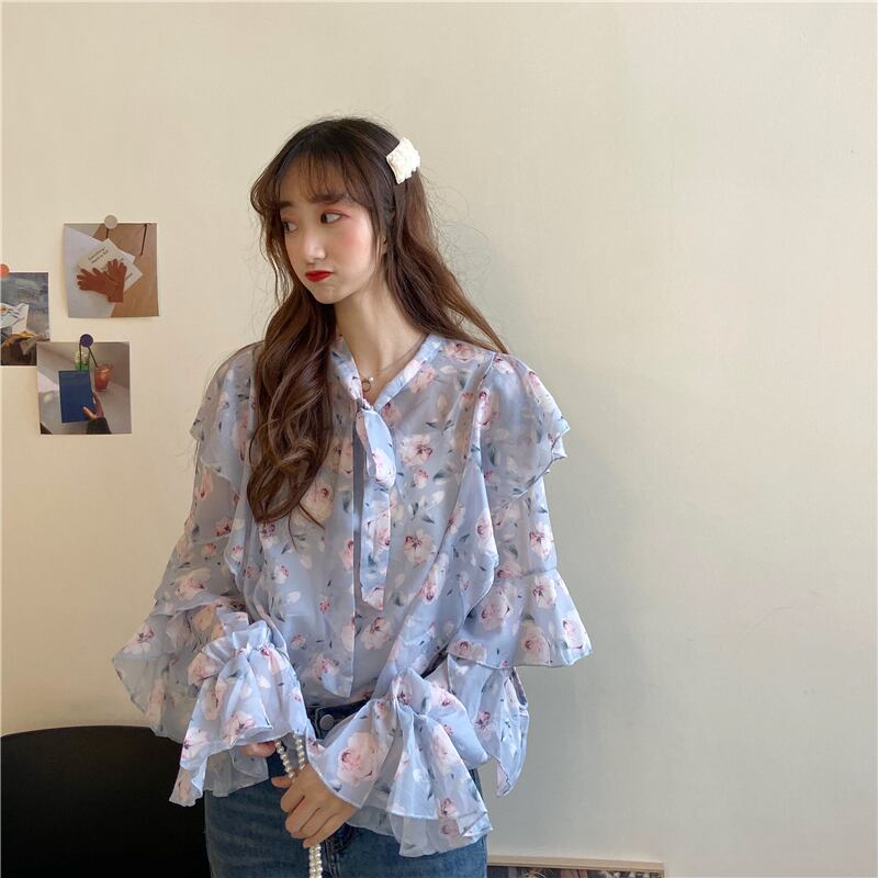 フローラルシフォンシャツ レディーススプリングブルー ロング 大人ガーリー スウィート キュート カジュアル 春物 花柄 YY-ファッション10652638676