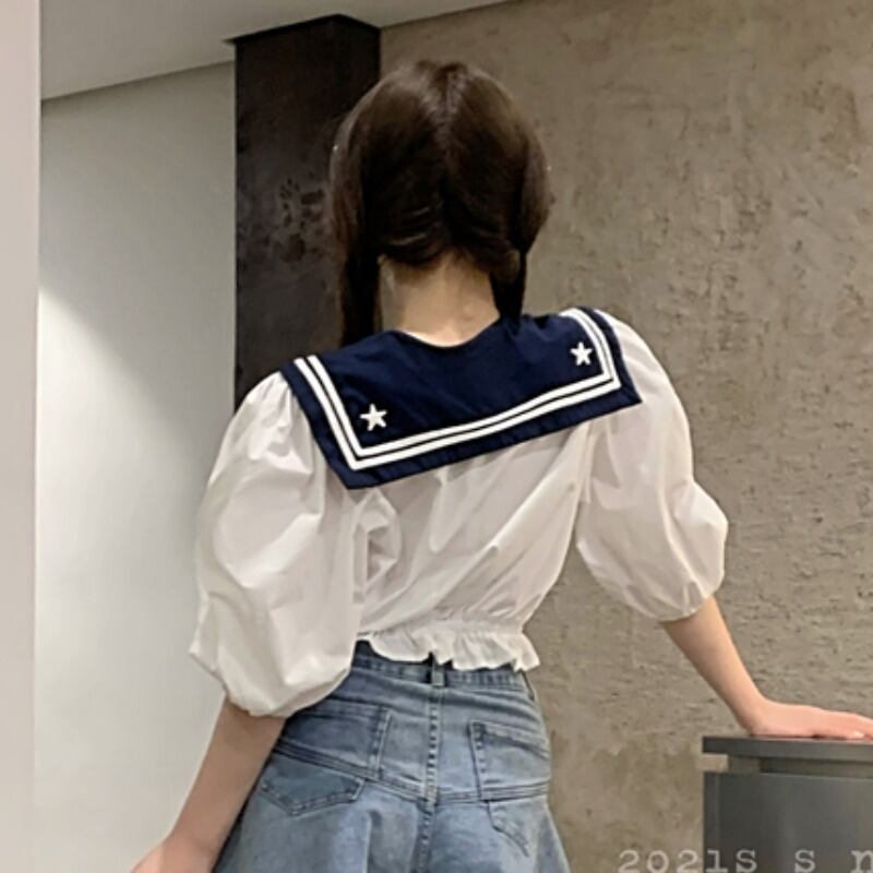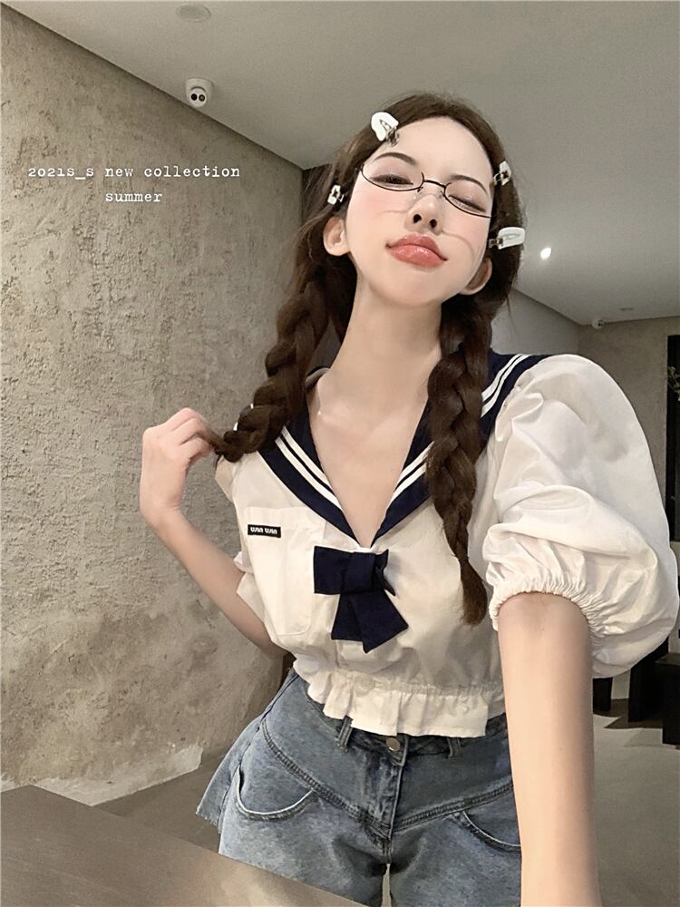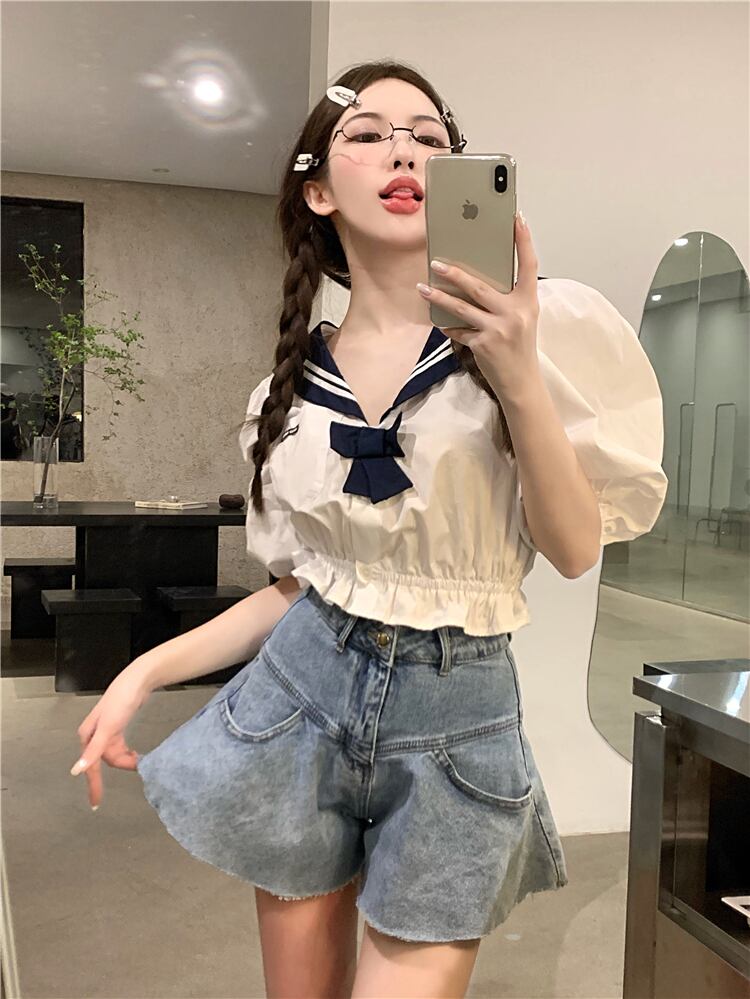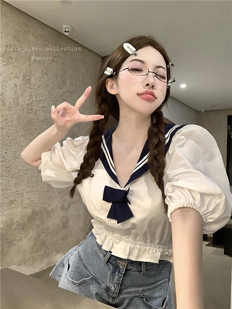 スタイルネイビーカラーシャツ サマーショート半袖スリーブトップス ハーフスリーブ 大人ガーリー スウィート キュート カジュアル 夏物 YY-ファッション81188148974
