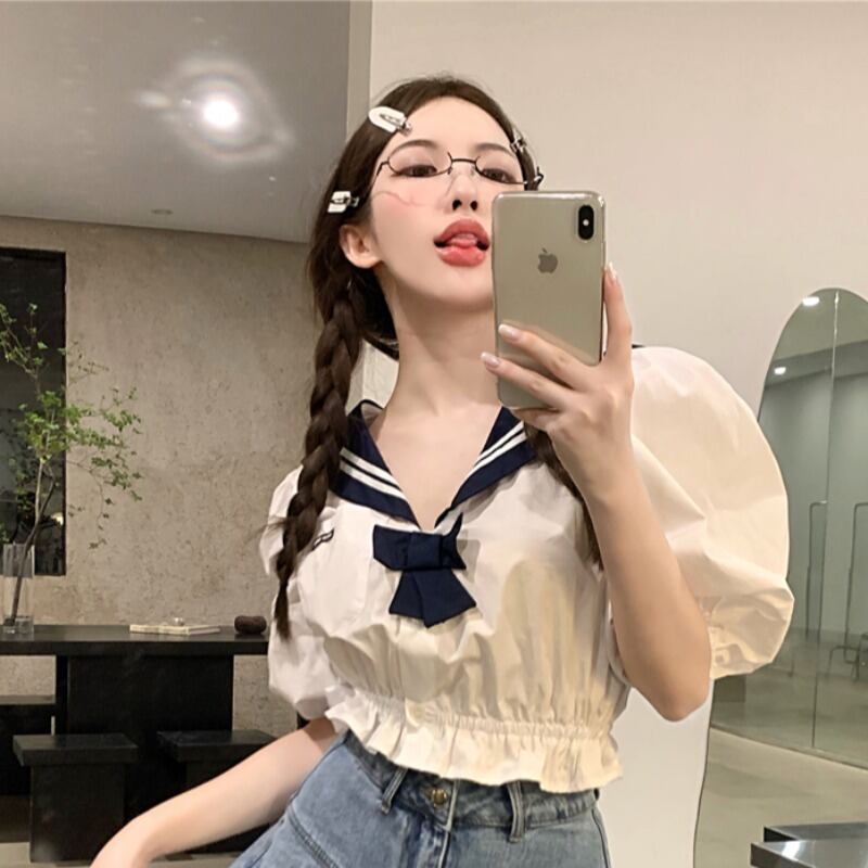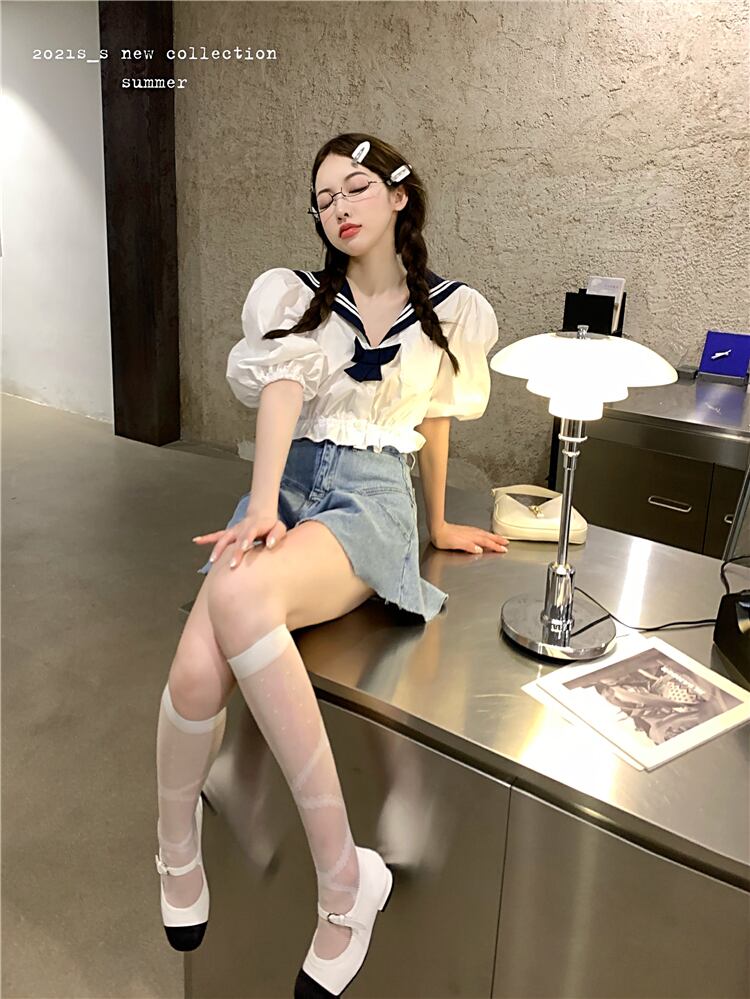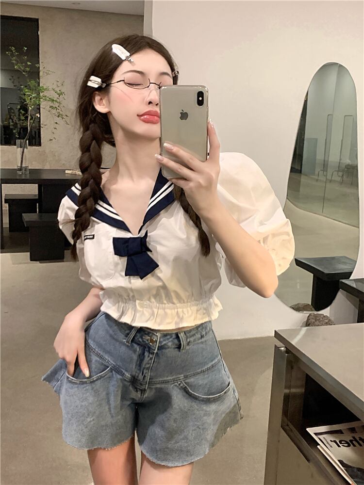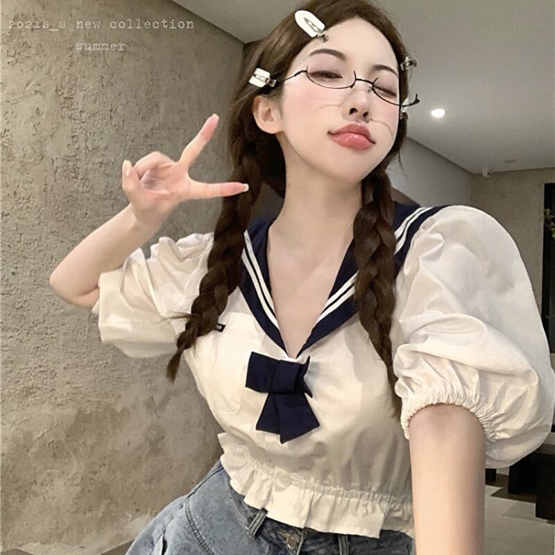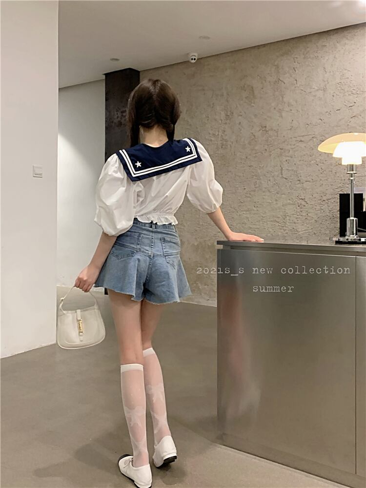 スタイルネイビーカラーシャツ サマーショート半袖スリーブトップス ハーフスリーブ 大人ガーリー スウィート キュート カジュアル 夏物 YY-ファッション81188148974