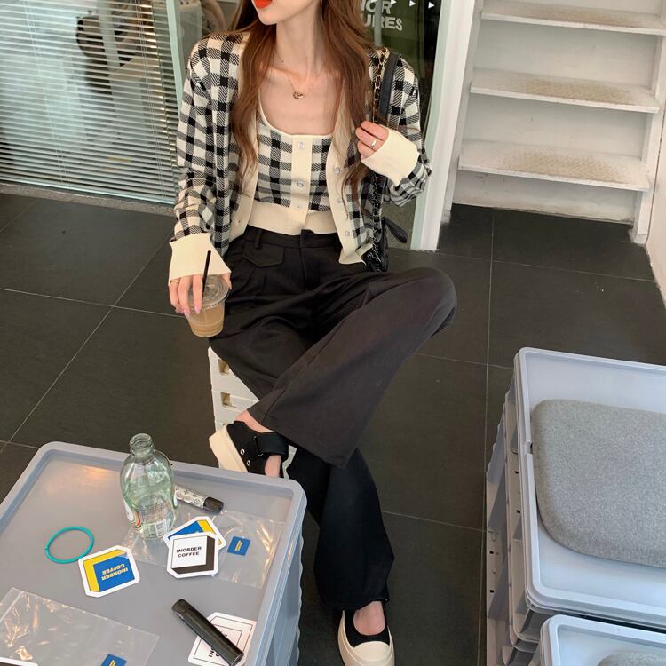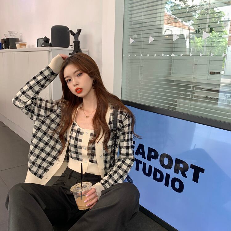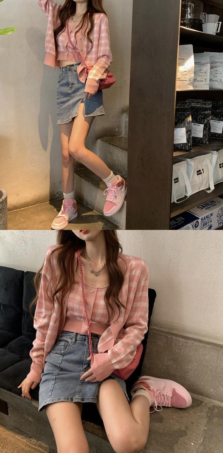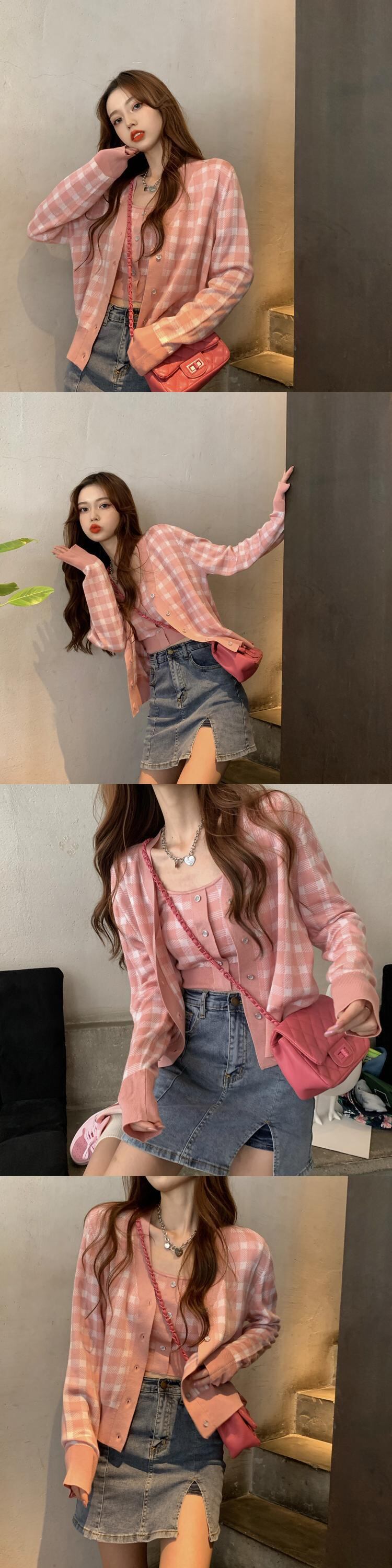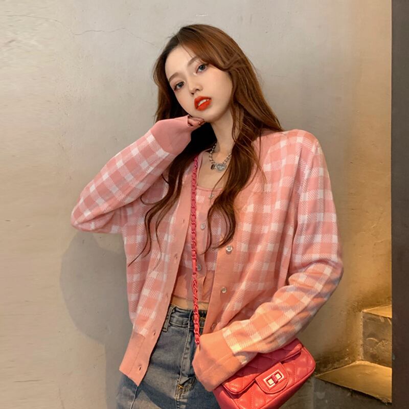 格子柄セーター ジャケット ウィンターサマールーズ長袖スリーブトップス カーディガンセット ロング ピンク 夏物 冬物 YY-ファッション20573641228