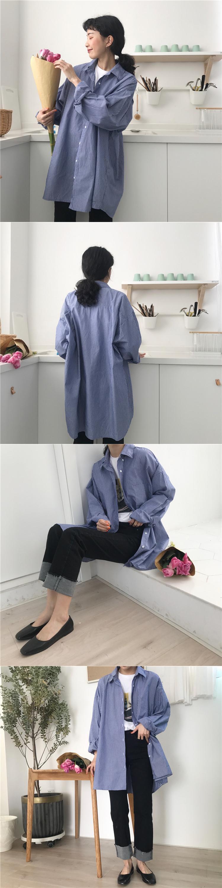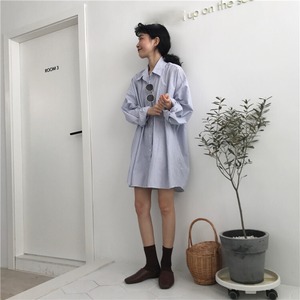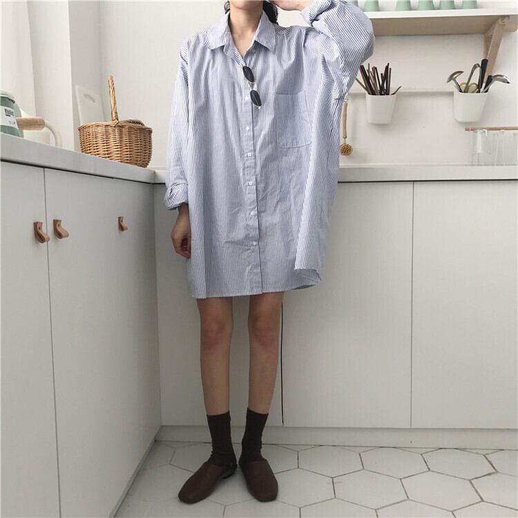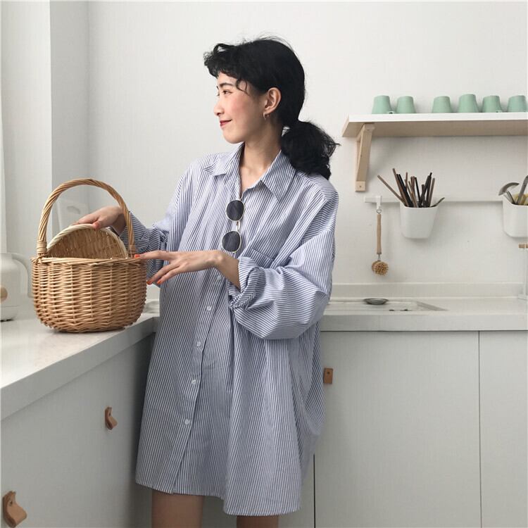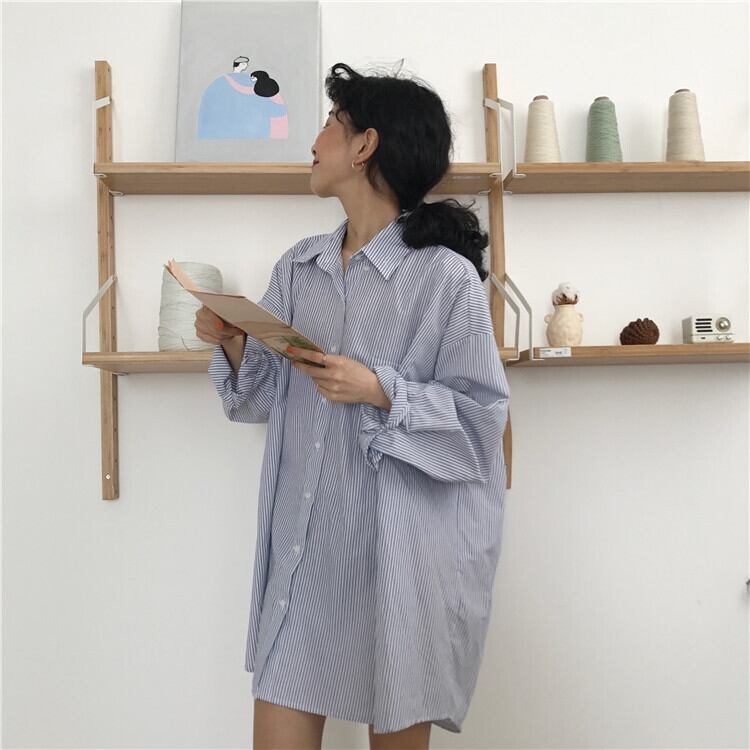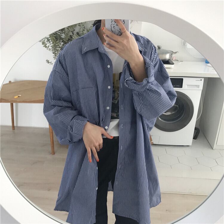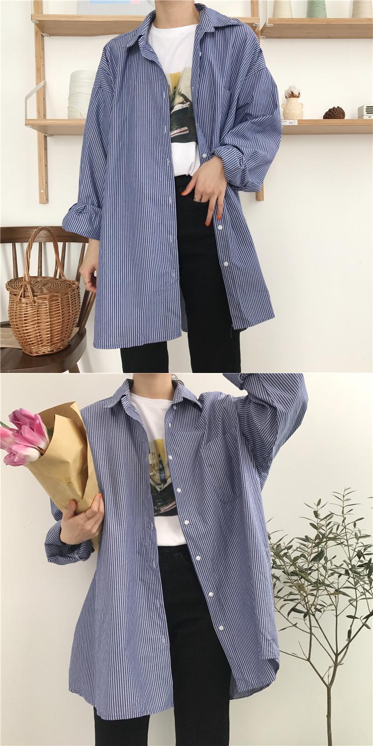 ストライプシャツ レディーススタンダードスプリングオータムルーズジャケット ロング レトロ 春物 秋物 YY-ファッション66653088134