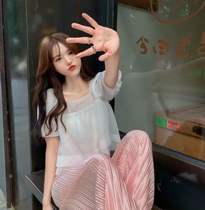 色:ホワイトトップ,ピンクワイドレッグパンツ