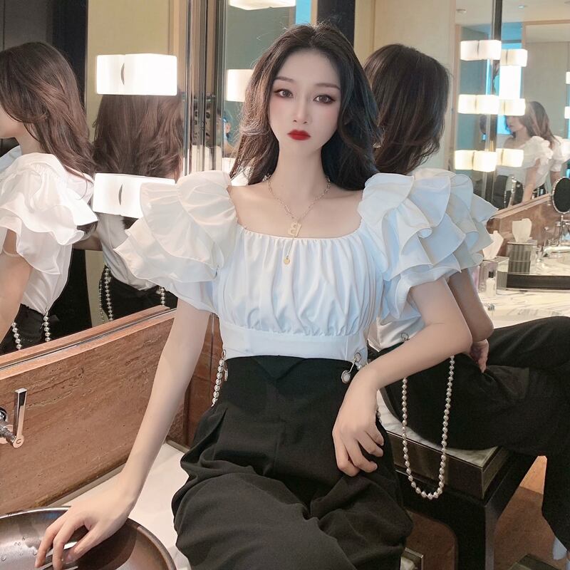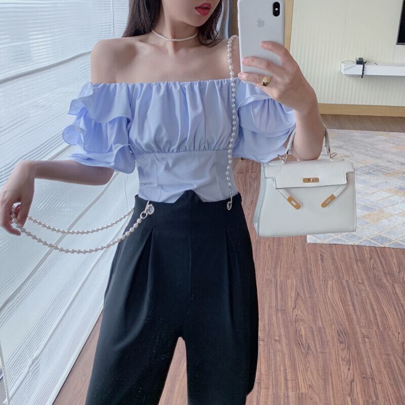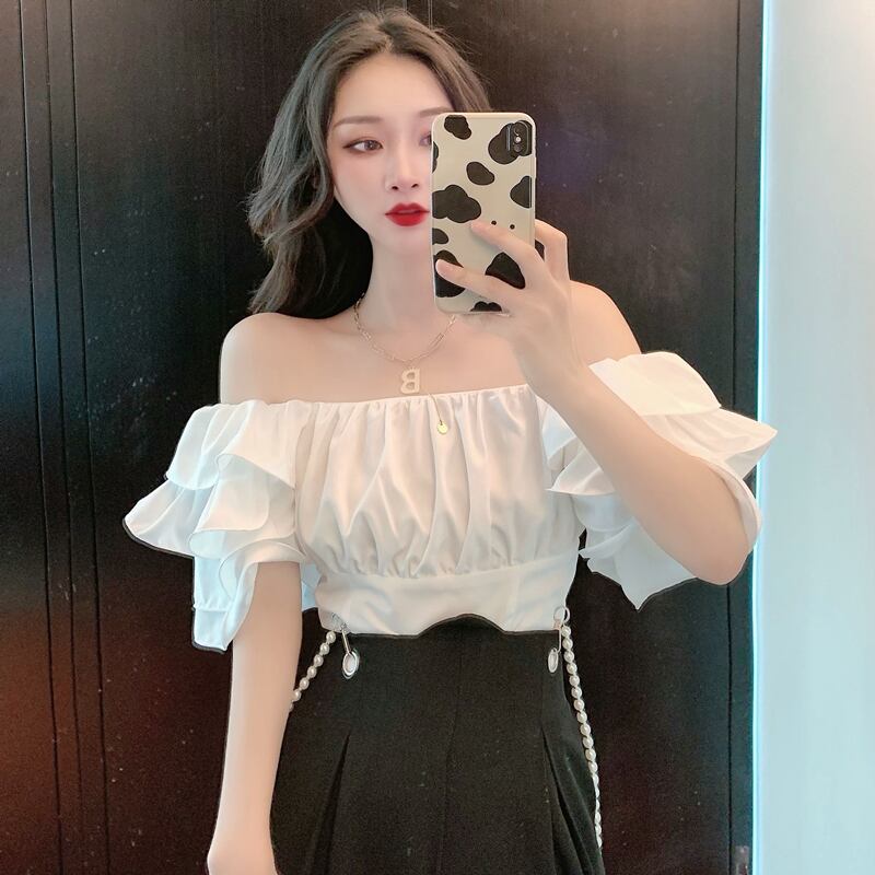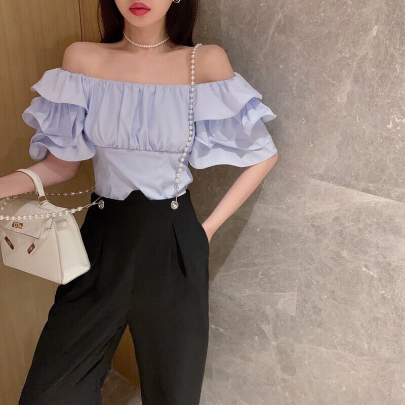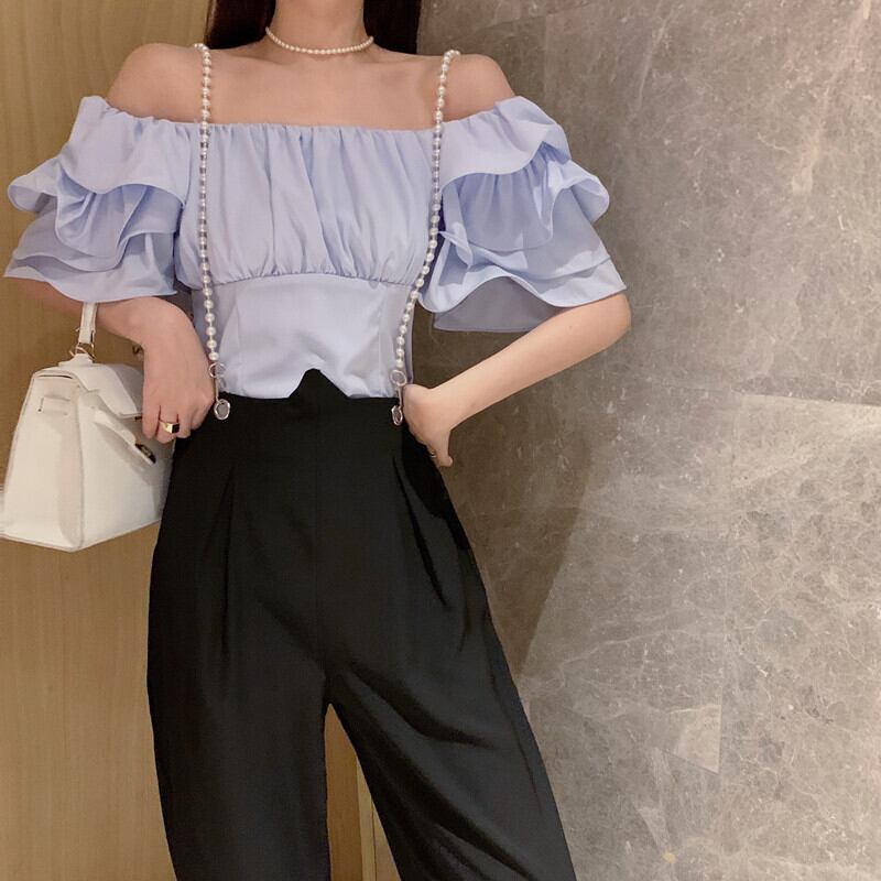 サマースタイルカラースリーブトップス パールレディース レッド 夏物 オフショルダー 真珠 YY-ファッション90086146331