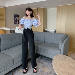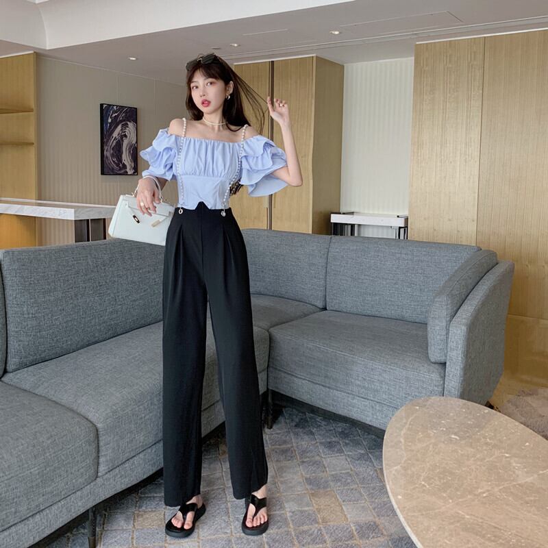 色:ブルートップ,白のシャツ,黒のサスペンダーパンツ