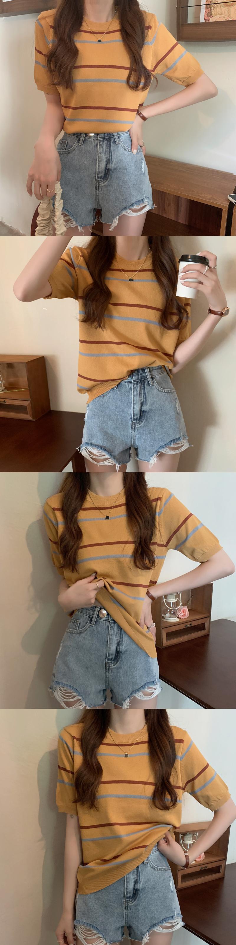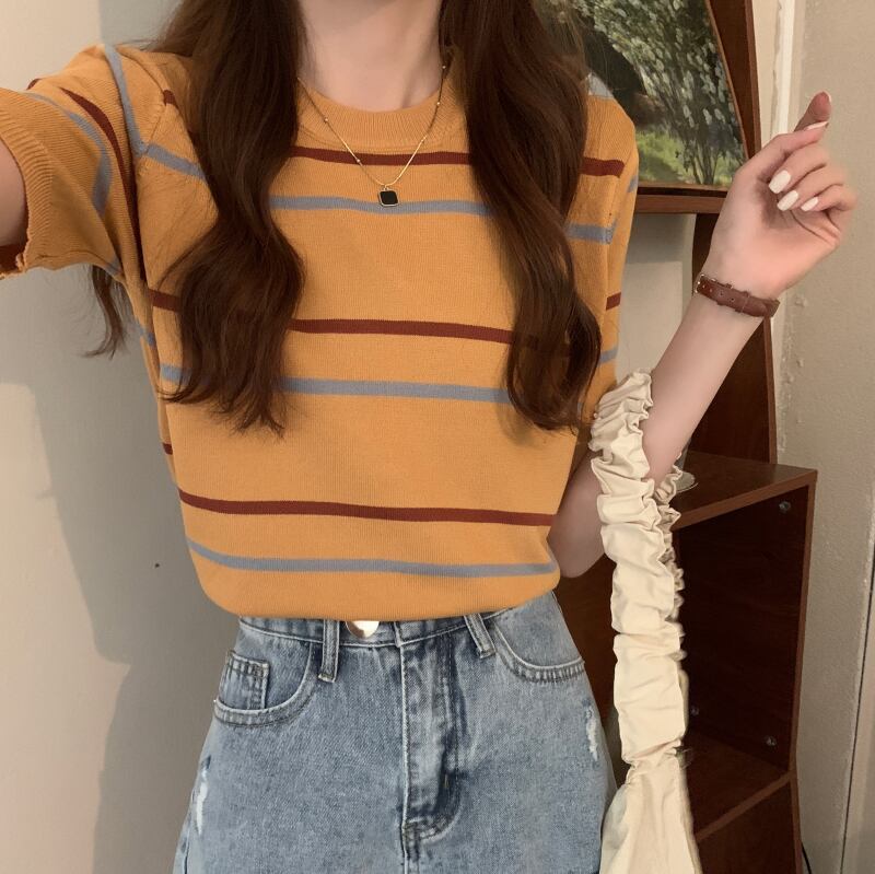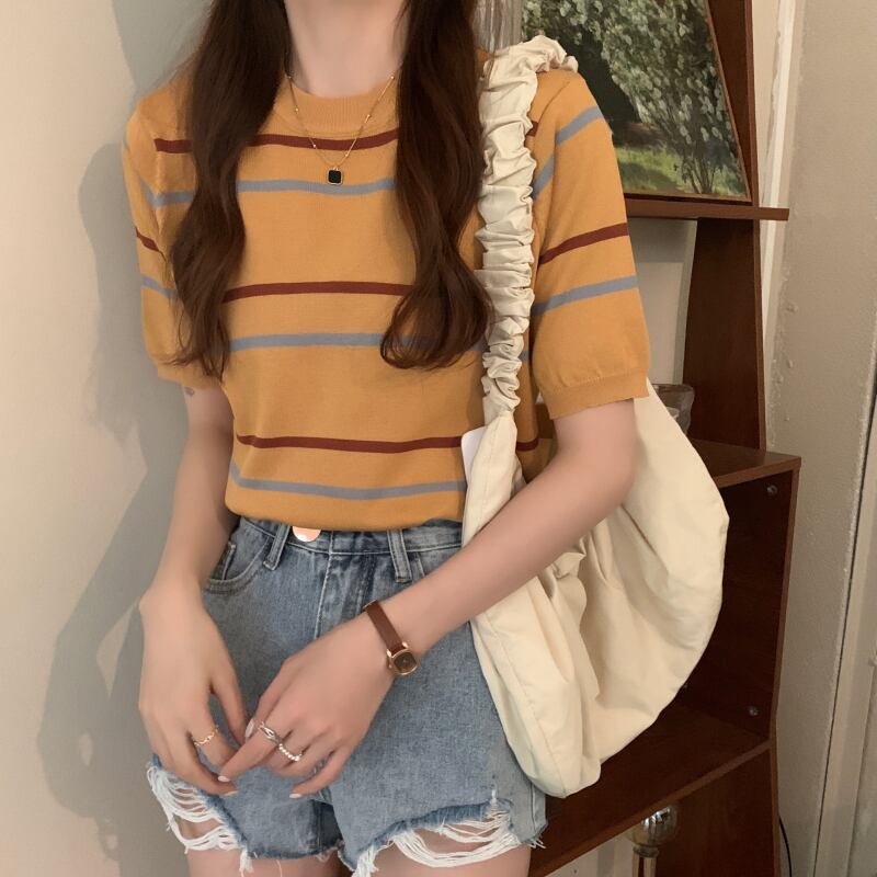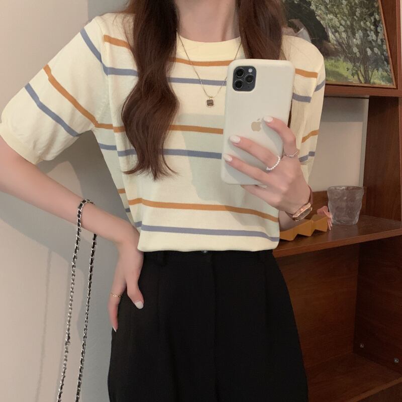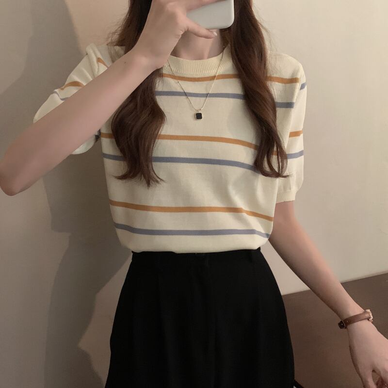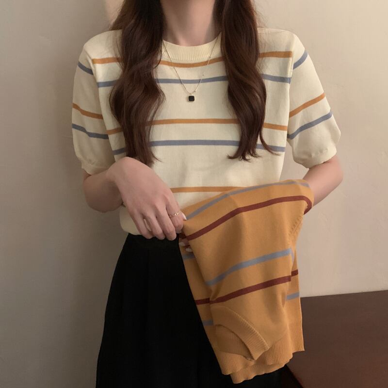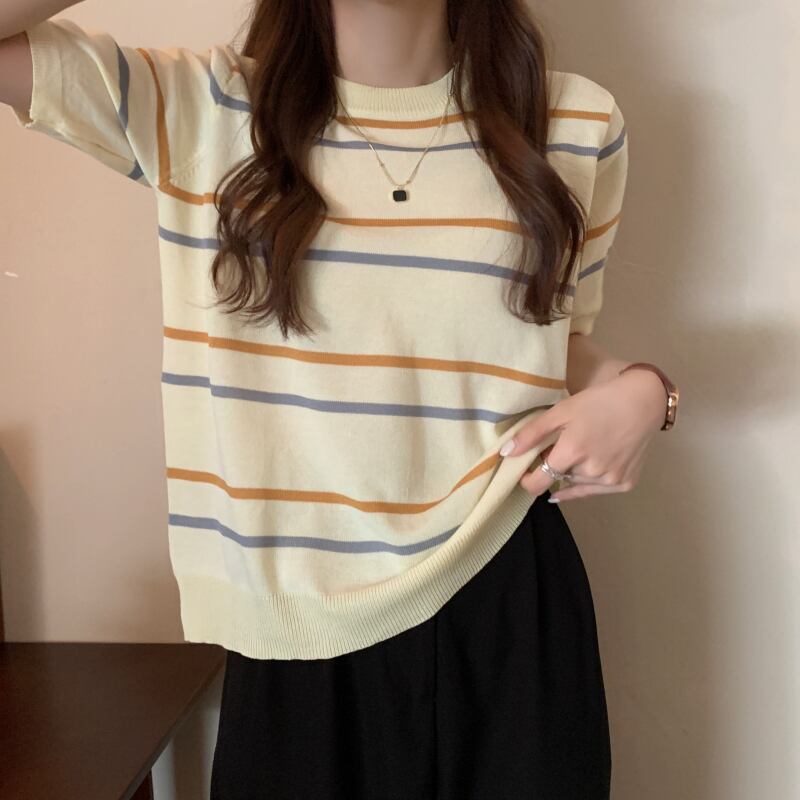 ニットセーター サマー薄手スタイルルーズストライプラウンドネックプルオーバー 半袖スリーブトップス ショート ハーフスリーブ 夏物 Oネック YY-ファッション61431154250