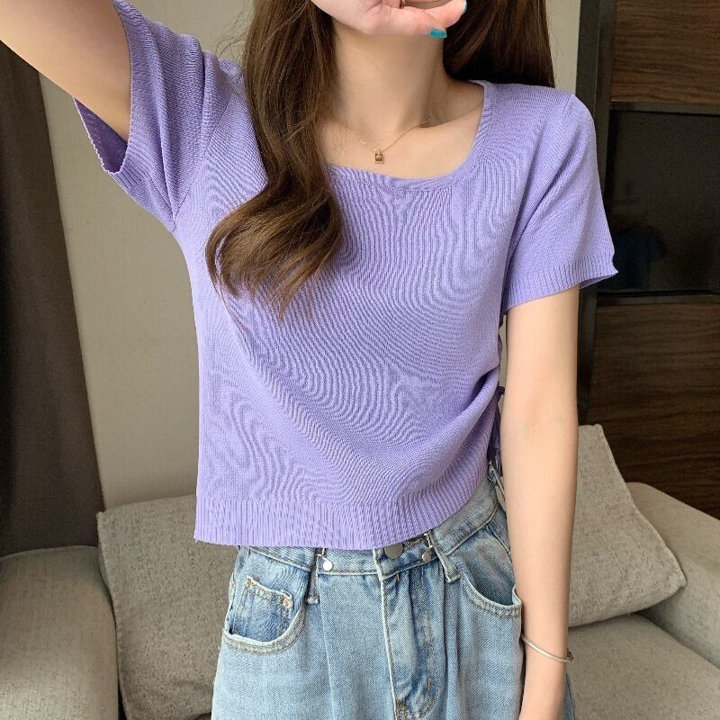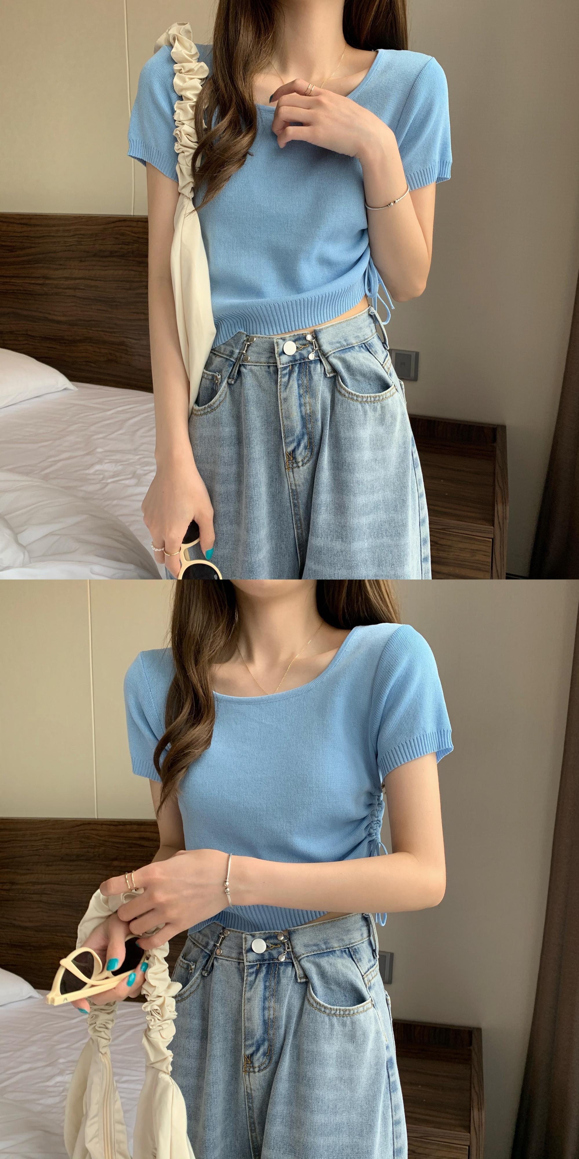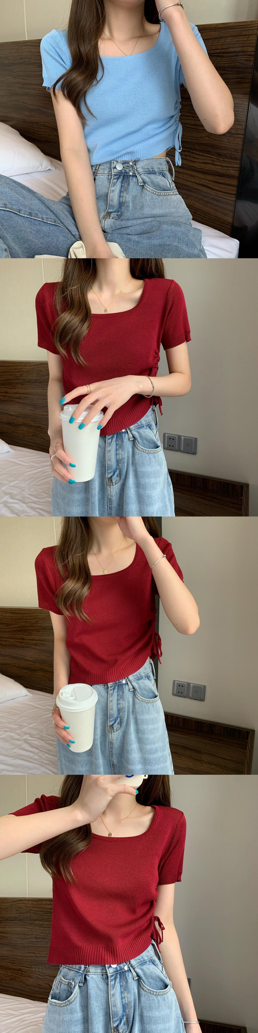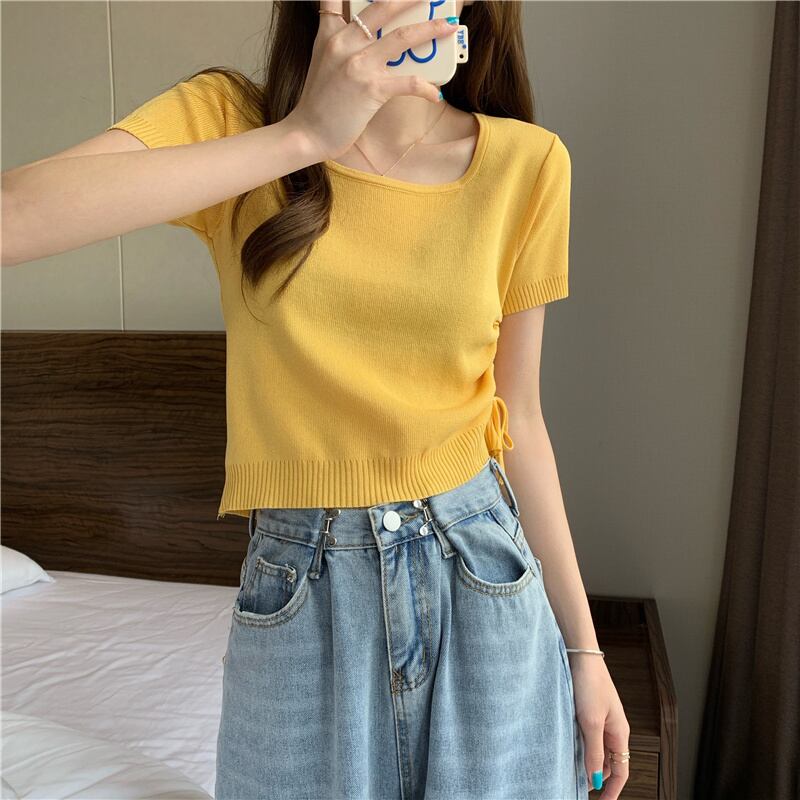 カラープルオーバー サイドギャザーニットTシャツ サマートップス 夏物 スクウェア YY-ファッション48117015985