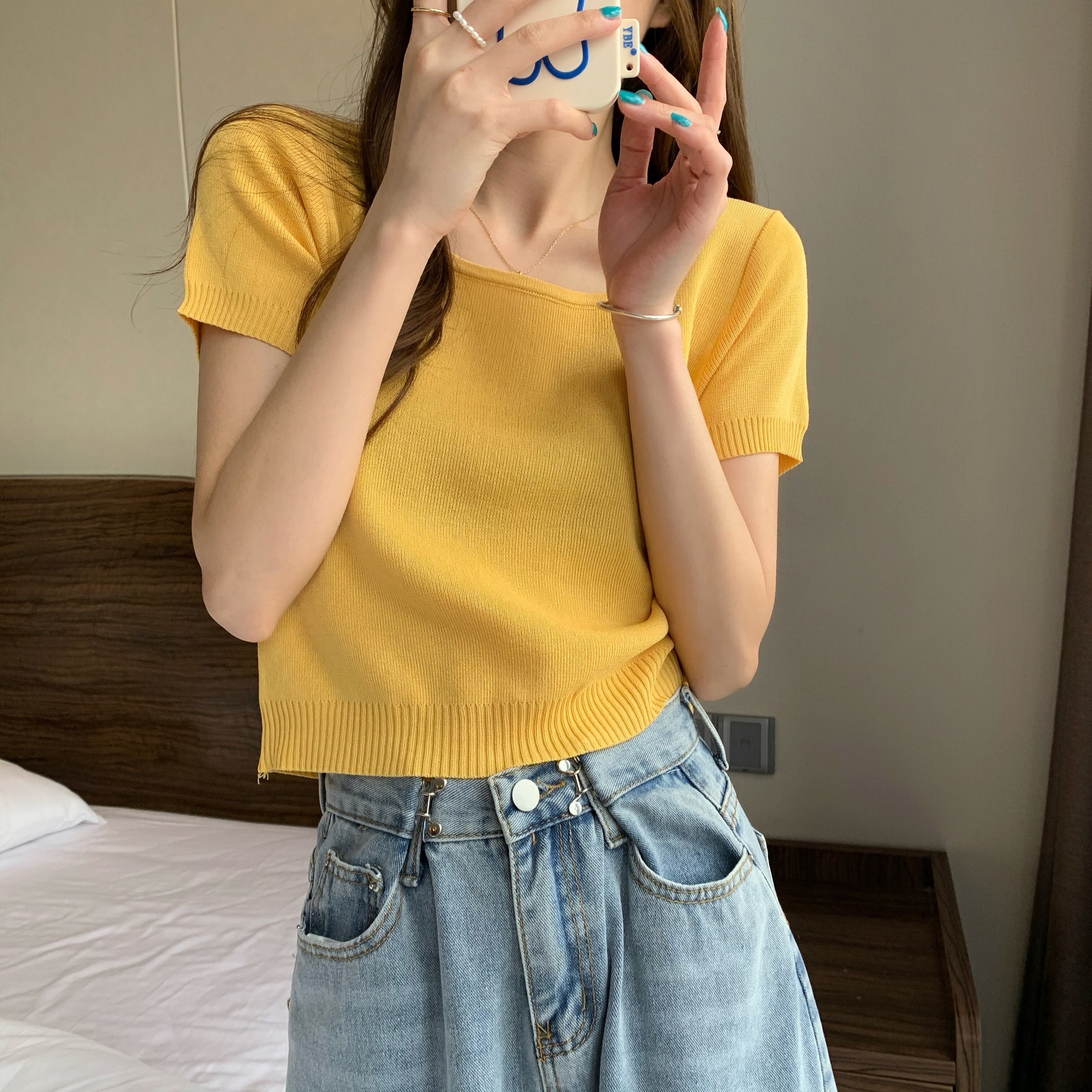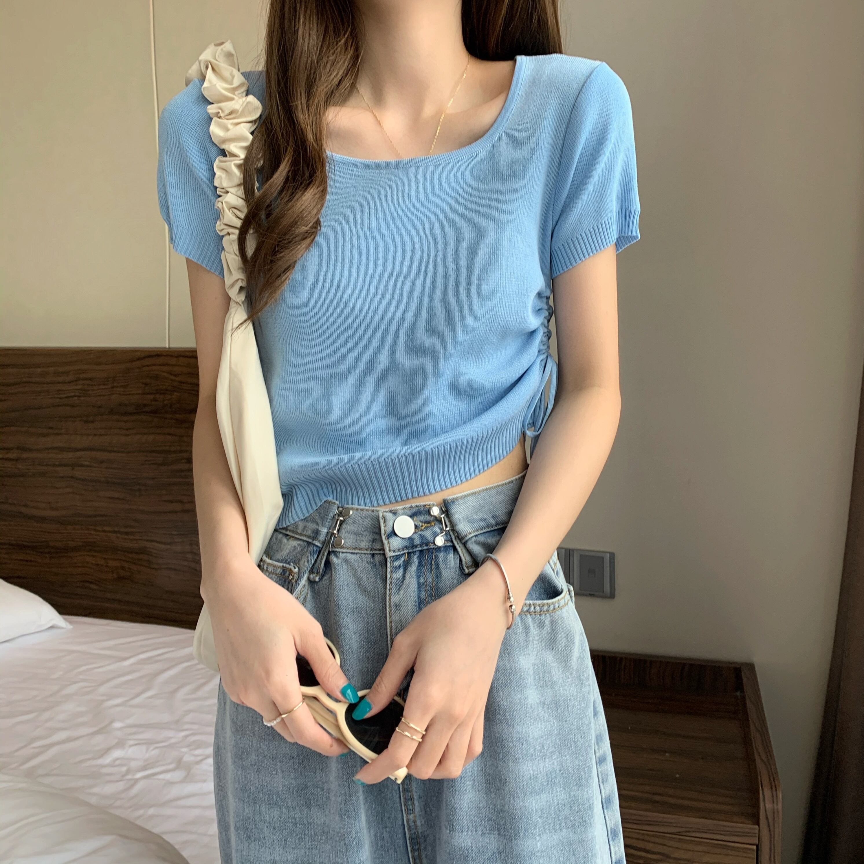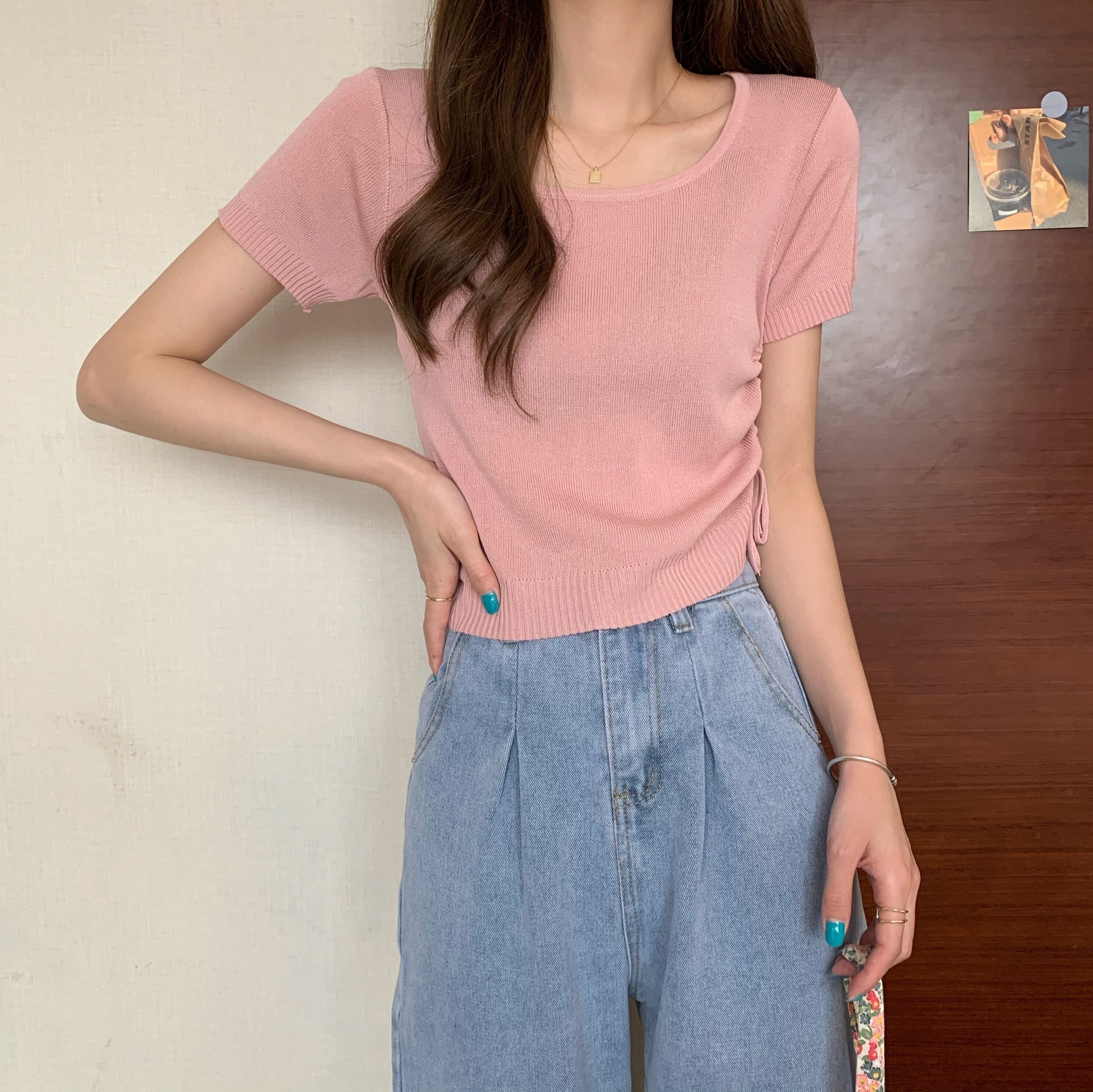 カラープルオーバー サイドギャザーニットTシャツ サマートップス 夏物 スクウェア YY-ファッション48117015985
