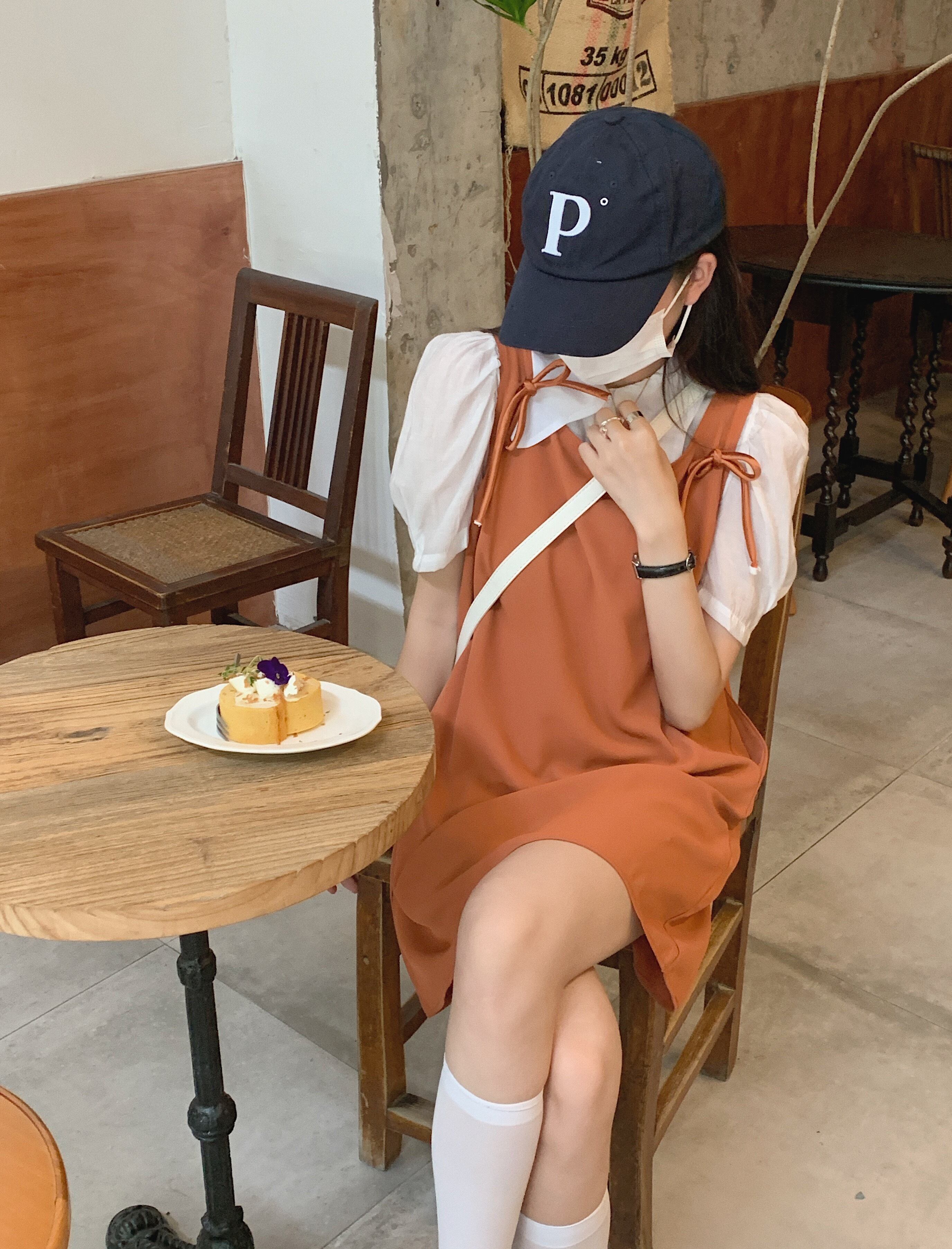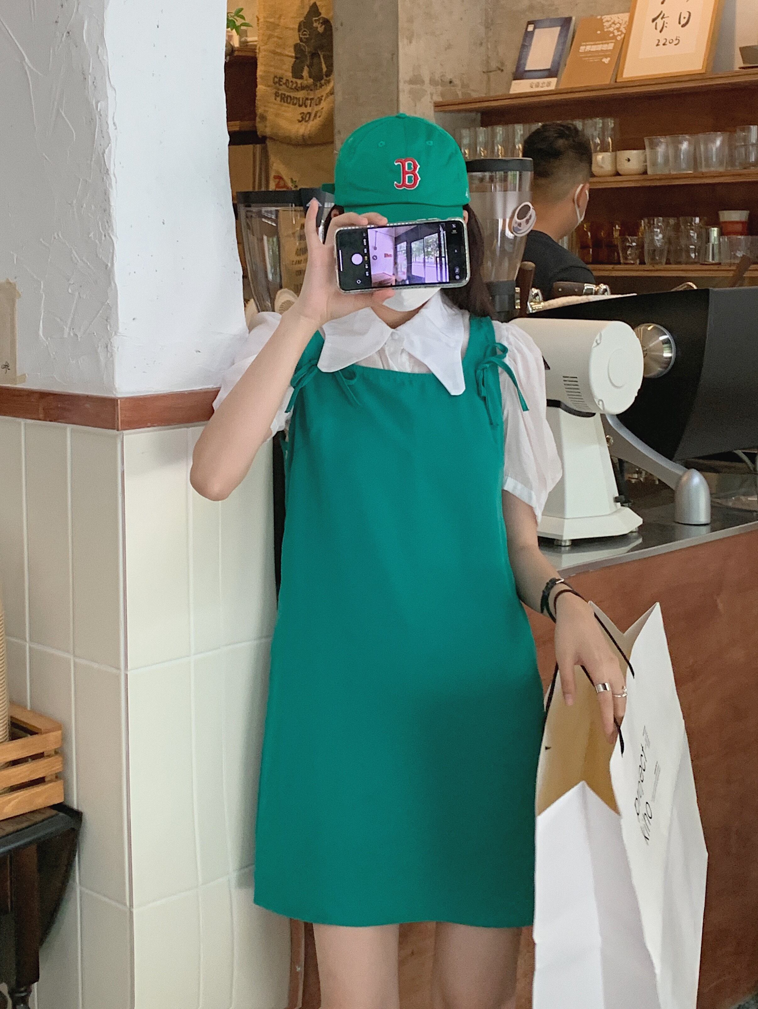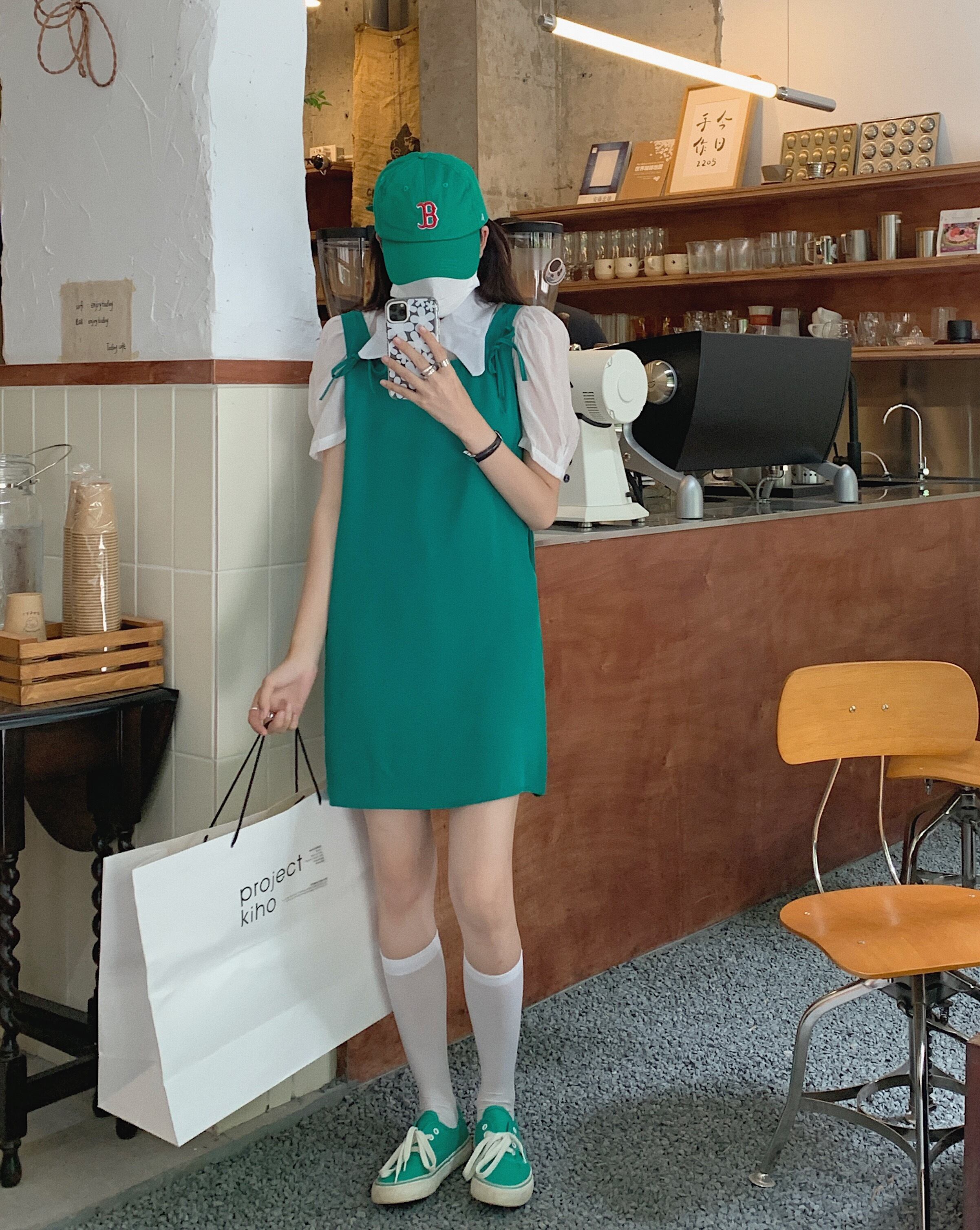 色:内側に白いシャツ1枚,キャラメルベストドレスワンピース,ターコイズグリーンのベストスカートワンピース