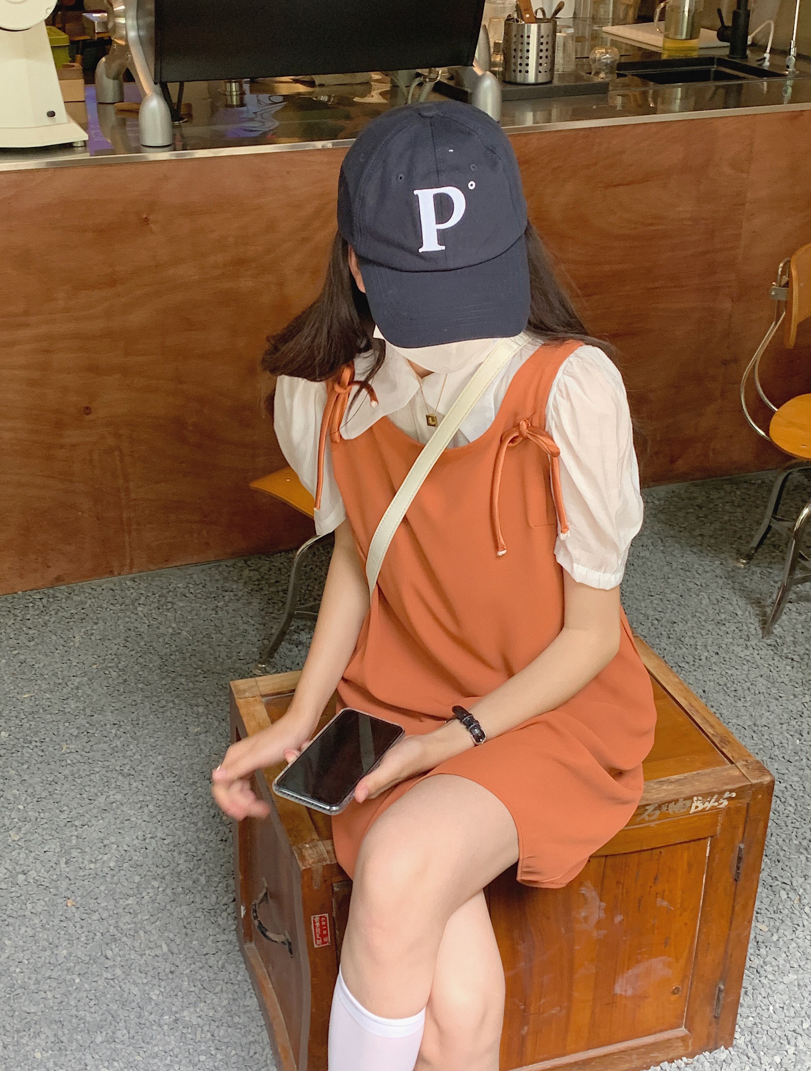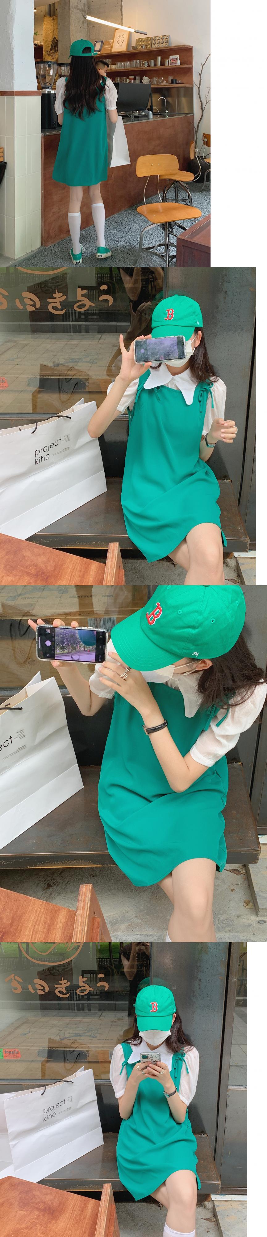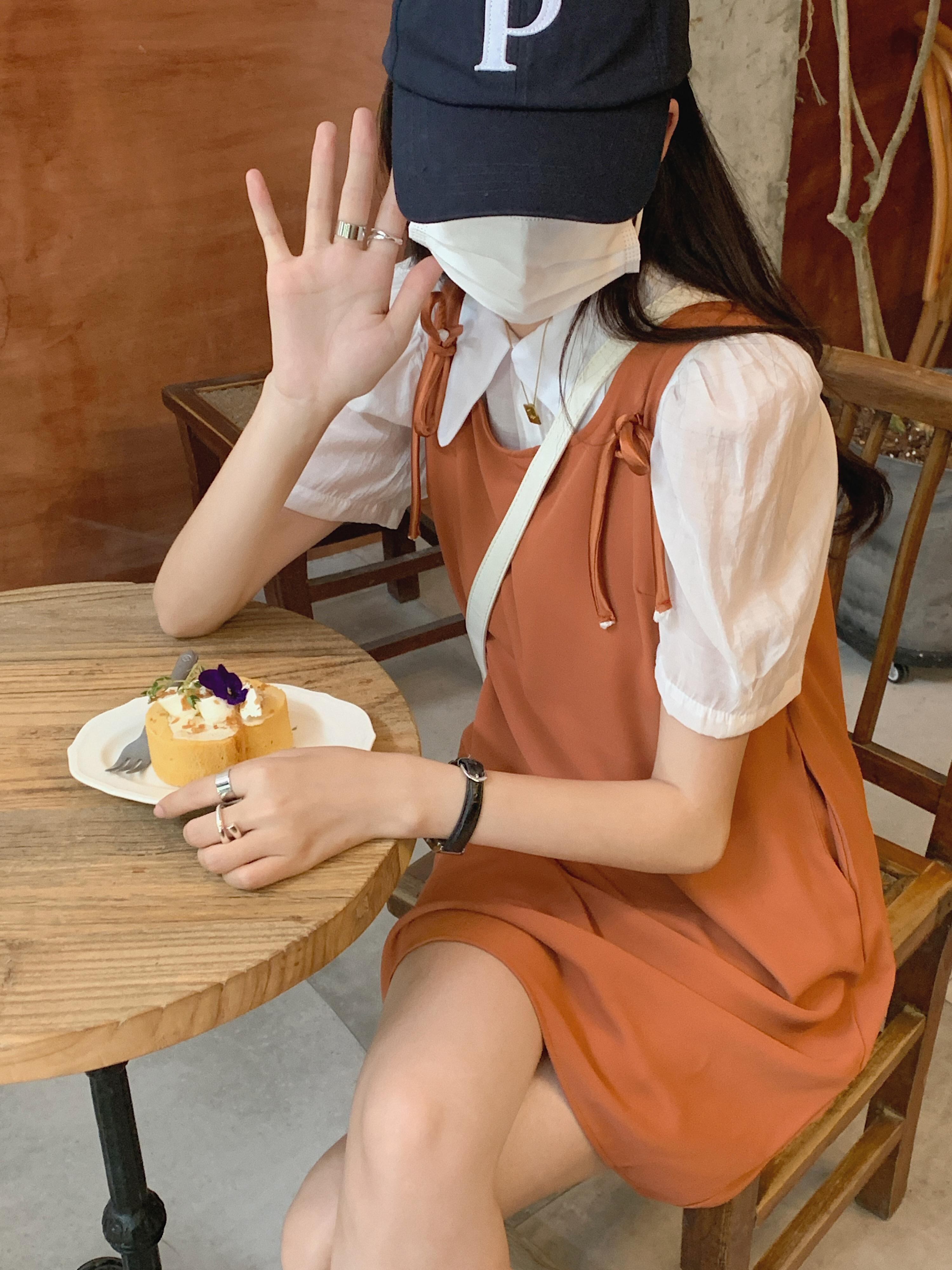 色:内側に白いシャツ1枚,キャラメルベストドレスワンピース,ターコイズグリーンのベストスカートワンピース