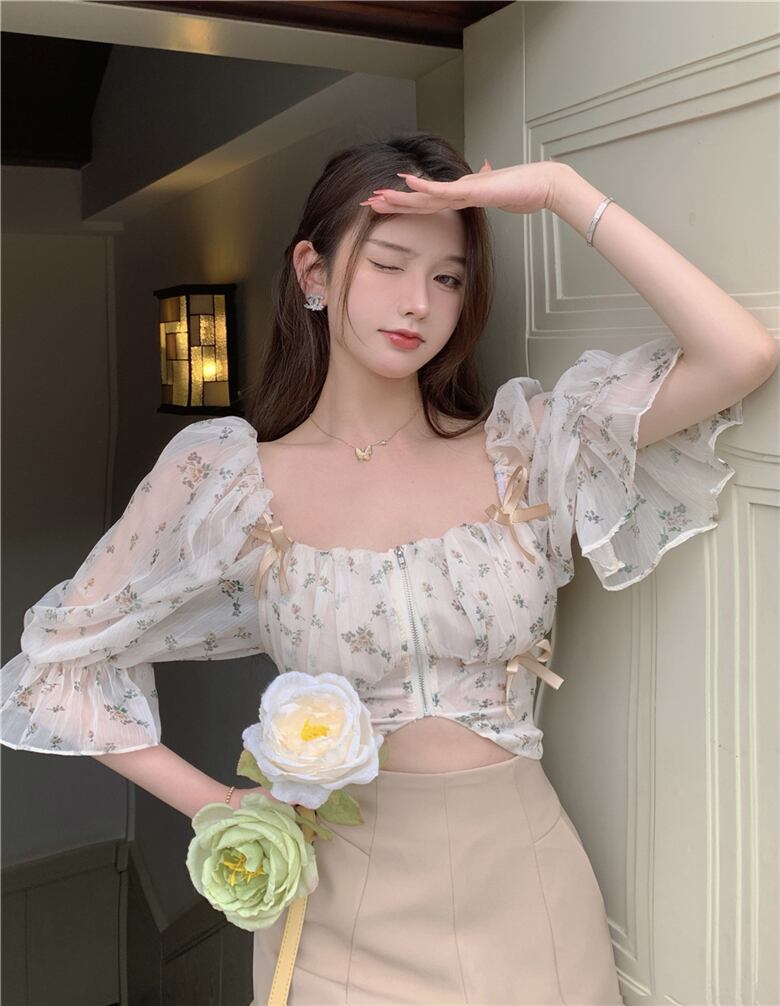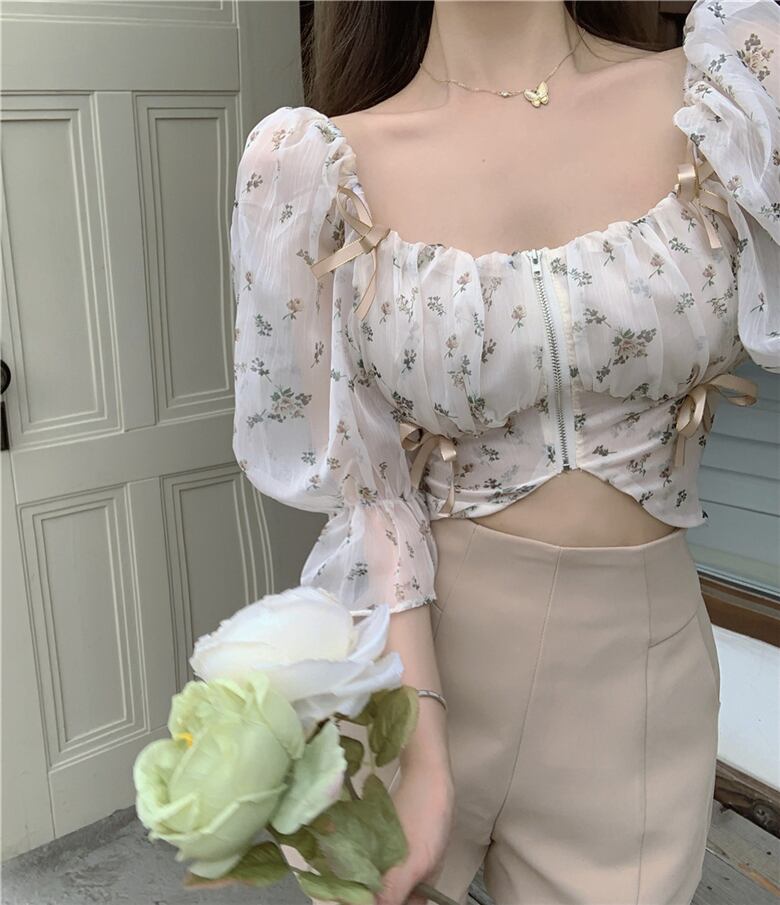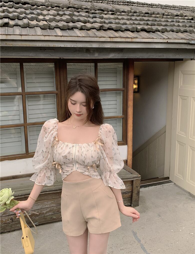 サマースタイルスリーブ薄手フローラルウェストシフォンシャツ ハイウェストショーツ レディース 大人ガーリー スウィート キュート カジュアル 夏物 ブルマー 花柄 YY-ファッション1765277095