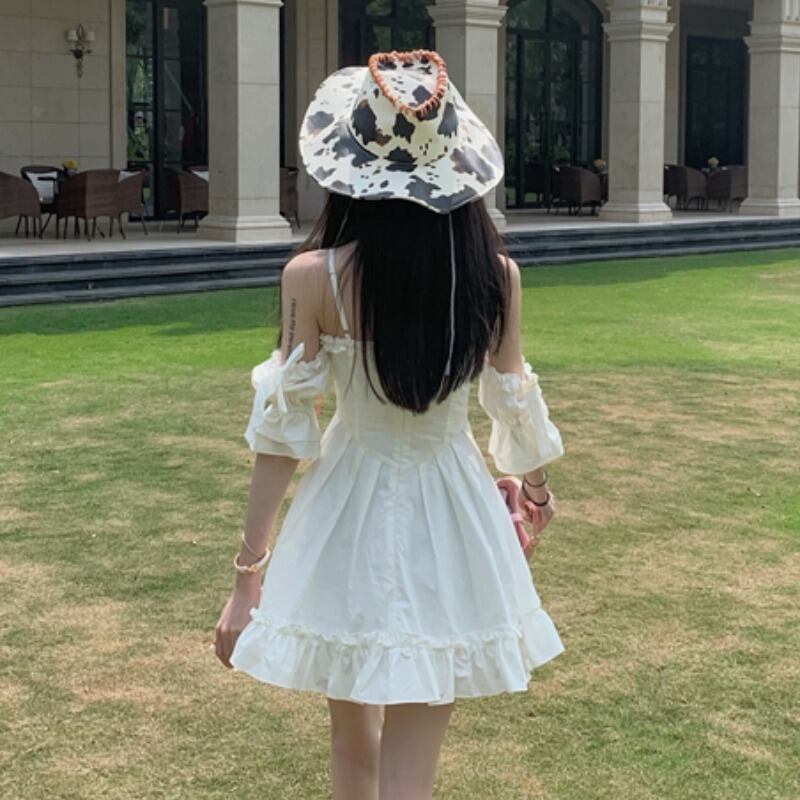 ドレス サマーホワイトAラインスカート ウェストスリムショート リボン 夏物 YY-ファッション4182247927