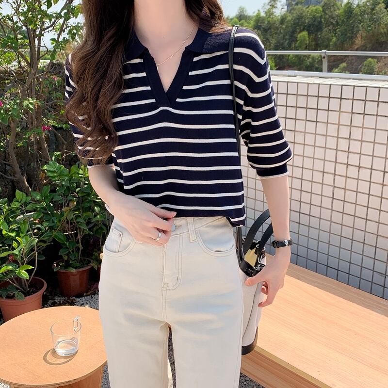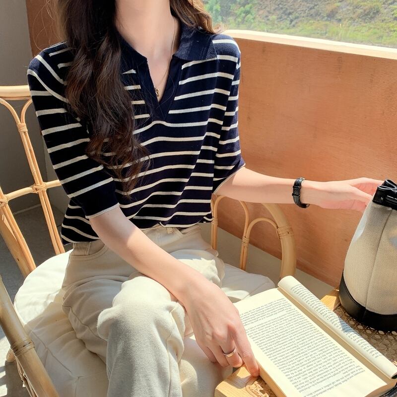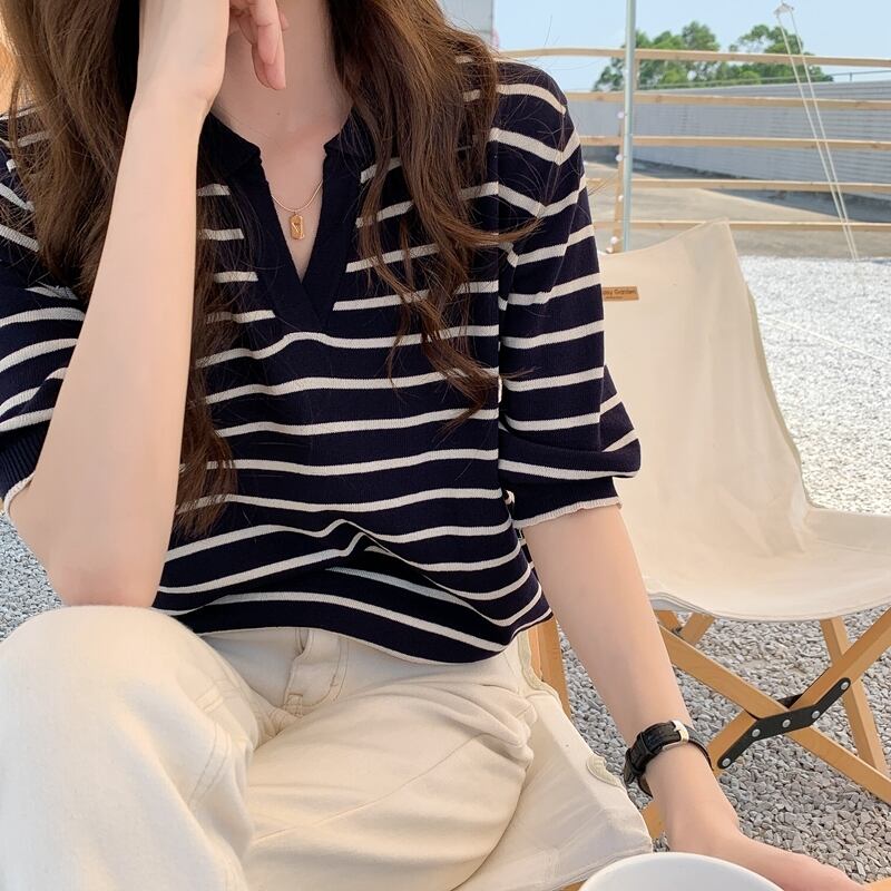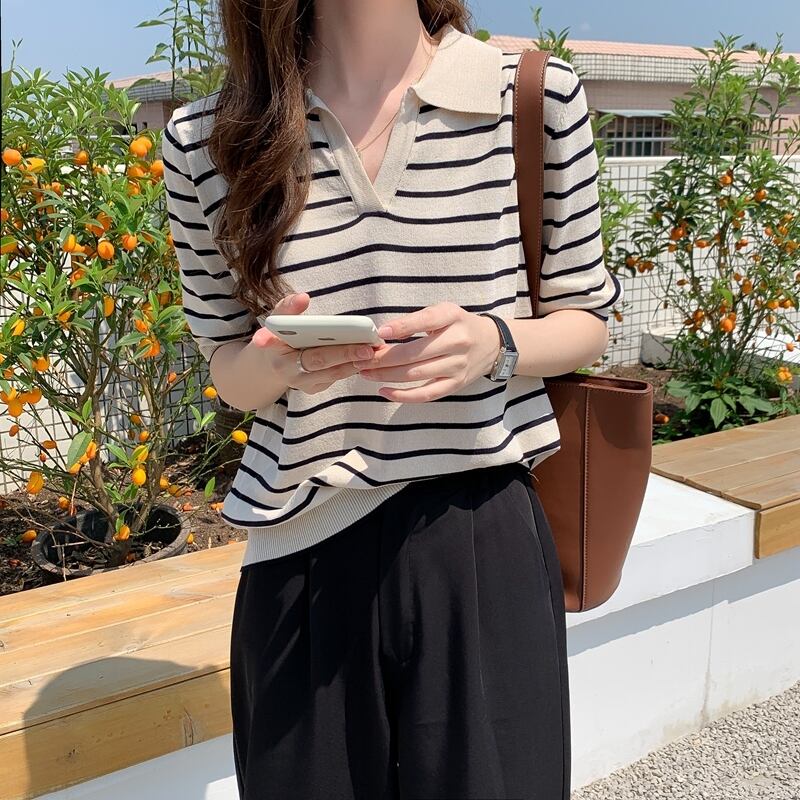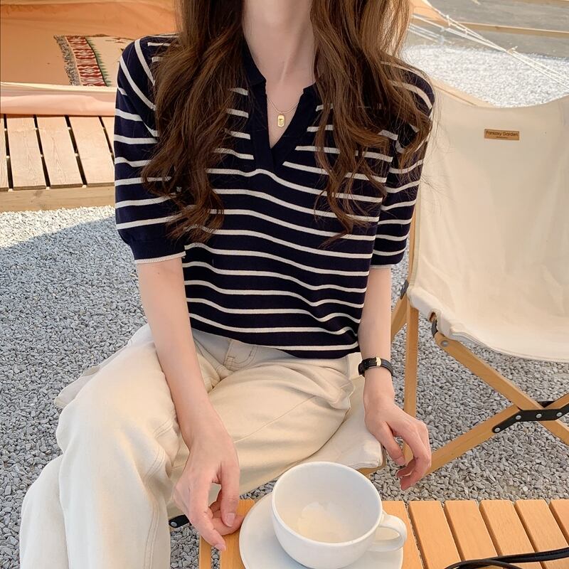 ルーズ薄手スタンダードカラーセーター サマースタイルカジュアルストライプトップス レトロ 夏物 YY-ファッション70701891760
