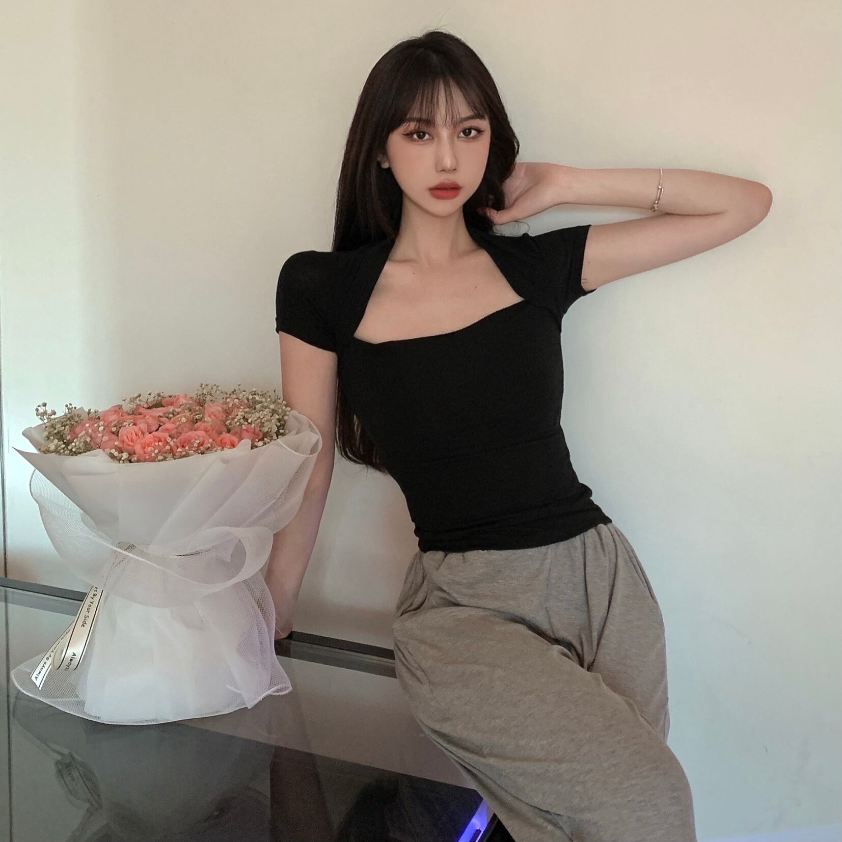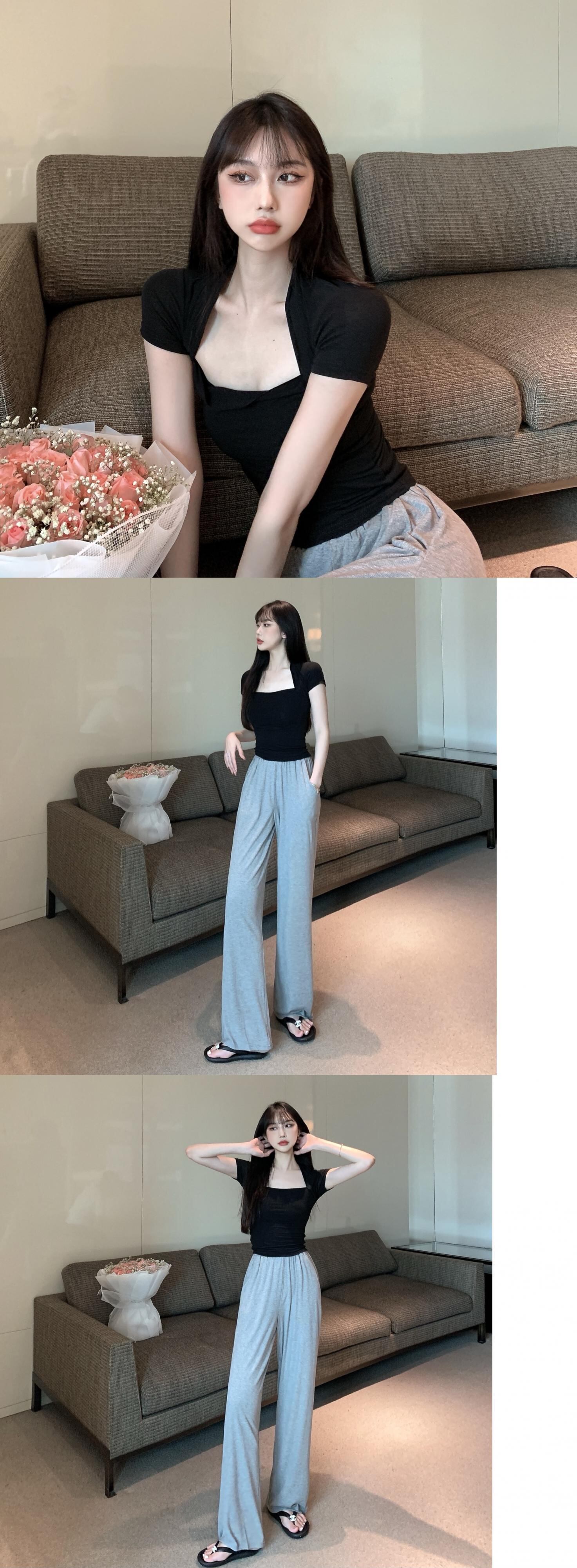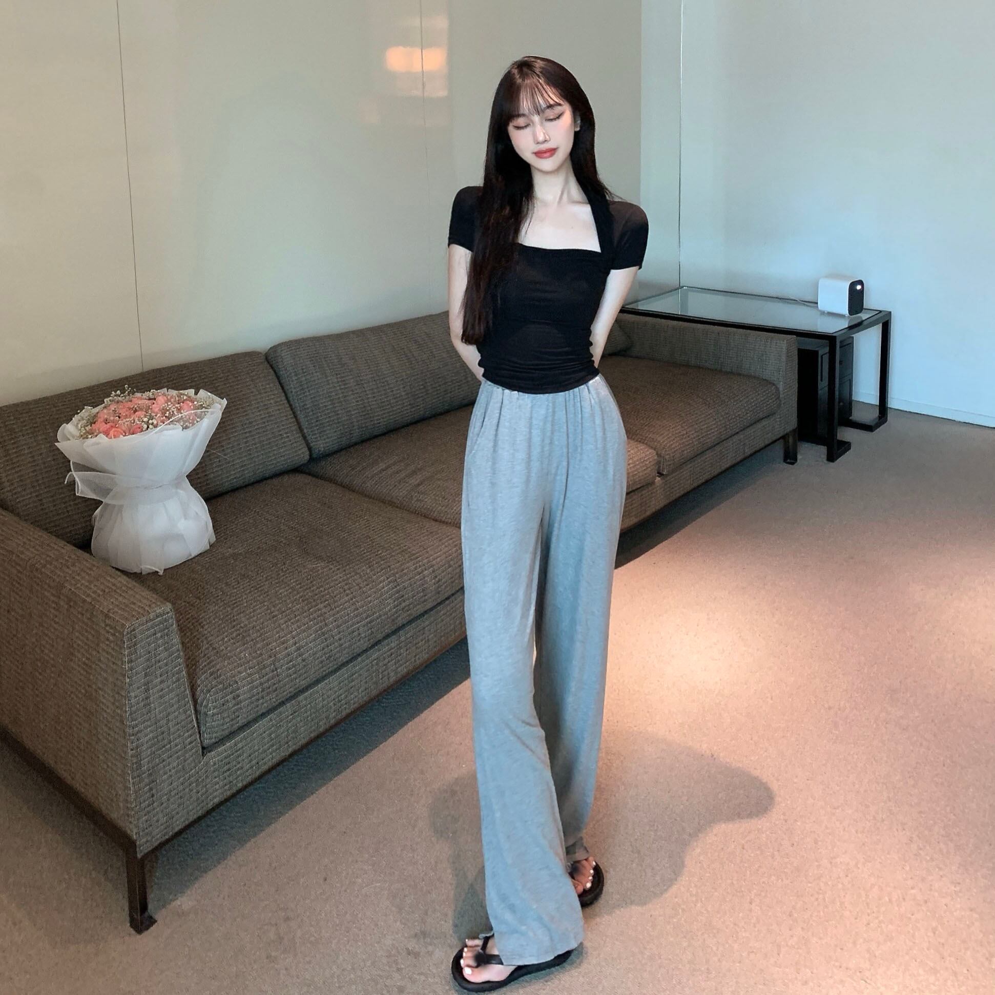 サマーカラースタンダードスリムフィット半袖スリーブグレーウェストパンツ レディース ショート レトロ ハーフスリーブ 夏物 スクウェア YY-ファッション47527618224