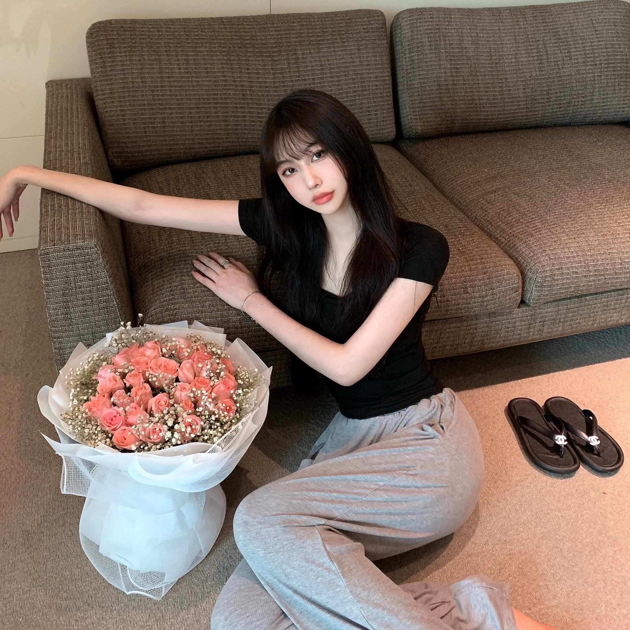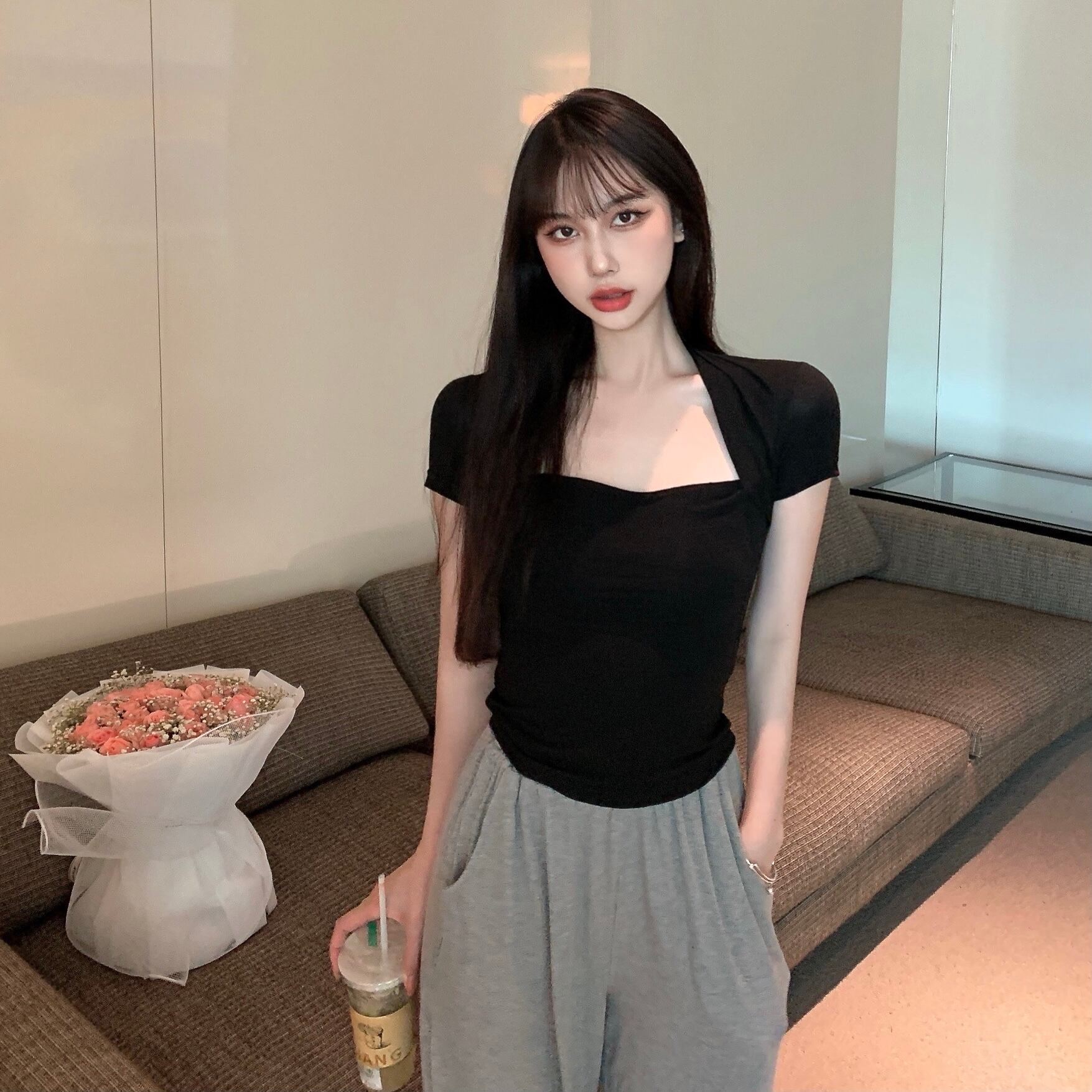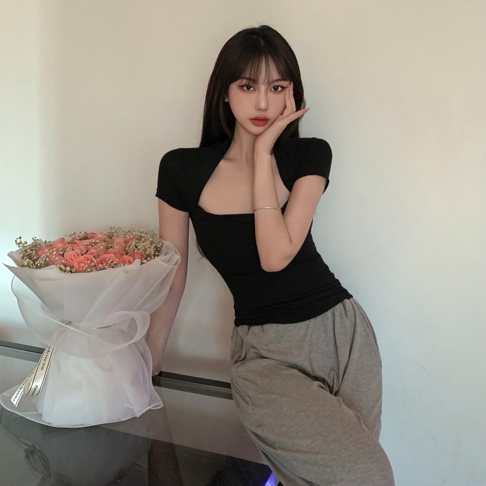 サマーカラースタンダードスリムフィット半袖スリーブグレーウェストパンツ レディース ショート レトロ ハーフスリーブ 夏物 スクウェア YY-ファッション47527618224