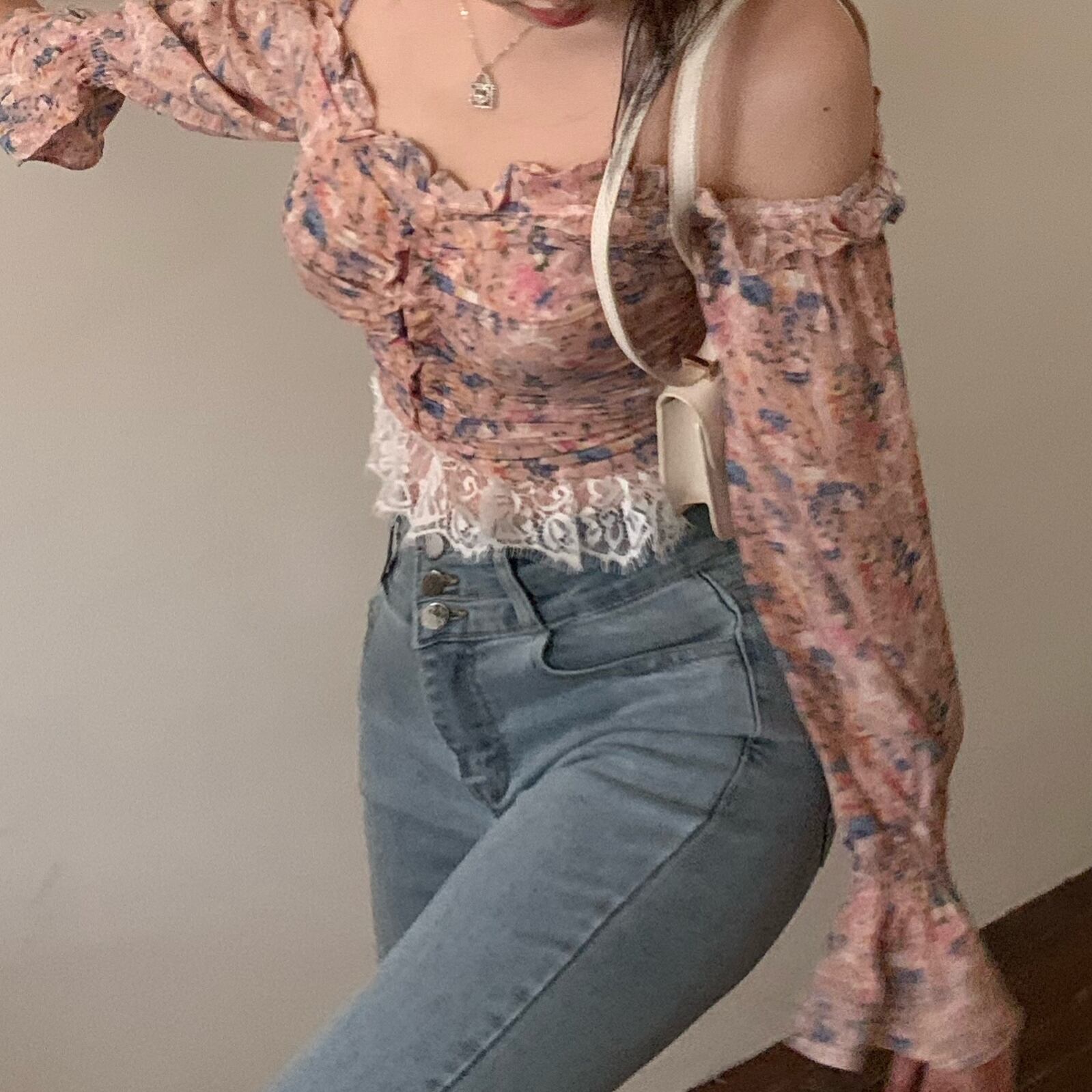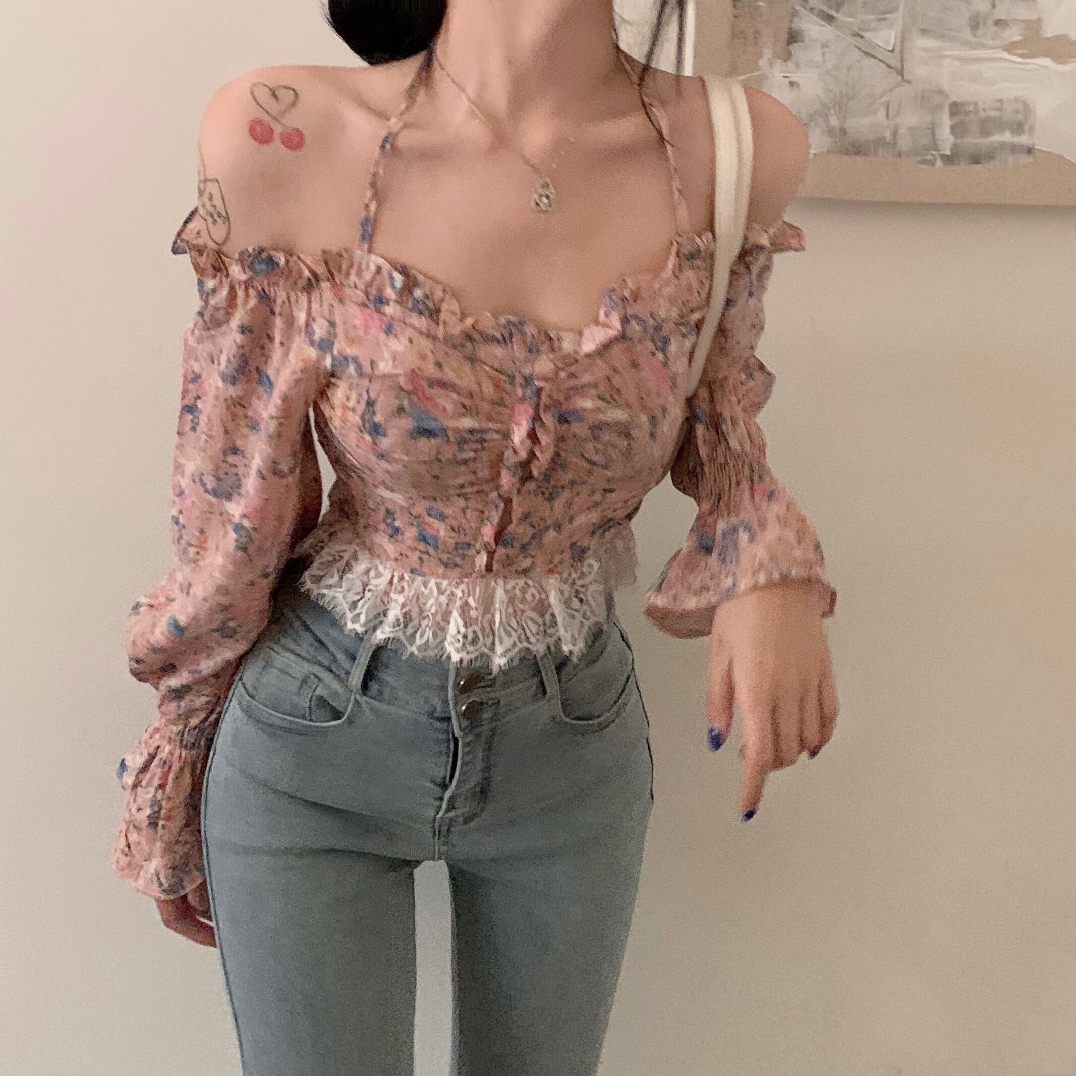 フローラルシフォンシャツ サマースタイルウェストレースブラウス レディース 夏物 花柄 YY-ファッション31865822285