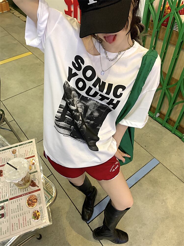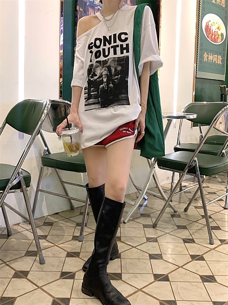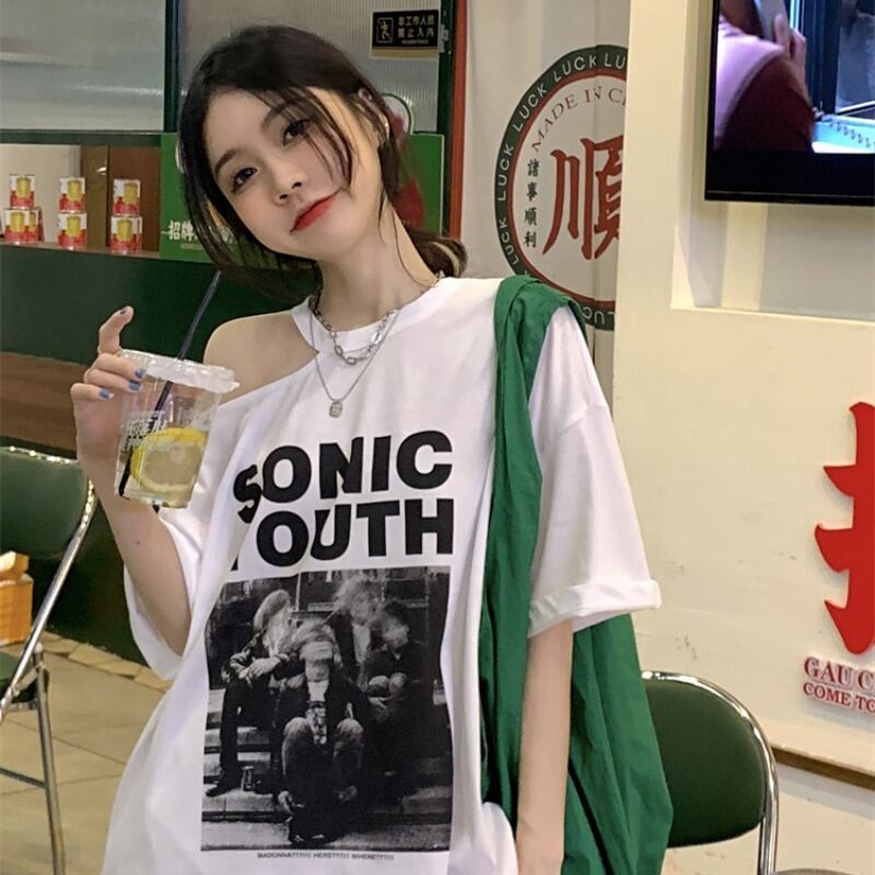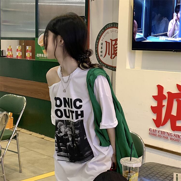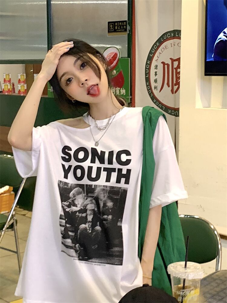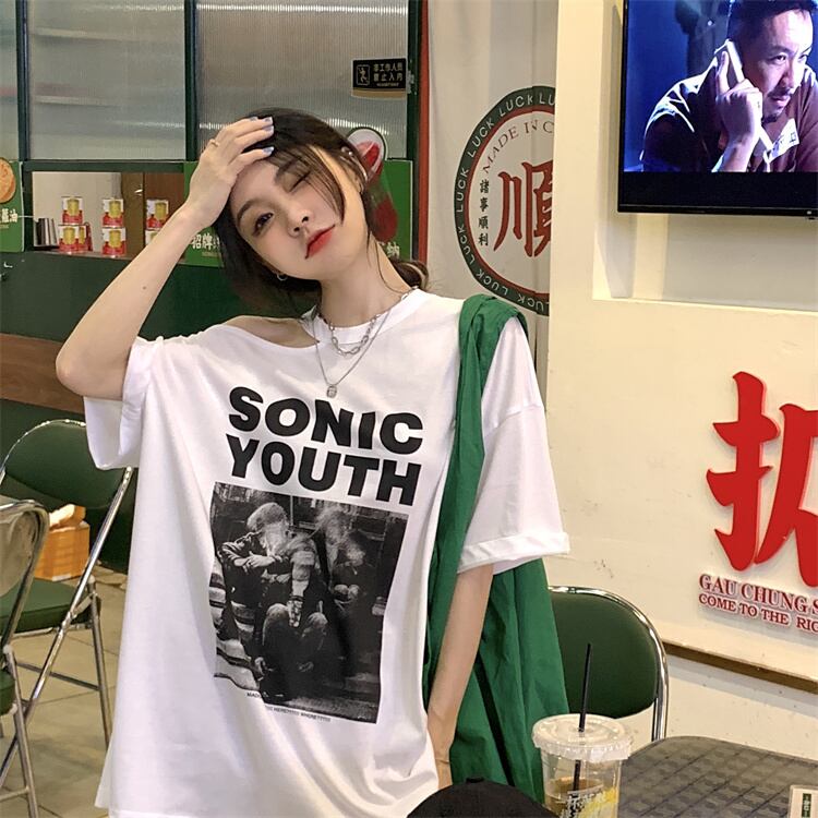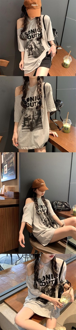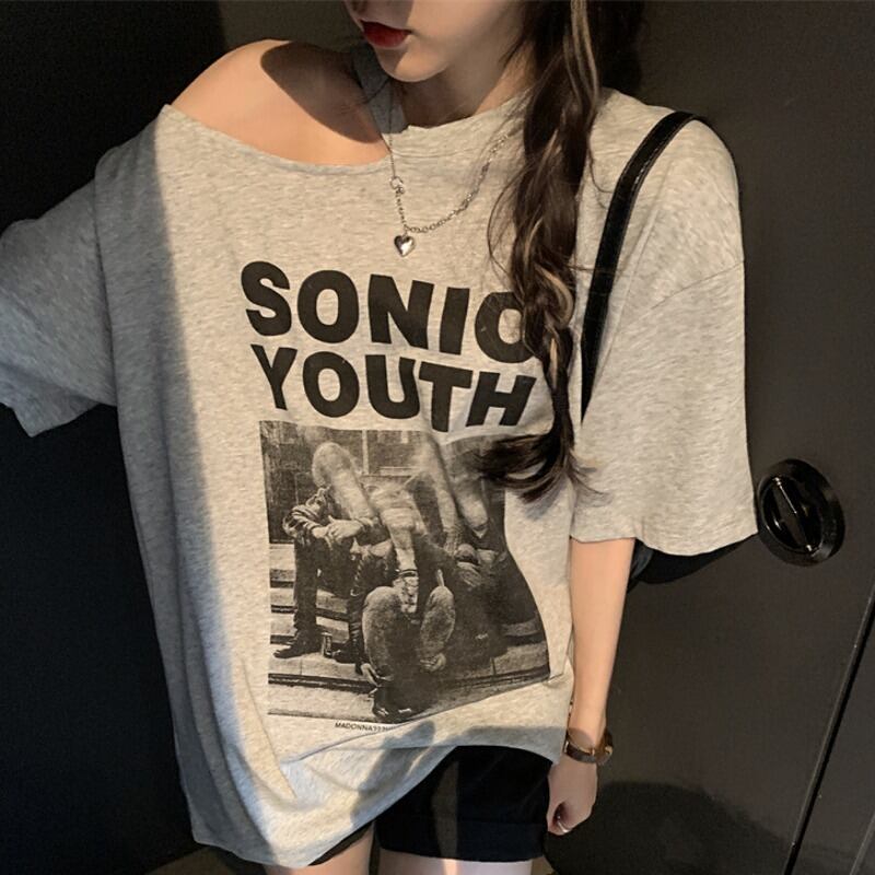 スタンダードストラップレスTシャツ レディースサマー薄手カジュアルルーズグレートップス レトロ 夏物 ヨーロピアン YY-ファッション47964132027