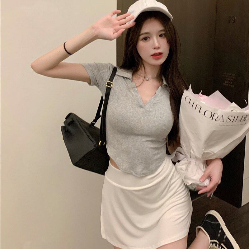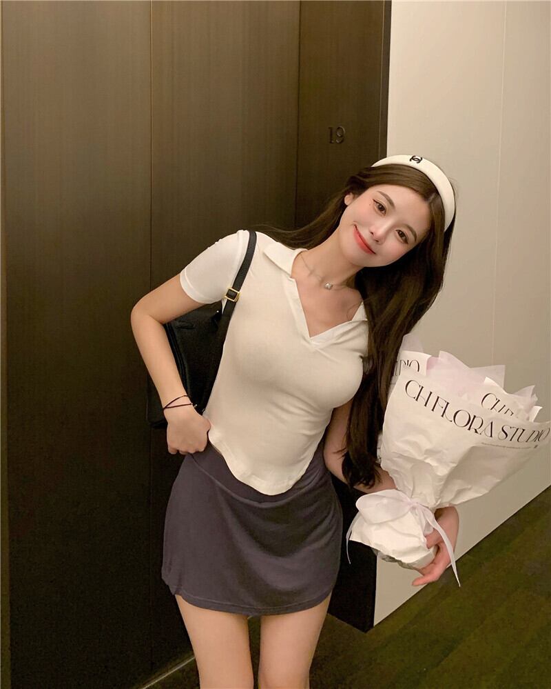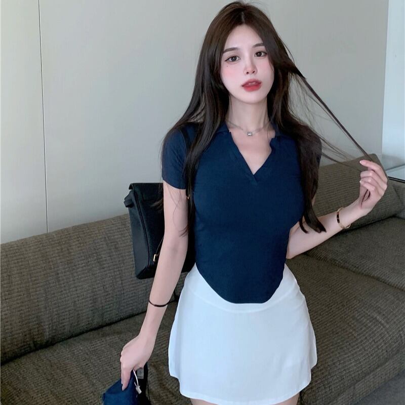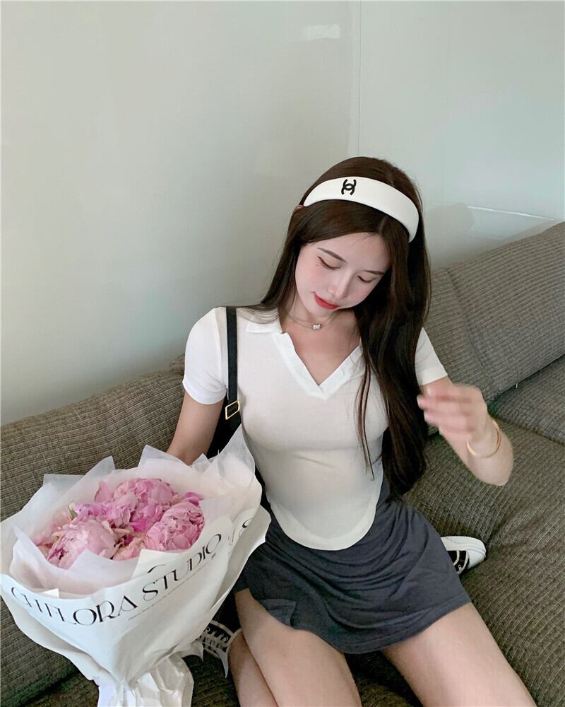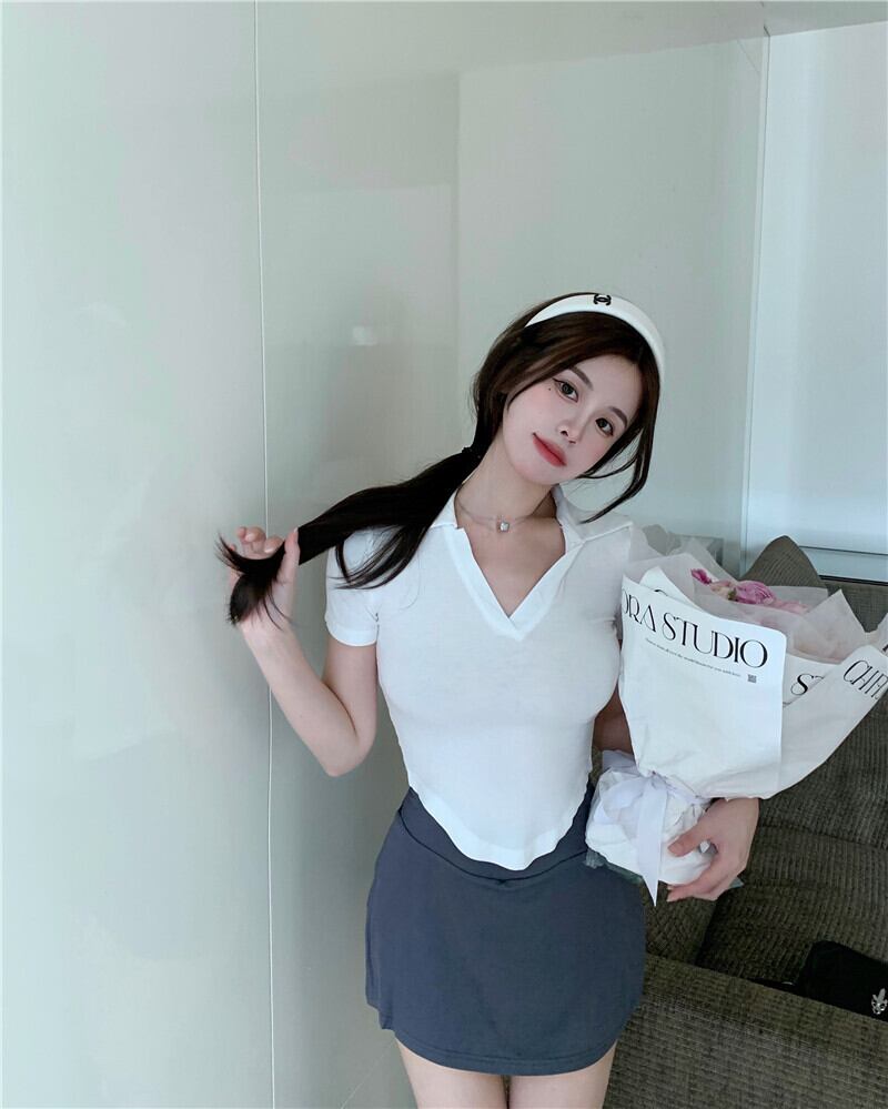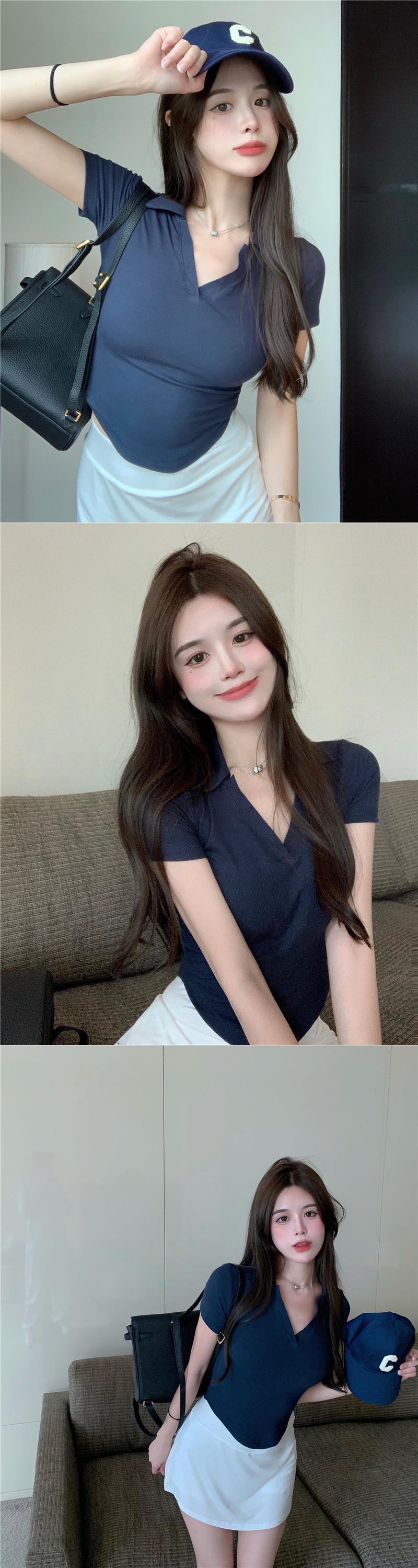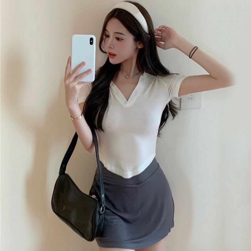 Vネックスリムショートトップス スタイルスプリングサマーホワイト薄手シャツ Tシャツ 春物 夏物 YY-ファッション69546739183