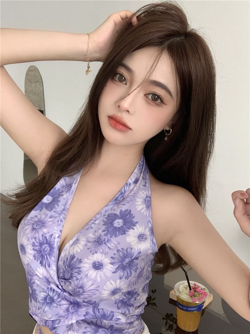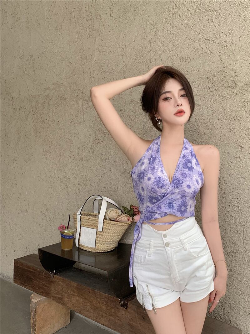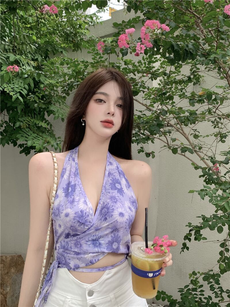 フローラルサマーショートストラップ バックホルタートップス 夏物 花柄 ピュア パープル YY-ファッション60857167228