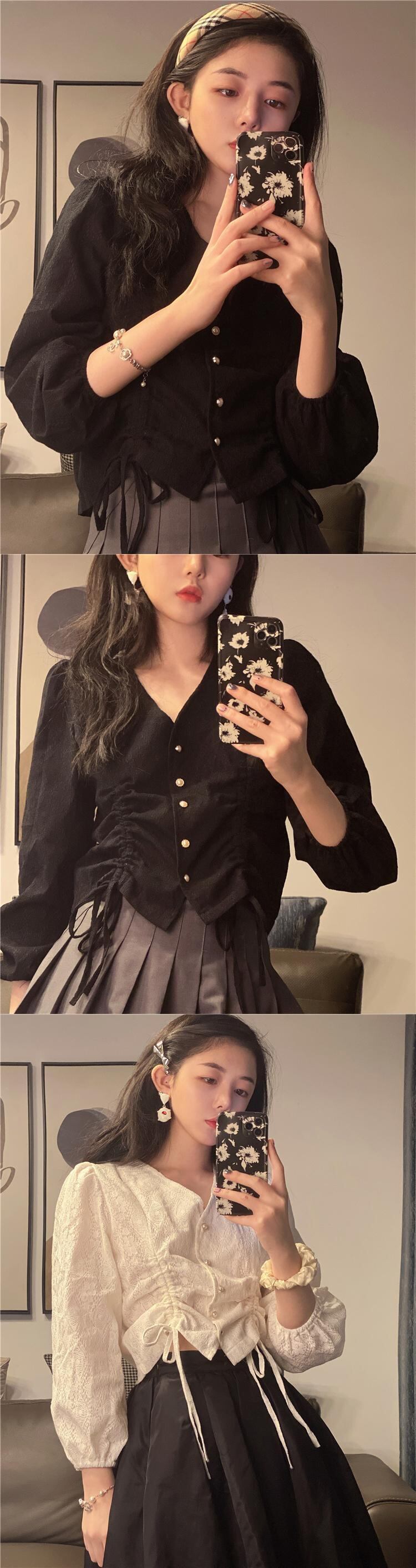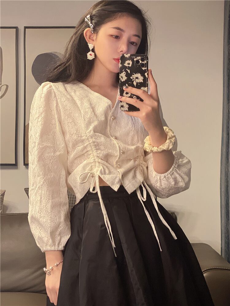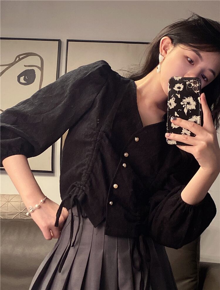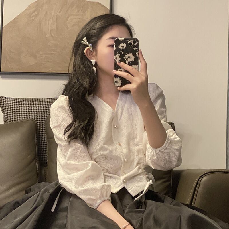 ショートVネックブラウス スプリングサマー薄手ギャザースタイルシャツ 大人ガーリー スウィート キュート カジュアル 春物 夏物 YY-ファッション5660230962