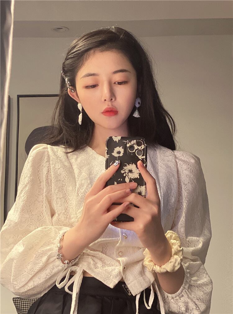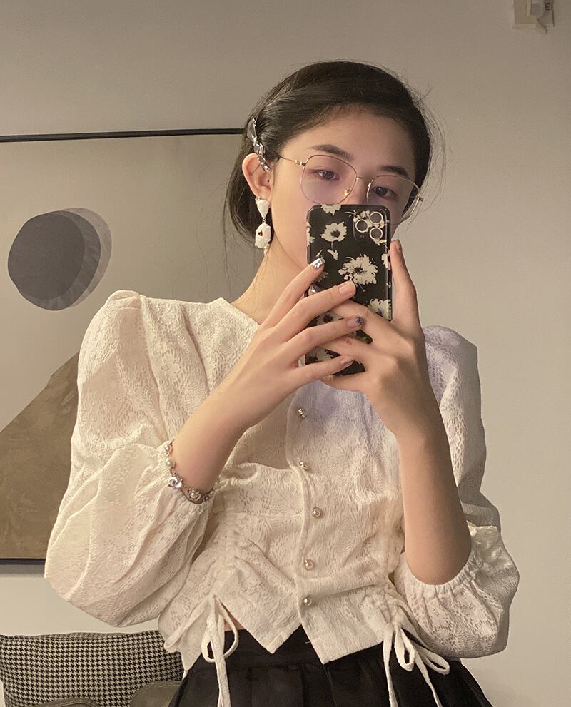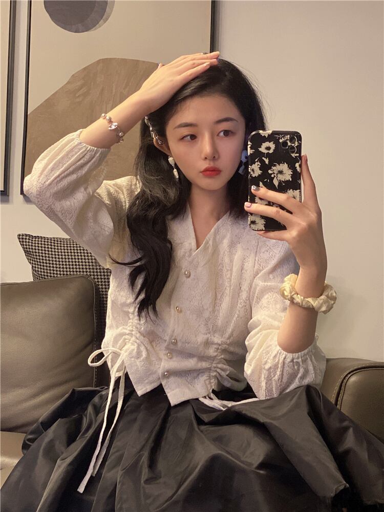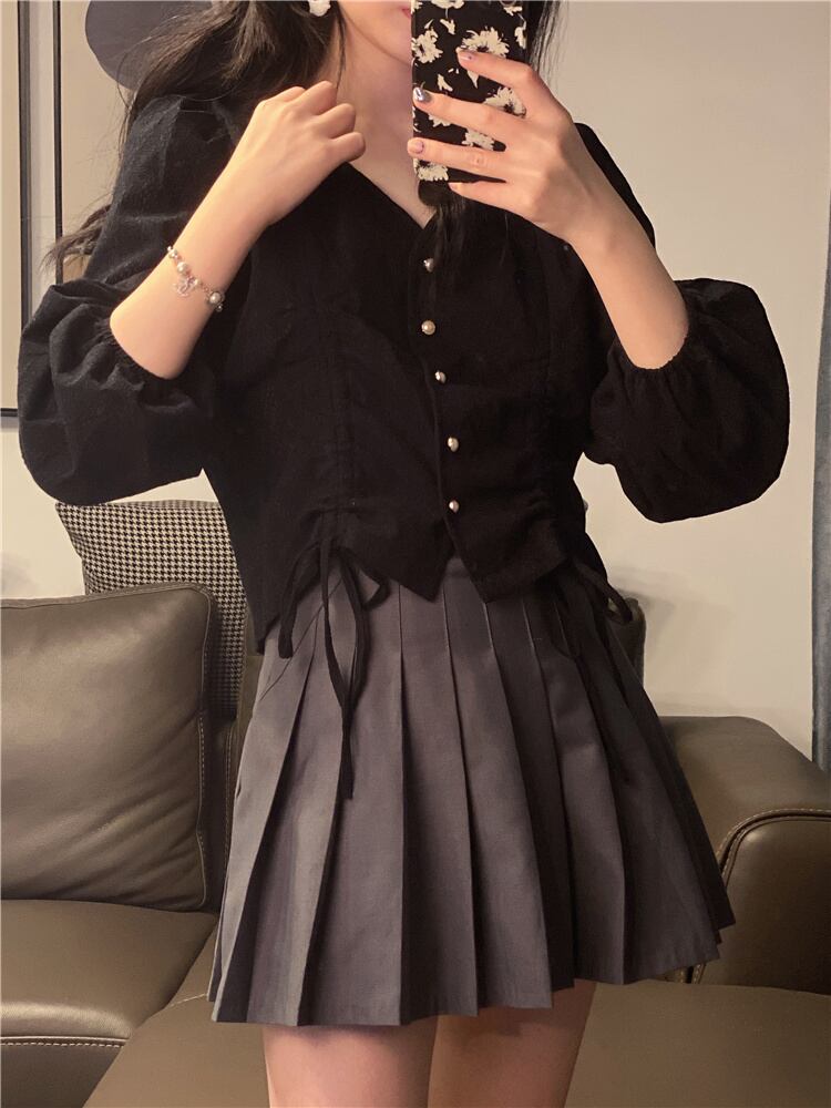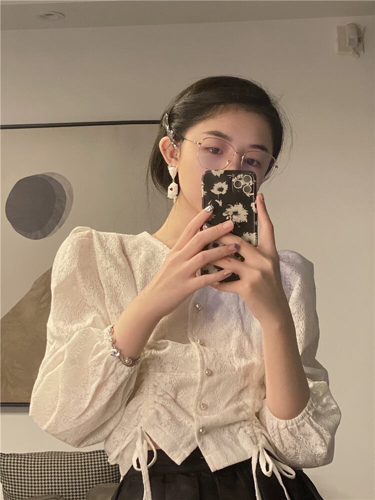 ショートVネックブラウス スプリングサマー薄手ギャザースタイルシャツ 大人ガーリー スウィート キュート カジュアル 春物 夏物 YY-ファッション5660230962