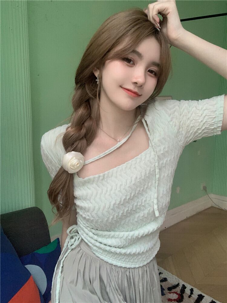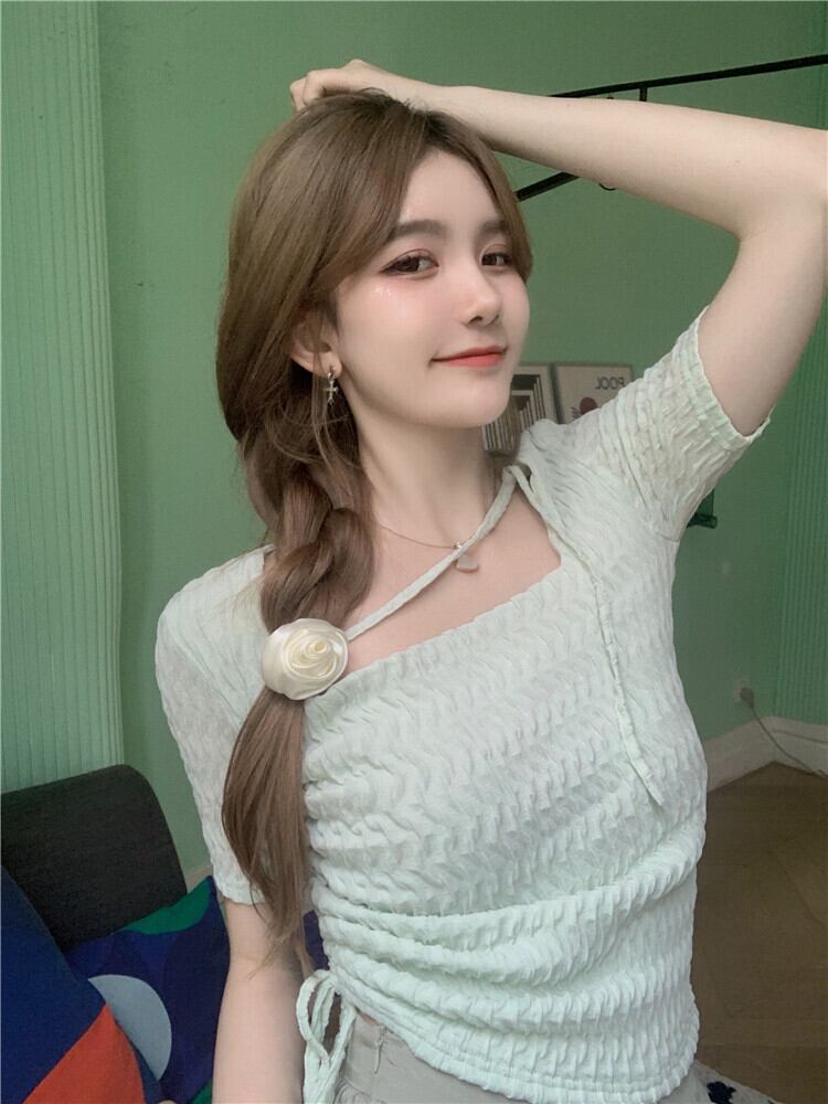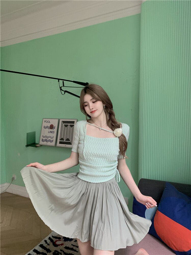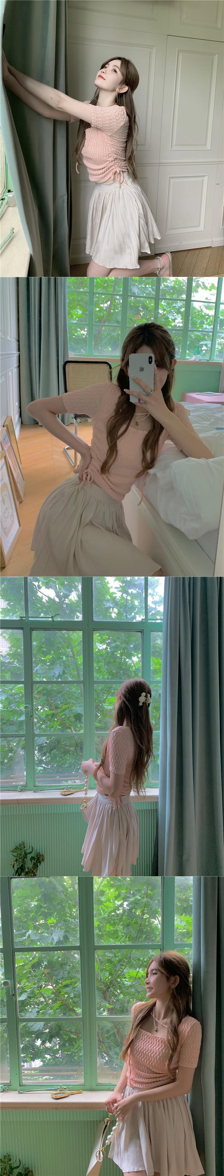 Tシャツ サマーソリッド カラーショートギャザープリーツ薄手トップス 夏物 ソリッドカラー スクウェア YY-ファッション48607608558